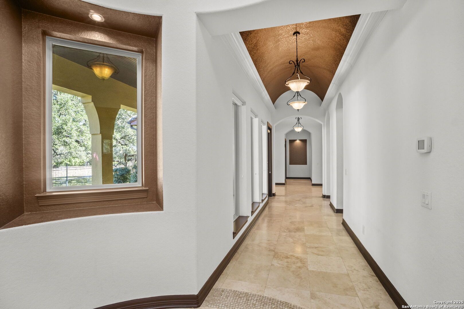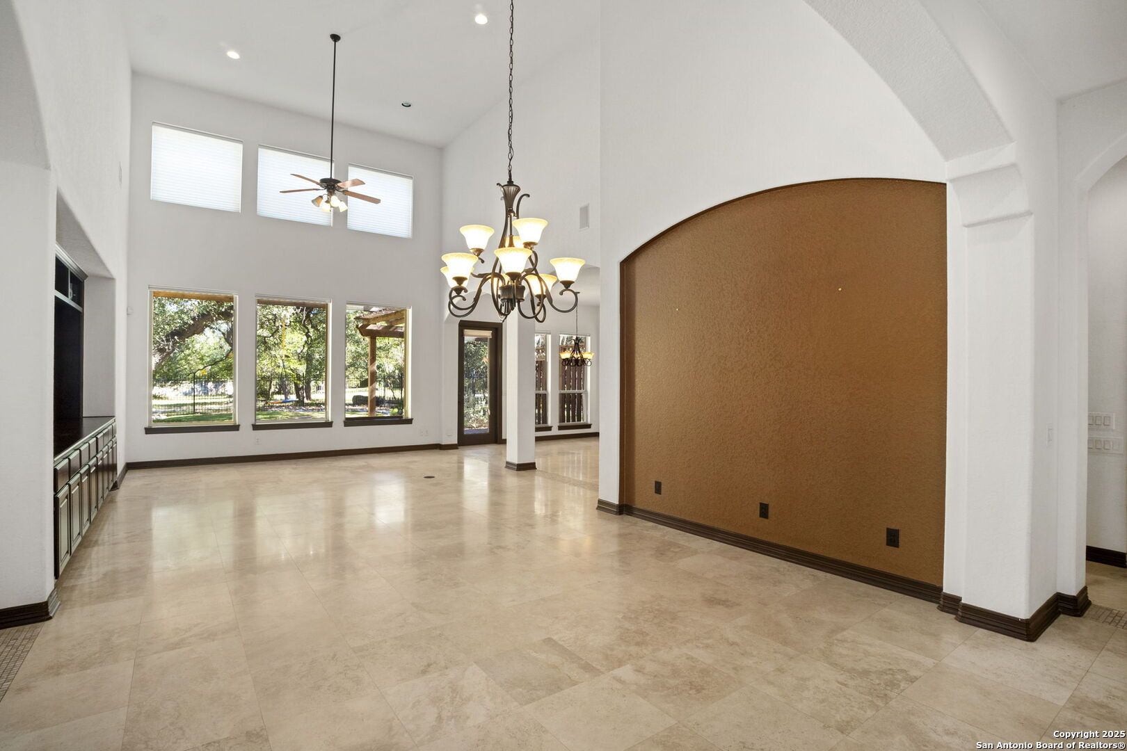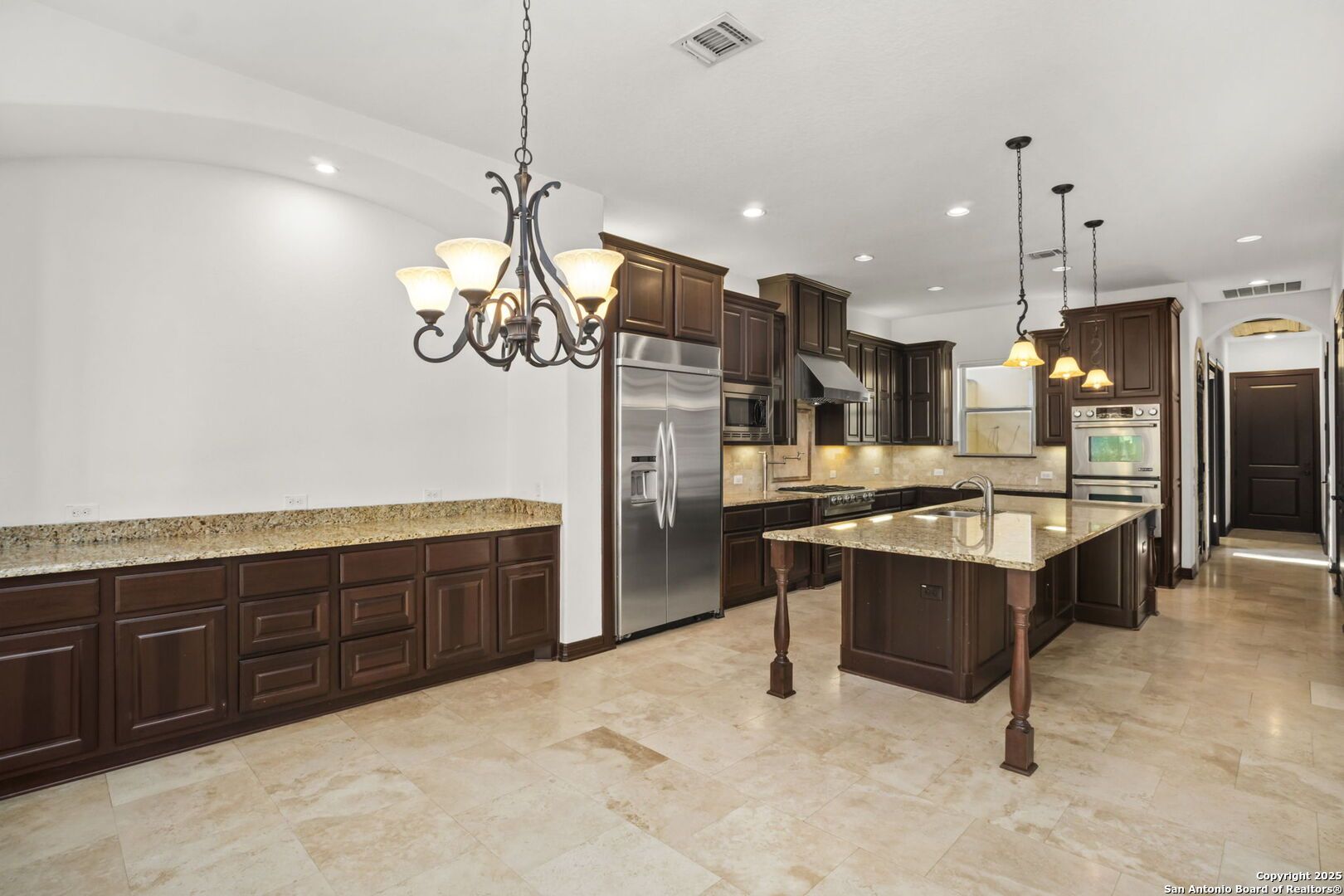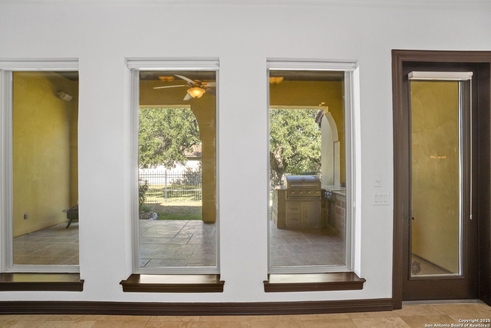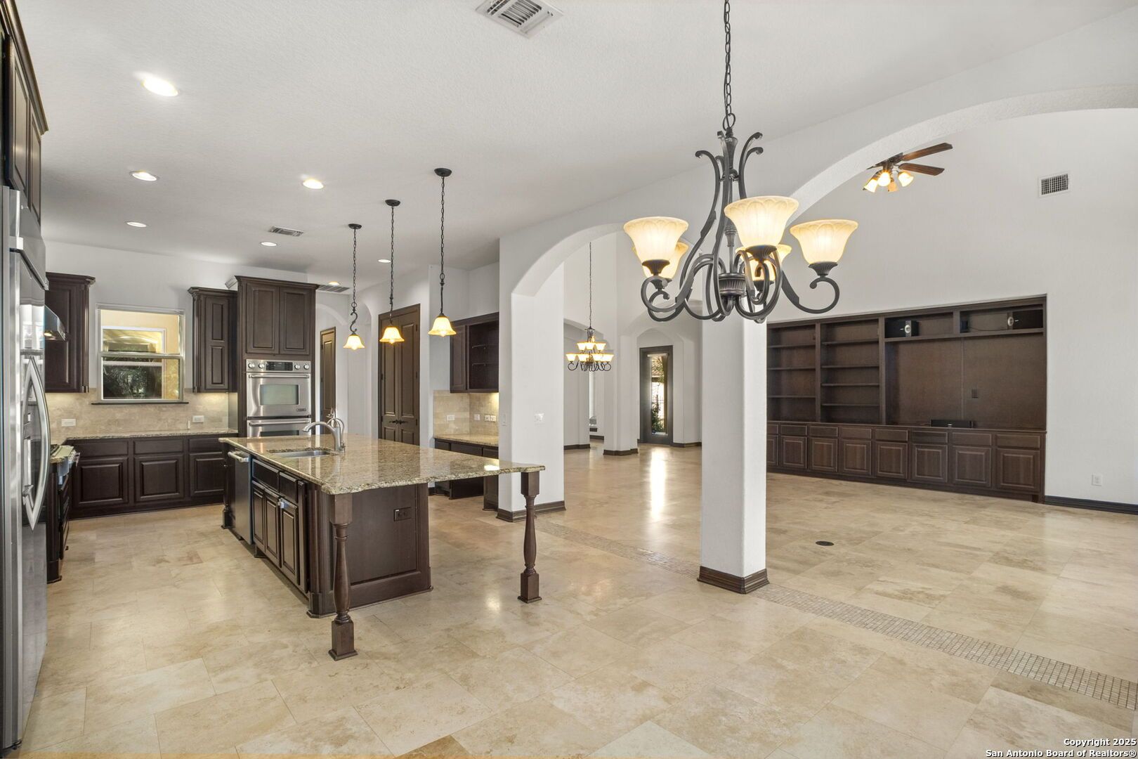 Welcome to 22426 Viajes - a stunning Sitterle-built home in the prestigious gated enclave of Campanas at Cibolo Canyons. This elegant 4-bedroom, 4-bath residence offers 3,765 square feet of refined living space, showcasing timeless craftsmanship and exceptional attention to detail throughout.From the moment you enter, a barrel-ceiling foyer sets the tone for sophistication, leading into a thoughtfully designed floor plan perfect for entertaining, relaxing, and everyday living. The home features travertine and hardwood flooring, custom built-ins, and granite countertops, with plantation shutters enhancing each bedroom.The chef's kitchen is a true centerpiece, equipped with a KitchenAid built-in refrigerator, JennAir stainless steel appliances, double ovens, gas range with pot filler, and two pantries. A large island, built-in desk, and breakfast area with buffet cabinetry create a seamless blend of style and function. The wine pantry with an ornate iron scrolled door adds a sophisticated touch.The owner's suite serves as a private retreat with wood floors, a recessed ceiling, and a spa-inspired bath featuring dual vanities, a makeup area, soaking tub, travertine shower, and two expansive walk-in closets. The split floor plan ensures privacy, with each secondary bedroom offering its own full bath. One bedroom includes custom shelving, making it an ideal home office or study. The living room impresses with its soaring ceilings, surround sound, abundant natural light, and custom built-in cabinetry. A flex room with exposed beam detailing and wood floors offers versatility-perfect for a dining area, library, bar/lounge, or home gym.Step outside to a private backyard oasis shaded by mature oak trees, featuring a sprinkler system and two covered patios, one with a built-in cooking station and granite countertops-ideal for outdoor entertaining.The HOA at Campanas provides a comprehensive, year-round landscape maintenance program included with homeownership. Services include weekly mowing, edging, weeding, trash pickup, and power-blowing of curbs and walkways during peak seasons, with bi-weekly service in winter months. All beds are weeded monthly, and shrubs and plant material (both under and over 6 feet) receive scheduled trimming throughout the year, along with bed cultivation and chemical weed treatments. Tree suckers under six feet are removed as needed. The HOA also monitors irrigation monthly, provides seasonal turf fertilization, shrub fertilization, annual color installation, and crepe myrtle pruning. Turf pre-emergent and post-emergent weed control are applied at specific intervals, and ant insecticide treatments are included through WW Pest as necessary. Front yard beds are re-mulched seasonally. Altogether, the program ensures consistent, professional landscape care without homeowners needing to manage any exterior yard work themselves.Residents of Campanas enjoy a lock-and-leave lifestyle with HOA-covered lawn care, landscaping, and home security monitoring, plus access to the Campanas Clubhouse, which offers a resort-style pool, gym, library, game room, pickleball and tennis courts, and scenic walking trails. Homeowners also enjoy privileges at the Cibolo Canyons Amenity Centers, featuring a lazy river, additional pools, fitness facilities, and social gathering spaces.Located just minutes from top-rated schools, shopping, medical centers, and the JW Marriott San Antonio Hill Country Resort & Spa-home to TPC San Antonio's two championship golf courses-this home offers luxury, comfort, and convenience in one exquisite package.Move-in ready and beautifully maintained-your Hill Country lifestyle awaits.