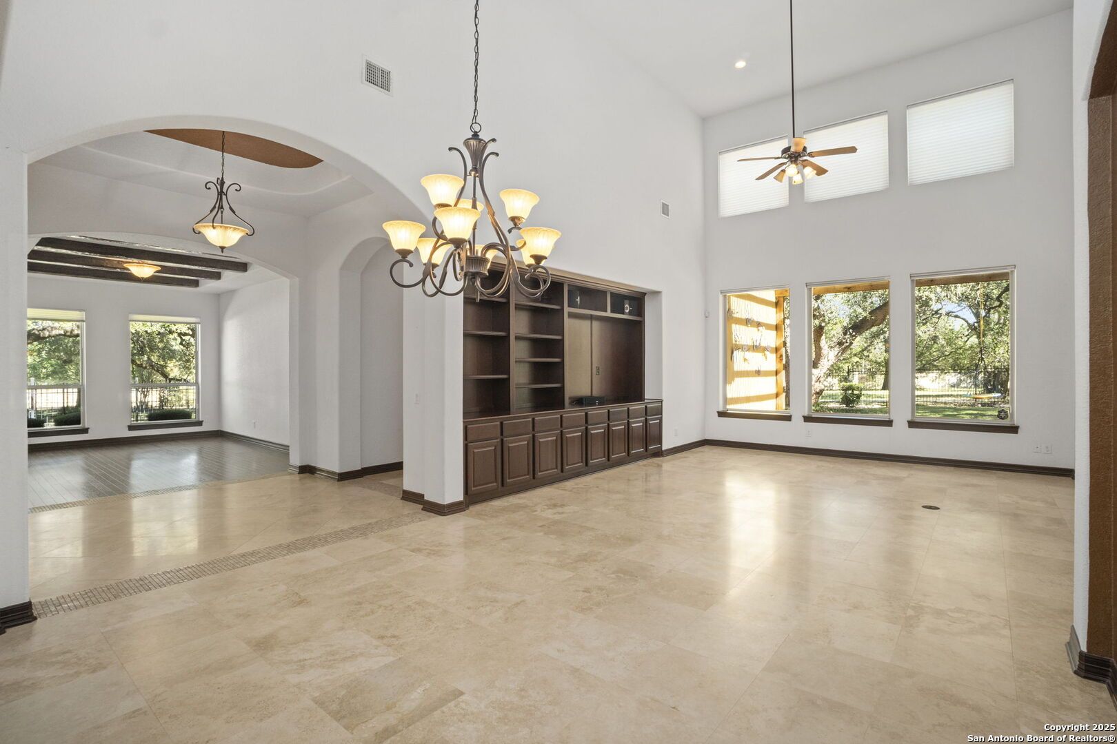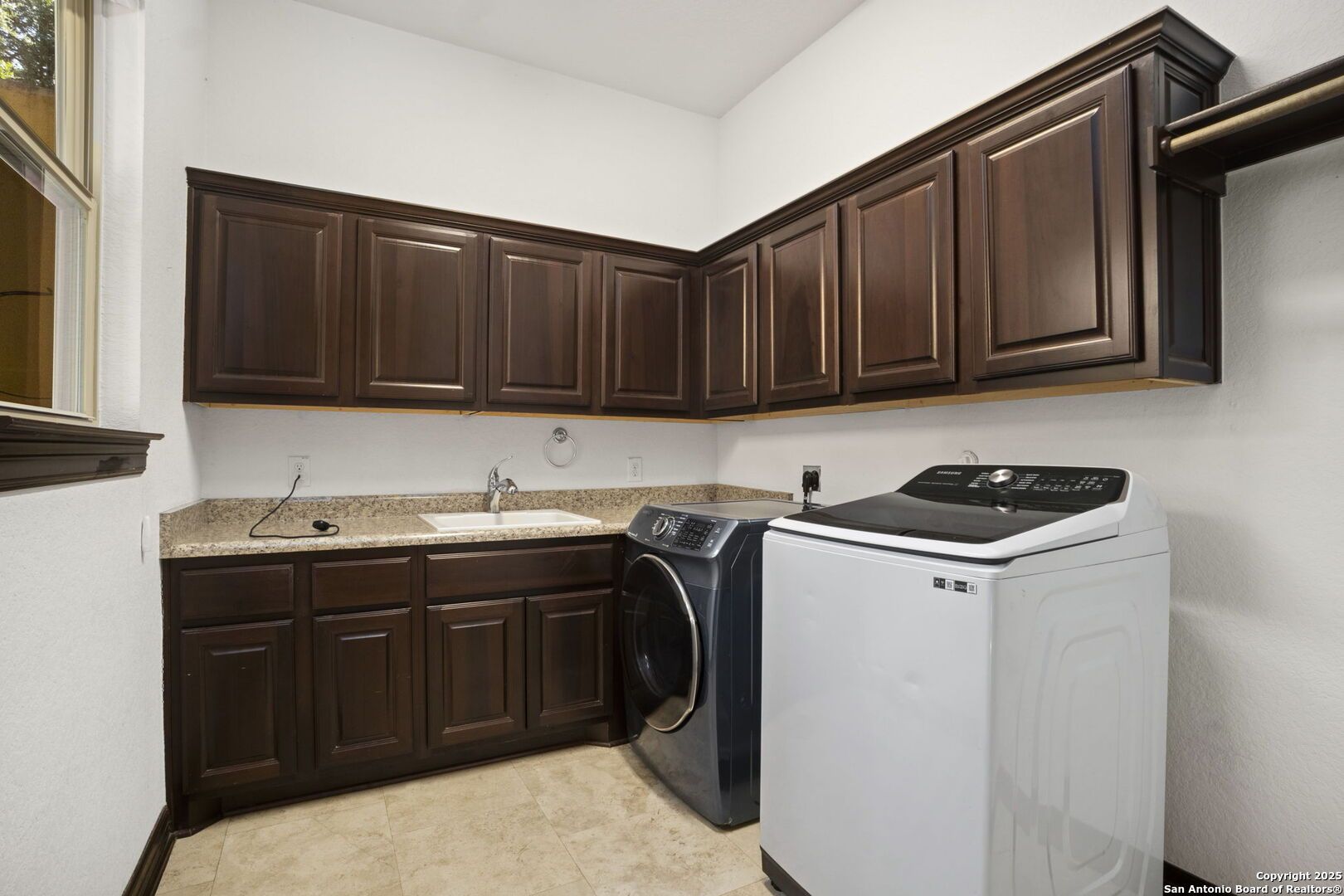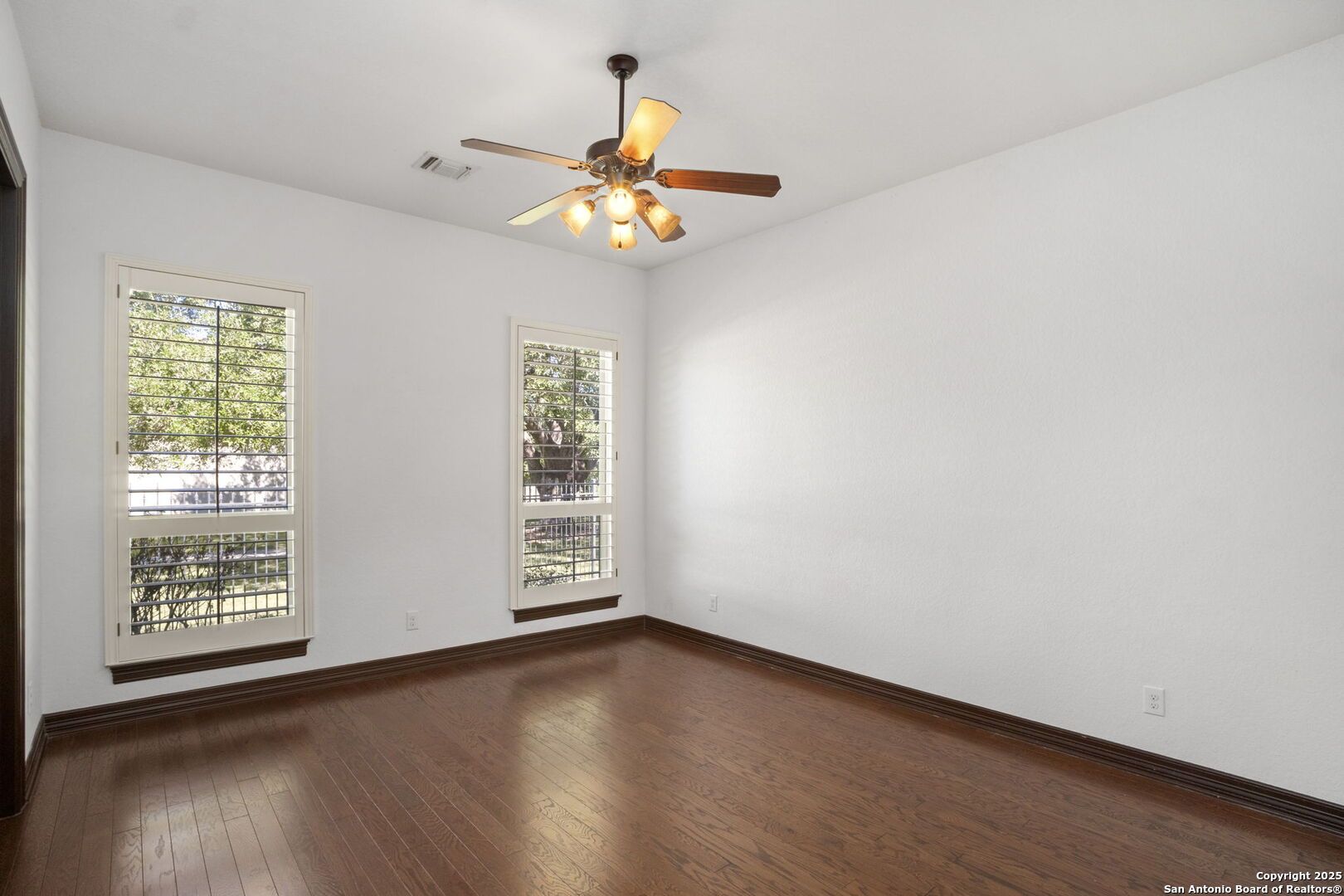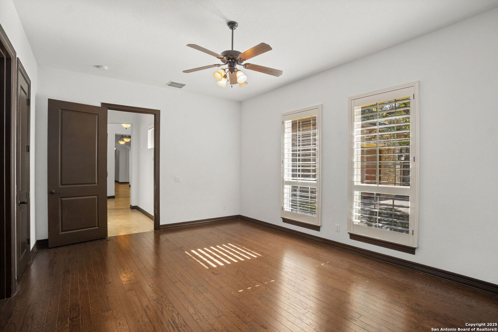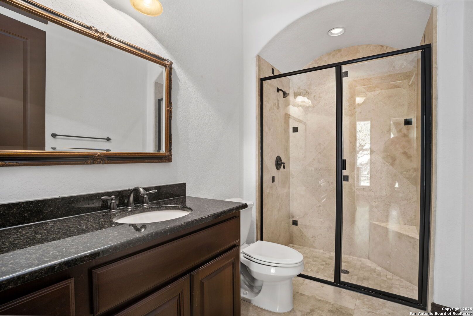 Welcome to 22426 Viajes - a stunning Sitterle-built home in the prestigious gated enclave of Campanas at Cibolo Canyons. This elegant 4-bedroom, 4-bath residence offers 3,765 square feet of refined living space, showcasing timeless craftsmanship and exceptional attention to detail throughout.From the moment you enter, a barrel-ceiling foyer sets the tone for sophistication, leading into a thoughtfully designed floor plan perfect for entertaining, relaxing, and everyday living. The home features travertine and hardwood flooring, custom built-ins, and granite countertops, with plantation shutters enhancing each bedroom.The chef's kitchen is a true centerpiece, equipped with a KitchenAid built-in refrigerator, JennAir stainless steel appliances, double ovens, gas range with pot filler, and two pantries. A large island, built-in desk, and breakfast area with buffet cabinetry create a seamless blend of style and function. The wine pantry with an ornate iron scrolled door adds a sophisticated touch.The owner's suite serves as a private retreat with wood floors, a recessed ceiling, and a spa-inspired bath featuring dual vanities, a makeup area, soaking tub, travertine shower, and two expansive walk-in closets. The split floor plan ensures privacy, with each secondary bedroom offering its own full bath. One bedroom includes custom shelving, making it an ideal home office or study. The living room impresses with its soaring ceilings, surround sound, abundant natural light, and custom built-in cabinetry. A flex room with exposed beam detailing and wood floors offers versatility-perfect for a dining area, library, bar/lounge, or home gym.Step outside to a private backyard oasis shaded by mature oak trees, featuring a sprinkler system and two covered patios, one with a built-in cooking station and granite countertops-ideal for outdoor entertaining.The HOA at Campanas provides a comprehensive, year-round landscape maintenance program included with homeownership. Services include weekly mowing, edging, weeding, trash pickup, and power-blowing of curbs and walkways during peak seasons, with bi-weekly service in winter months. All beds are weeded monthly, and shrubs and plant material (both under and over 6 feet) receive scheduled trimming throughout the year, along with bed cultivation and chemical weed treatments. Tree suckers under six feet are removed as needed. The HOA also monitors irrigation monthly, provides seasonal turf fertilization, shrub fertilization, annual color installation, and crepe myrtle pruning. Turf pre-emergent and post-emergent weed control are applied at specific intervals, and ant insecticide treatments are included through WW Pest as necessary. Front yard beds are re-mulched seasonally. Altogether, the program ensures consistent, professional landscape care without homeowners needing to manage any exterior yard work themselves.Residents of Campanas enjoy a lock-and-leave lifestyle with HOA-covered lawn care, landscaping, and home security monitoring, plus access to the Campanas Clubhouse, which offers a resort-style pool, gym, library, game room, pickleball and tennis courts, and scenic walking trails. Homeowners also enjoy privileges at the Cibolo Canyons Amenity Centers, featuring a lazy river, additional pools, fitness facilities, and social gathering spaces.Located just minutes from top-rated schools, shopping, medical centers, and the JW Marriott San Antonio Hill Country Resort & Spa-home to TPC San Antonio's two championship golf courses-this home offers luxury, comfort, and convenience in one exquisite package.Move-in ready and beautifully maintained-your Hill Country lifestyle awaits.