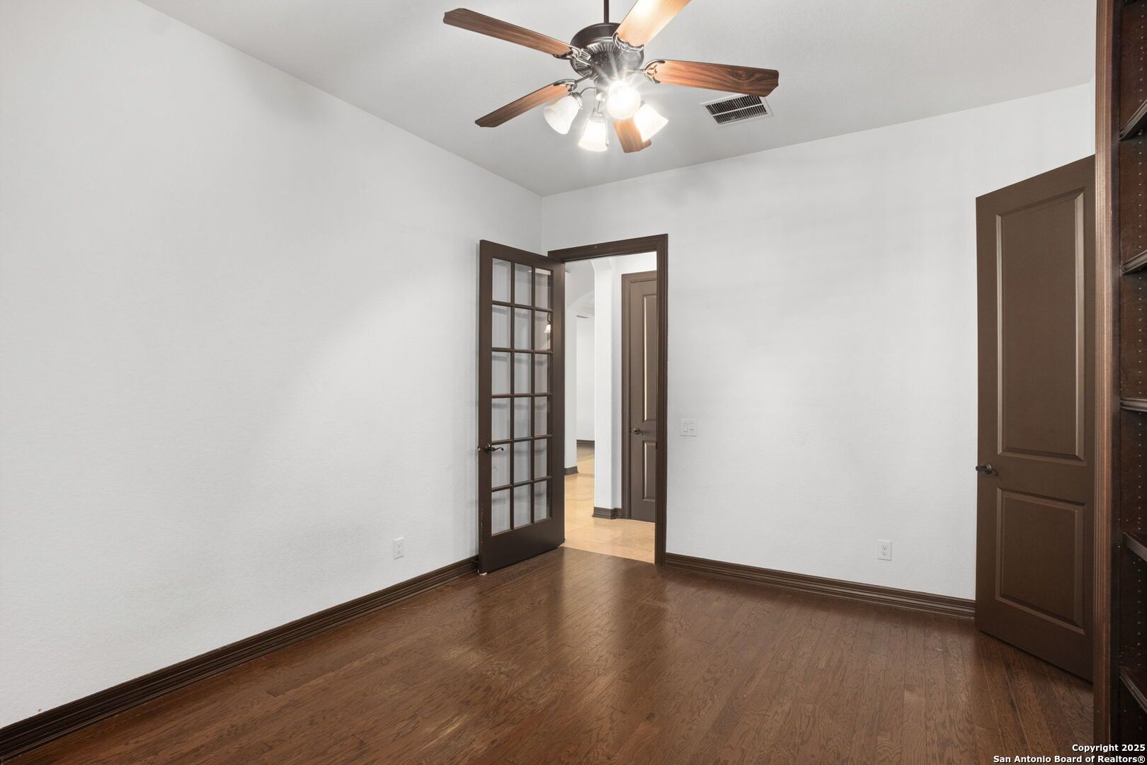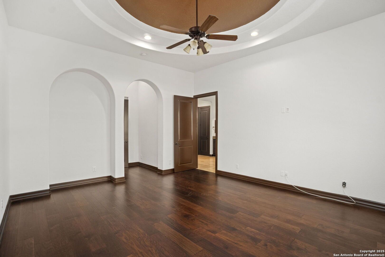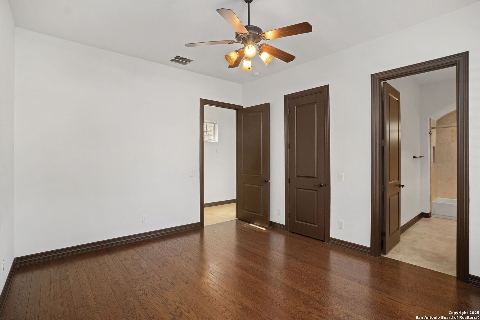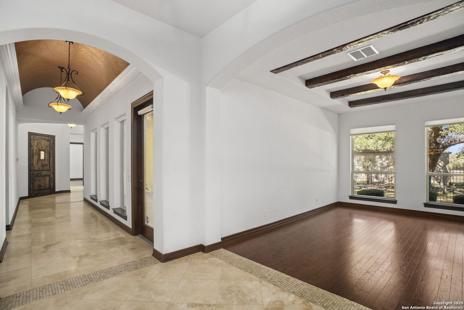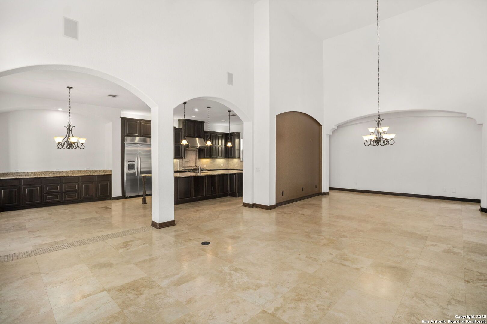 Welcome to 22426 Viajes - a stunning Sitterle-built home in the prestigious gated enclave of Campanas at Cibolo Canyons. This elegant 4-bedroom, 4-bath residence offers 3,765 square feet of refined living space, showcasing timeless craftsmanship and exceptional attention to detail throughout.From the moment you enter, a barrel-ceiling foyer sets the tone for sophistication, leading into a thoughtfully designed floor plan perfect for entertaining, relaxing, and everyday living. The home features travertine and hardwood flooring, custom built-ins, and granite countertops, with plantation shutters enhancing each bedroom.The chef's kitchen is a true centerpiece, equipped with a KitchenAid built-in refrigerator, JennAir stainless steel appliances, double ovens, gas range with pot filler, and two pantries. A large island, built-in desk, and breakfast area with buffet cabinetry create a seamless blend of style and function. The wine pantry with an ornate iron scrolled door adds a sophisticated touch.The owner's suite serves as a private retreat with wood floors, a recessed ceiling, and a spa-inspired bath featuring dual vanities, a makeup area, soaking tub, travertine shower, and two expansive walk-in closets. The split floor plan ensures privacy, with each secondary bedroom offering its own full bath. One bedroom includes custom shelving, making it an ideal home office or study. The living room impresses with its soaring ceilings, surround sound, abundant natural light, and custom built-in cabinetry. A flex room with exposed beam detailing and wood floors offers versatility-perfect for a dining area, library, bar/lounge, or home gym.Step outside to a private backyard oasis shaded by mature oak trees, featuring a sprinkler system and two covered patios, one with a built-in cooking station and granite countertops-ideal for outdoor entertaining.The HOA at Campanas provides a comprehensive, year-round landscape maintenance program included with homeownership. Services include weekly mowing, edging, weeding, trash pickup, and power-blowing of curbs and walkways during peak seasons, with bi-weekly service in winter months. All beds are weeded monthly, and shrubs and plant material (both under and over 6 feet) receive scheduled trimming throughout the year, along with bed cultivation and chemical weed treatments. Tree suckers under six feet are removed as needed. The HOA also monitors irrigation monthly, provides seasonal turf fertilization, shrub fertilization, annual color installation, and crepe myrtle pruning. Turf pre-emergent and post-emergent weed control are applied at specific intervals, and ant insecticide treatments are included through WW Pest as necessary. Front yard beds are re-mulched seasonally. Altogether, the program ensures consistent, professional landscape care without homeowners needing to manage any exterior yard work themselves.Residents of Campanas enjoy a lock-and-leave lifestyle with HOA-covered lawn care, landscaping, and home security monitoring, plus access to the Campanas Clubhouse, which offers a resort-style pool, gym, library, game room, pickleball and tennis courts, and scenic walking trails. Homeowners also enjoy privileges at the Cibolo Canyons Amenity Centers, featuring a lazy river, additional pools, fitness facilities, and social gathering spaces.Located just minutes from top-rated schools, shopping, medical centers, and the JW Marriott San Antonio Hill Country Resort & Spa-home to TPC San Antonio's two championship golf courses-this home offers luxury, comfort, and convenience in one exquisite package.Move-in ready and beautifully maintained-your Hill Country lifestyle awaits.