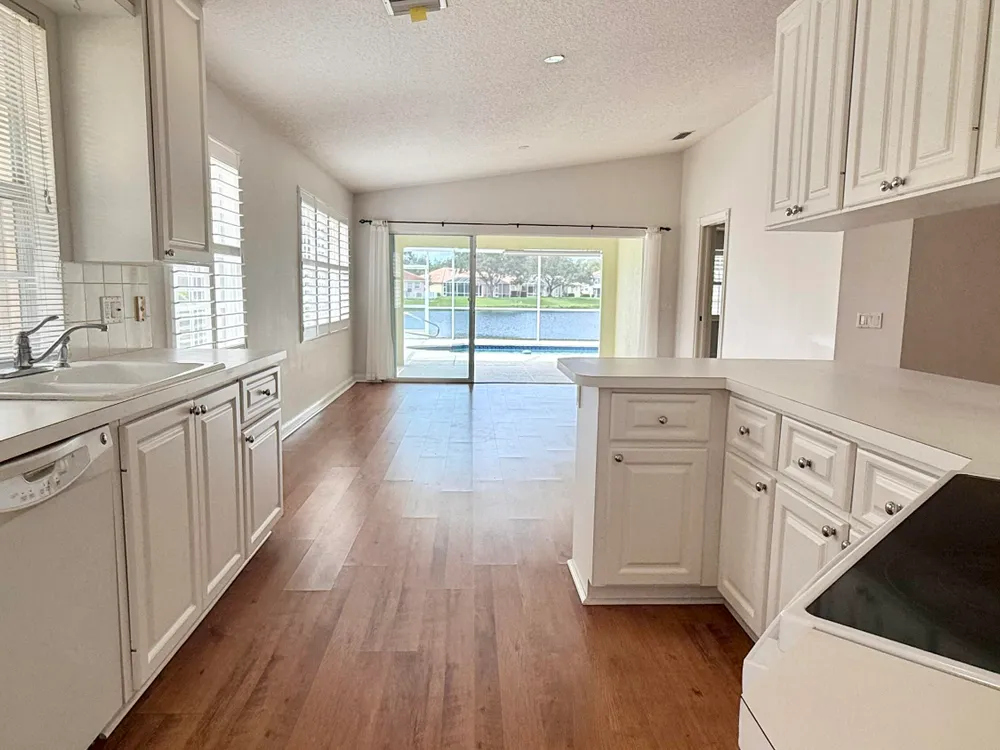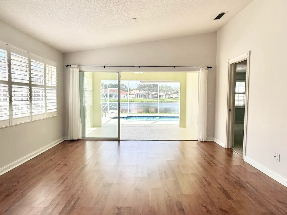 Spectacular wide lake view from the custom screened pool of this 2BR/2BA Capri model villa. Ideally located just a short walk from the Town Center with Centanni's Restaurant, community pools, fitness center, and more. Features include a new roof, A/C in 2023, and laminate flooring in main living areas. The Great Room offers a built-in entertainment unit and vaulted ceilings for a bright, open feel. Additional highlights include accordion storm shutters, laundry room with full-size washer, dryer, and utility sink, central vacuum, and alarm system. Enjoy serene lakefront living with resort-style amenities right at your doorstep!