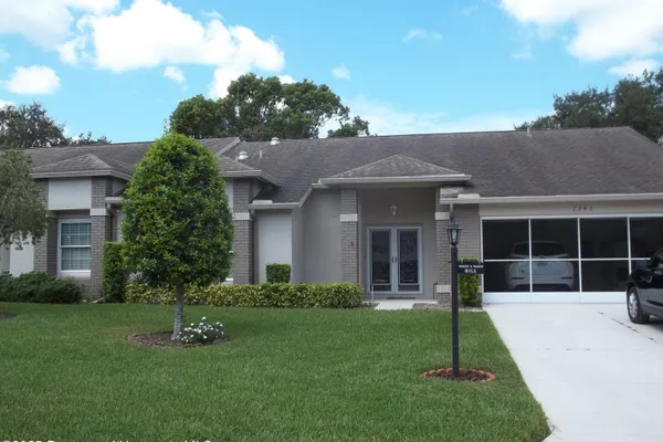 TIMBER PINES Expanded Oakmont villa. Enter the leaded glass front doors with matching glass in side garage door. Laminate and ceramic flooring,(No Carpet), Six panel door, windows 2020, Kitchen has granite counter tops drawers for dishes, cookie sheet cabinet and nice size pantry. LG appliances. Dining area at end of kitchen. Laundry room adjacent to kitchen with cabinet above washer and dryer. Plus upper and lower cabinets plus laundry sink on opposite wall. Nice living room with solar tube for natural lighting, Formal dining area. Remote control shades on family room windows. Master bedroom is nice size with master bath easy walk in shower, upgraded counter top and under sinks. Second bath has tub shower upgraded counter top. Patio to the rear to enjoy the outdoor. Roof and water heater 2011. New HVAC in 2025. This villa comes partially furnished ready for a new owner. This is a No Dog village.
