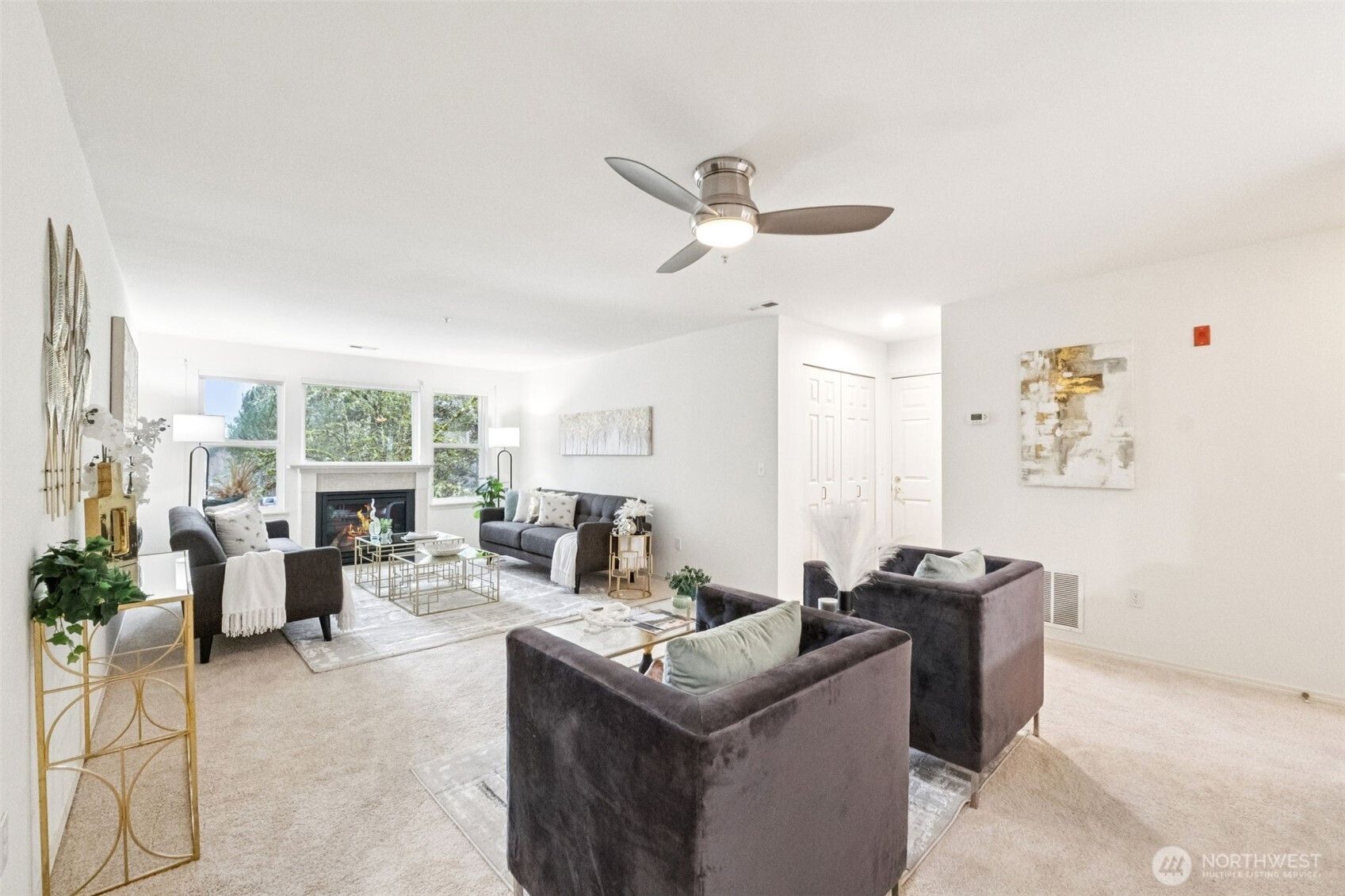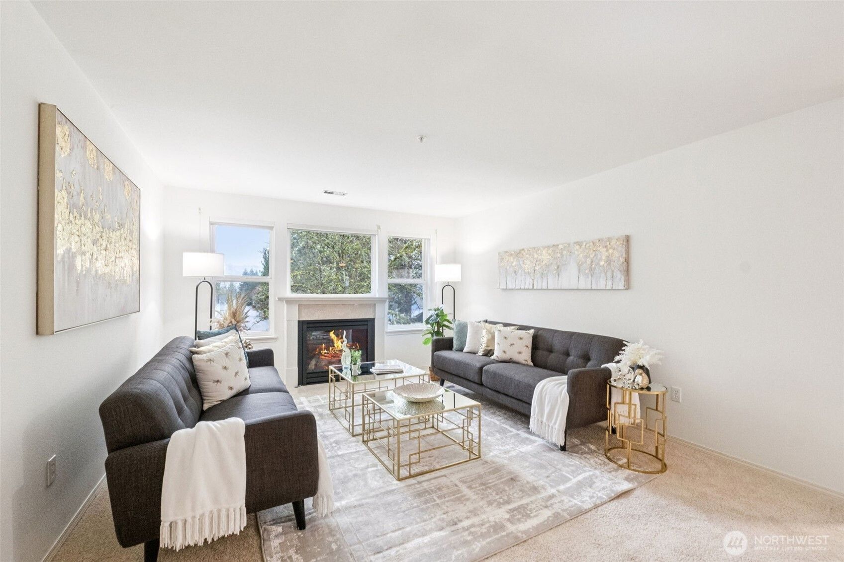 Exceptional private 2 bed/2 ba end unit property. Spacious open floor plan features large windows with natural light, views of the beautiful trees. Spacious kitchen features white newly painted cabinets, new sink, SS appl. Brand new carpet, luxury vinyl plank & paint throughout! New modern light fixtures. L/D with gas fireplace. Large nook/office/sitting room. Primary suite on main with walk-in closet. Full bath on main floor. Upstairs 2nd view bedroom with walk-in closet, full hall bath. Enjoy the quiet front patio. Exterior sun shades. Newer furnace, H20, W/D. 1-car attached garage. This plan is larger than the comps/feel the difference in the room sizes! Highly desirable 55+ Providence Point features welcoming activities & amenities.