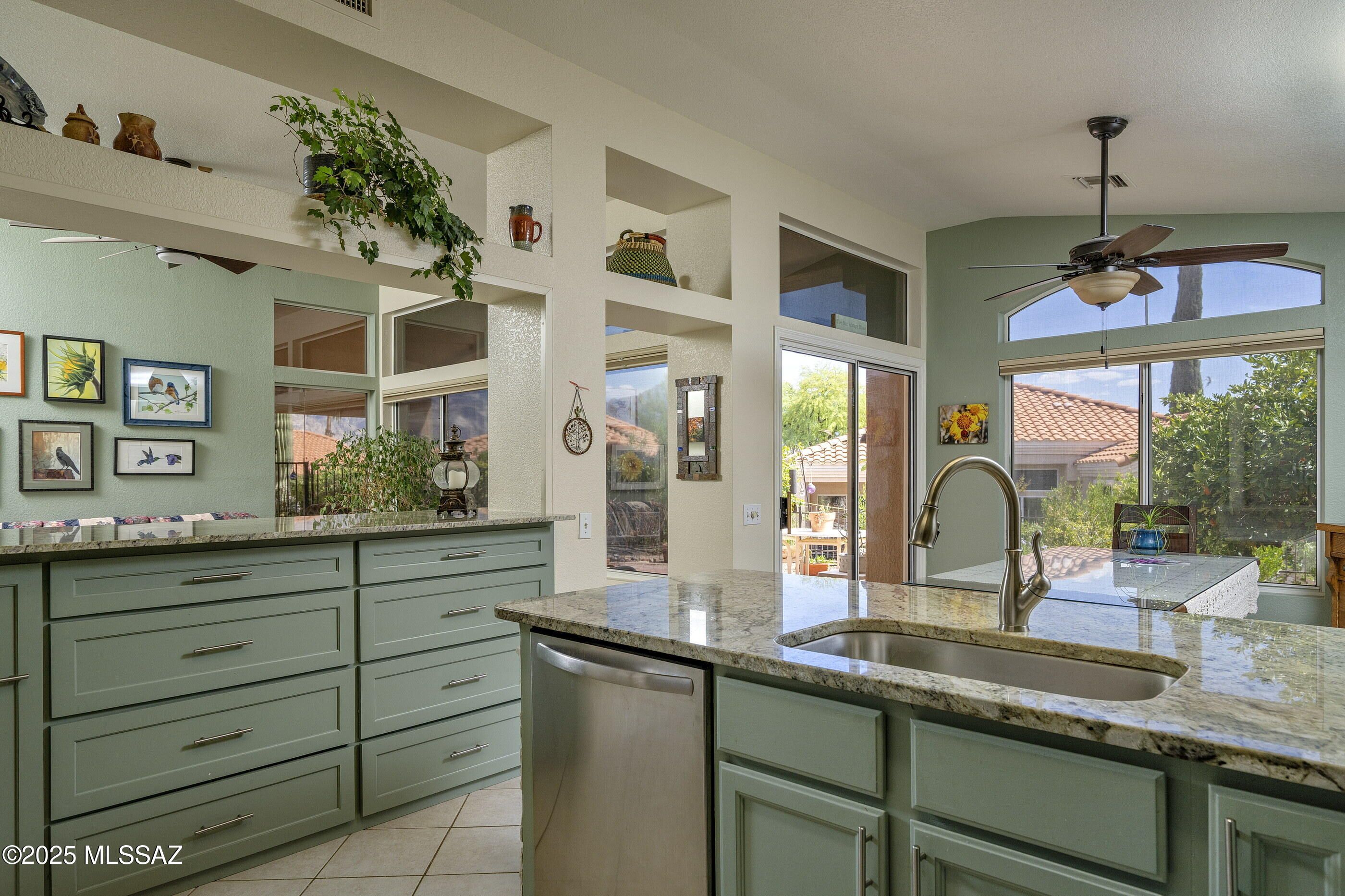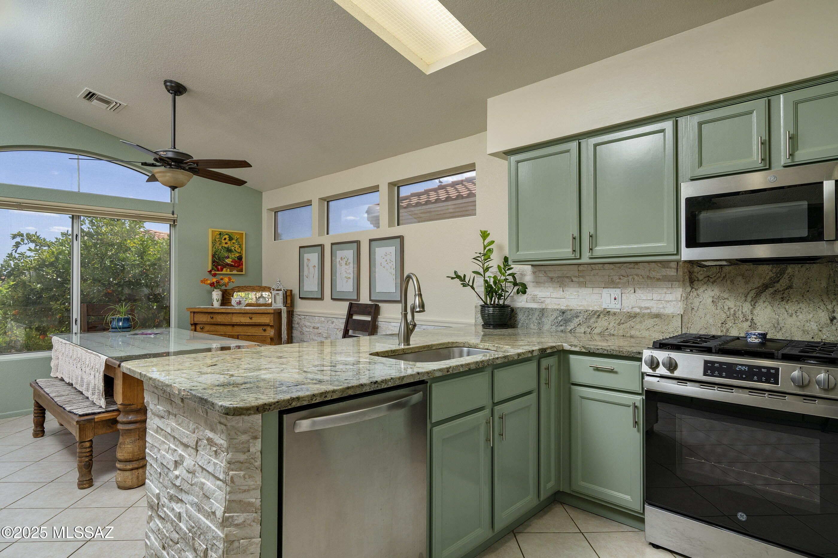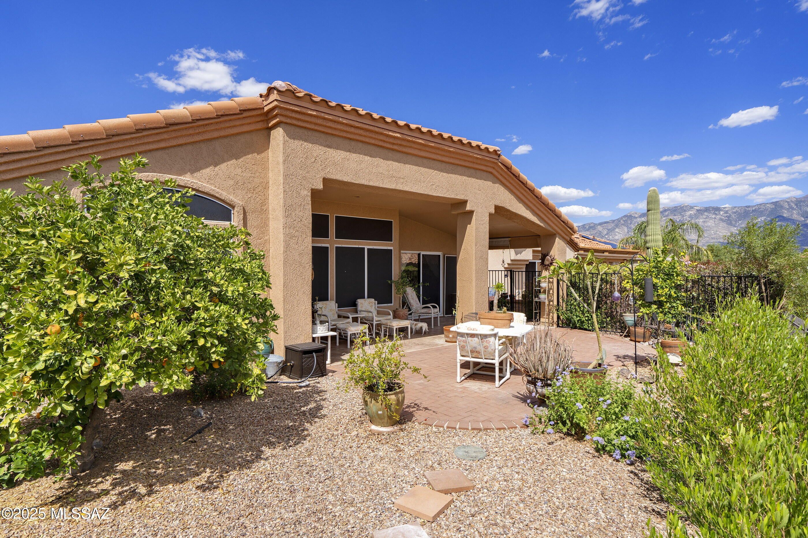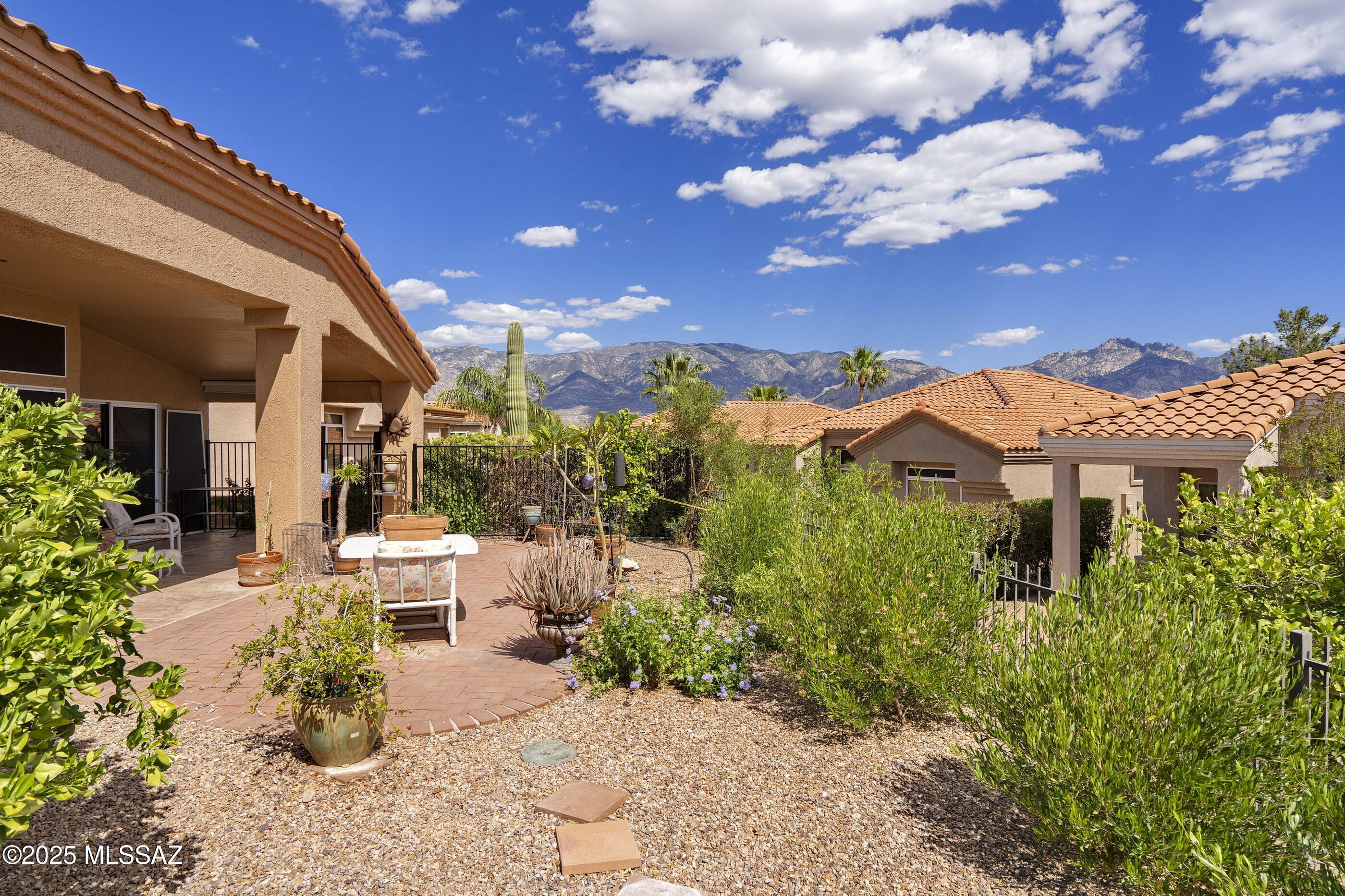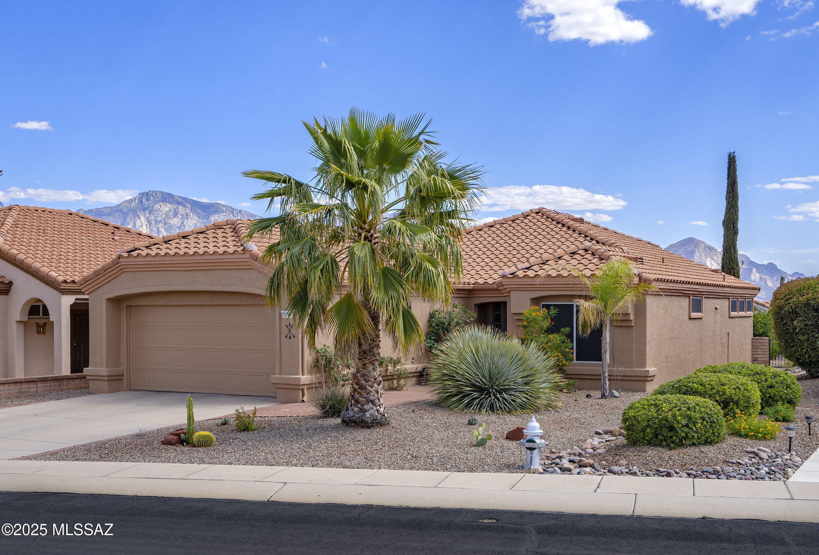 Stunning 2/2 in Sun City Vistoso. Elevated lot that provides massive mountain views! Enjoy all the amenities at Sun City or spend your days relaxing in this tranquil home with great natural light and the perfect finishing touches. Kitchen has granite with stacked stone accents and stainless steel appliances.. Storage added to the kitchen pony wall. Neutral tile flooring through out. Living room has a wall of windows perfect for capturing the outdoor views. Covered back patio with pavers. Mature landscaping. Fully fenced back yard. Roof, exterior paint, water heater (New on demand water at kitchen) and interior paint in 2021. Garage storage. Active adult community with many amenities. Book a community tour today!