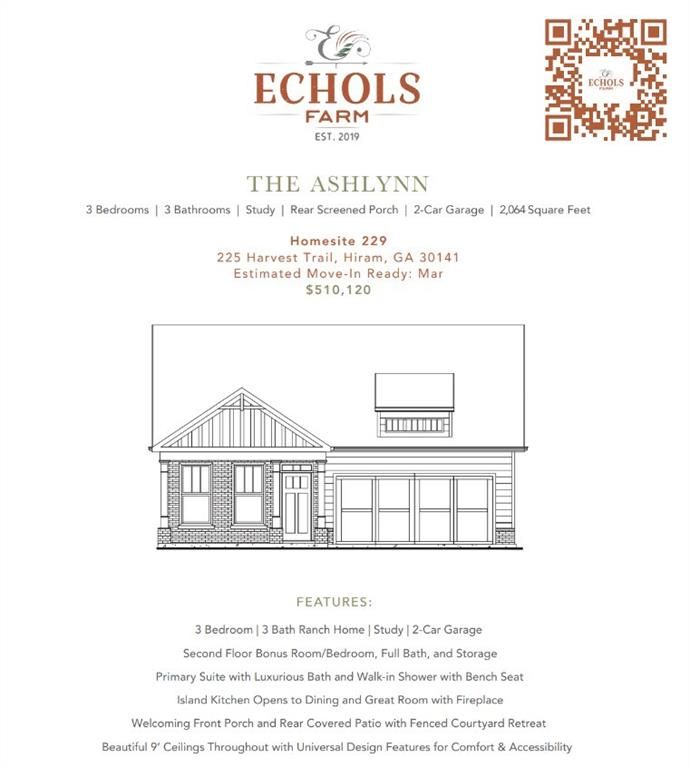 THIS IS THE ONE! THE ASHLYNN PLAN BY WINDSONG HOMES FOR LIFE. YOU WON'T BELEIVE THE STORAGE IN THIS MAIN LEVEL LIVING HOME WITH ABUNDANT STORAGE AND MORE LIVING SPACE ON THE UPPER LEVEL. Be one of the last to own a brand new Windsong home in beautiful Echols Farm. Upon entering the gated community, you will be surrounded by lush landscaping amongst the One-of-a-Kind Amenities including the stunningly, beautiful 2 Story CLUBHOUSE which overlooks the lake with a fountain feature, walking trails, EVENT BARN and a separate structure ironically named the MAKERS SPACE, where homeowners gather to share their love for arts and crafts. Join the activities any day or every day with homeowners as they play cards and games. Join the clubs, socials groups or just bring yourself to the covered outdoor patio at the Clubhouse or Event Barn to listen to the peaceful fountain as you relax in the evening. Now that you can't wait to enjoy the Amenities at Echols Farm, settle into the ASHLYNN plan which is the perfect place to call HOME. No more lawn maintenance, just plenty of time to spend doing all the things you've been putting off. Pickleball and Bocce ball courts are on property. You can join in on the fun or sit on the sidelines and cheer on your neighbors. The ASHLYNN is the perfect plan for you, with an oversized primary suite on the rear of the home that offers serene privacy, a guest bedroom plus a study/flex space which is conveniently located to the large open living area including the family room, dining and a kitchen that any chef would be proud of. The covered and screened private rear patio is stepless to your private outdoor living area, which is fenced with 2 gates. Within your outdoor living area, is your personal courtyard of all your favorite landscaping, shrubs, flowers and plants. Create the English Garden you've always wanted, relax in your hot tub, or build a courtyard firepit for nighttime gatherings. This home includes interior designer upgrades so there is nothing "builder grade" about this home. Home is under construction and scheduled to be completed by MARCH. Don't lose out on this amazing opportunity to live at Echols Farm in one of the last remaining new homes. Our MODEL HOME is open daily Monday - Saturday 10-5 and Sunday 1-5.