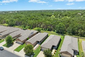 A charming Steel Creek floor plan in Sun City, TX with private wooded views from the comforts of a screened back porch and a South-facing, partially fenced backyard. Step inside to warm wood floors in the living room, kitchen, and breakfast area, while both bedrooms offer cozy carpet underfoot. The kitchen features a raised dishwasher for added convenience, Whirlpool appliance package with gas range, and pendant lighting above a quartz island with breakfast bar seating. Both bathrooms include sleek quartz counters. The garage adds extra storage with handy overhead hanging racks. 2020 Roof. 2016 Water Heater. All this PLUS... SUPER EASY access to TWO of Sun City FOUR resident amenity and fitness centers!