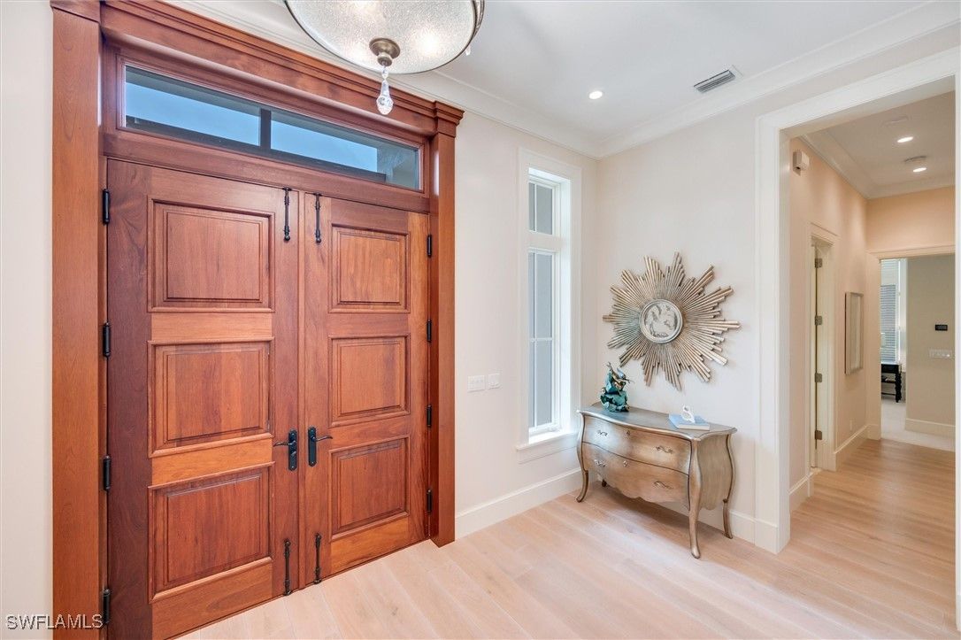 In the heart of the Moorings sits a picture-perfect single story home on a .36 acre southeast private corner lot. Prepare to be in awe with the attention to detail! Filled with natural light, the open floor 3933 under a/c, 5,473 total square foot plan is an ideal and manageable living space with a great flow. An innovative design with a one-of-a kind dramatic cupola featuring 4 bedrooms, 4 full baths, 2 half baths, a study, 3 car garage, gas heated pool and spa, an intimate outdoor living space and a lushly landscaped private side yard perfect for pets. Exceptional craftsmanship is found throughout the home with extensive custom millwork and moldings and beautifully stained and painted cypress tongue & groove vaulted ceilings. Fireplaces, a summer kitchen with a Viking grill, and remote-controlled screening and shutters make the outdoor space cozy and perfect for entertaining. The spectacular oversized gourmet kitchen offers Wolf, Bosch and Sub-Zero appliances as well as custom maplewood cabinetry, exotic quartz countertops, an expansive working island and butler’s prep area with full pantry. Extremely striking are the handcrafted European white oak hardwood floors, magnificent lighting fixtures, chandeliers and wall sconces, and the carefully selected stones and natural materials – marble, onyx, quartz, granite, and shell stone – adding warmth to the spaces. A professionally interior designed home, extraordinarily beautiful, and offered turnkey with luxurious custom furniture, original commissioned artwork, sculptures, fitness equipment, fine china, exquisite accessories, and home audio/visual throughout. Other special and mechanical features include two 2022 Lennox HVAC's with an 8 duct-zoning system and digital thermostats in every room; two tankless water heaters; 2022 gas pool heater & pump; 500 gallon propane tank; and a professional landscape design! Every detail of the home is simply perfect and only requires a discriminating buyer with a suitcase. No weather-related insurance claims, and no water damage. Location, location, location! Within one-half mile to Moorings Private Beach, an exclusive amenity privileged to this residence, and a short distance to world-class fine dining and boutique shopping on 5th Avenue, Third Street and Venetian Village. Hospitals, parks, challenging golf courses and marinas all nearby. Come fall in love with paradise!