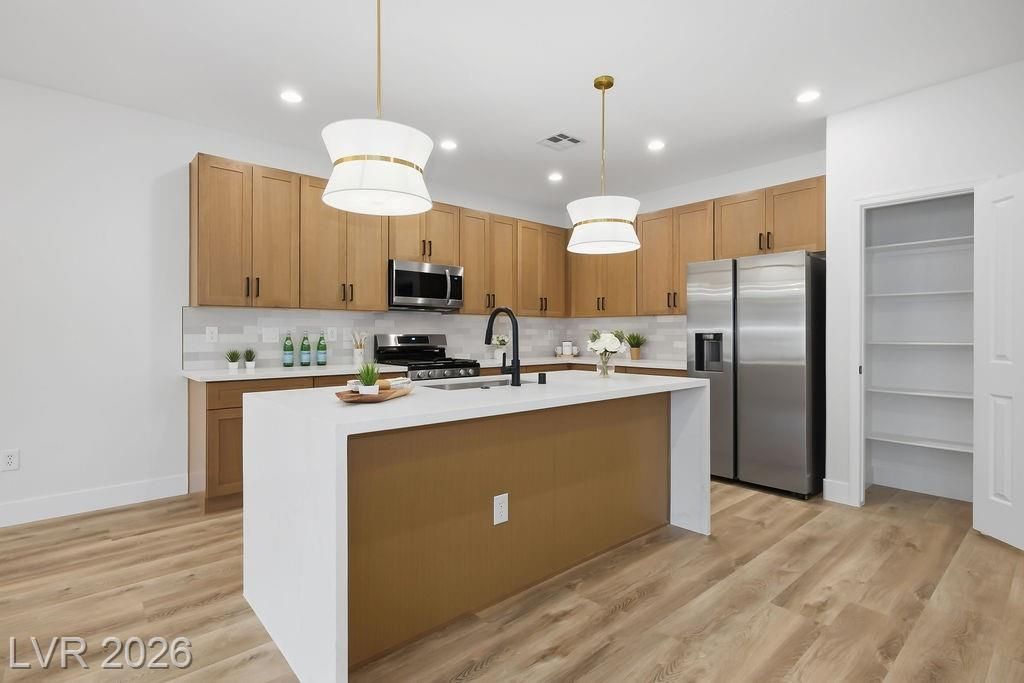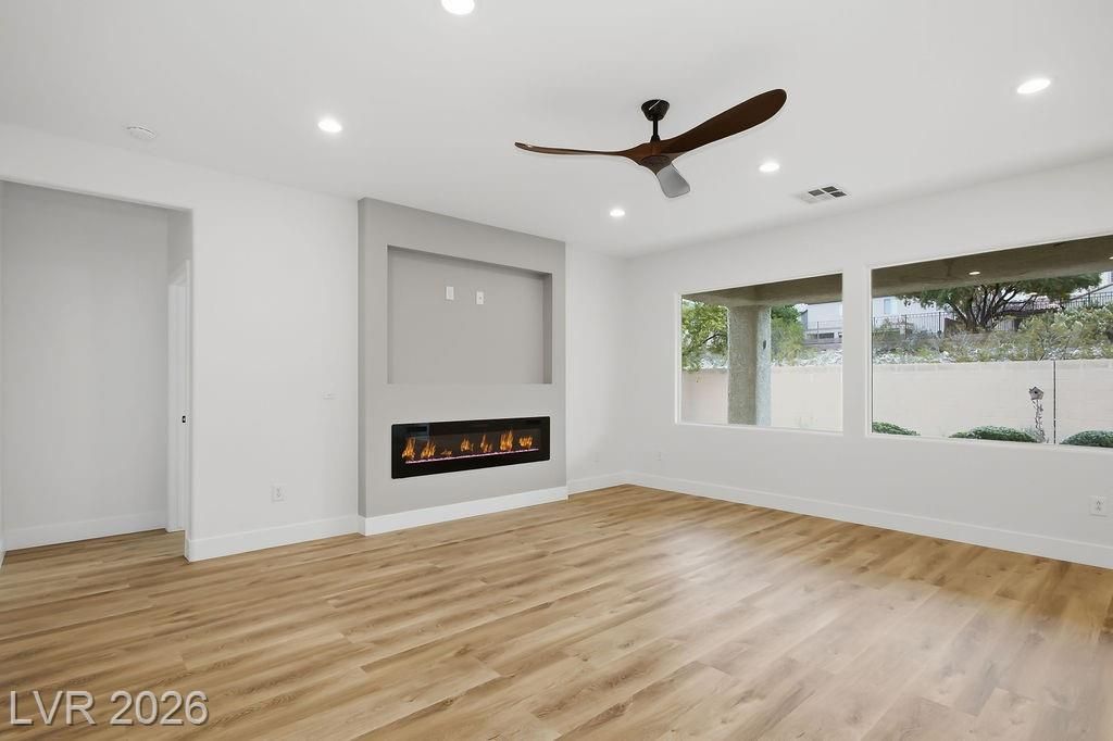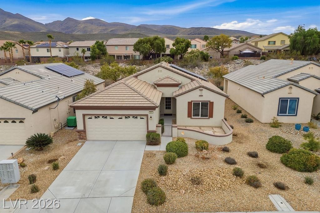 Fully upgraded and move-in ready! Single story home with OWNED SOLAR PANELS that has been completely updated with brand new shaker style soft-close cabinetry, brand new Samsung stainless steel kitchen appliances (the refrigerator is included in the sale), luxurious quartz countertops, a spacious kitchen island with a waterfall edge, tile backsplash, bold pendant lighting, an electric fireplace in the living room, black cabinetry hardware throughout, designer tile showers, sleek wooden fans in every room, solid surface & easy to clean luxury vinyl plank flooring, spacious primary bedroom closet, a den that can be used for hobbies or an office, covered patio, synthetic grass in the backyard, gated front courtyard. This spectacular home is located in the Solera HOA, an active adult (+55) community. There are a plethora of social and physical activities available to residents with resort style amenities. This is conveniently located near Henderson shopping, restaurants and resources.