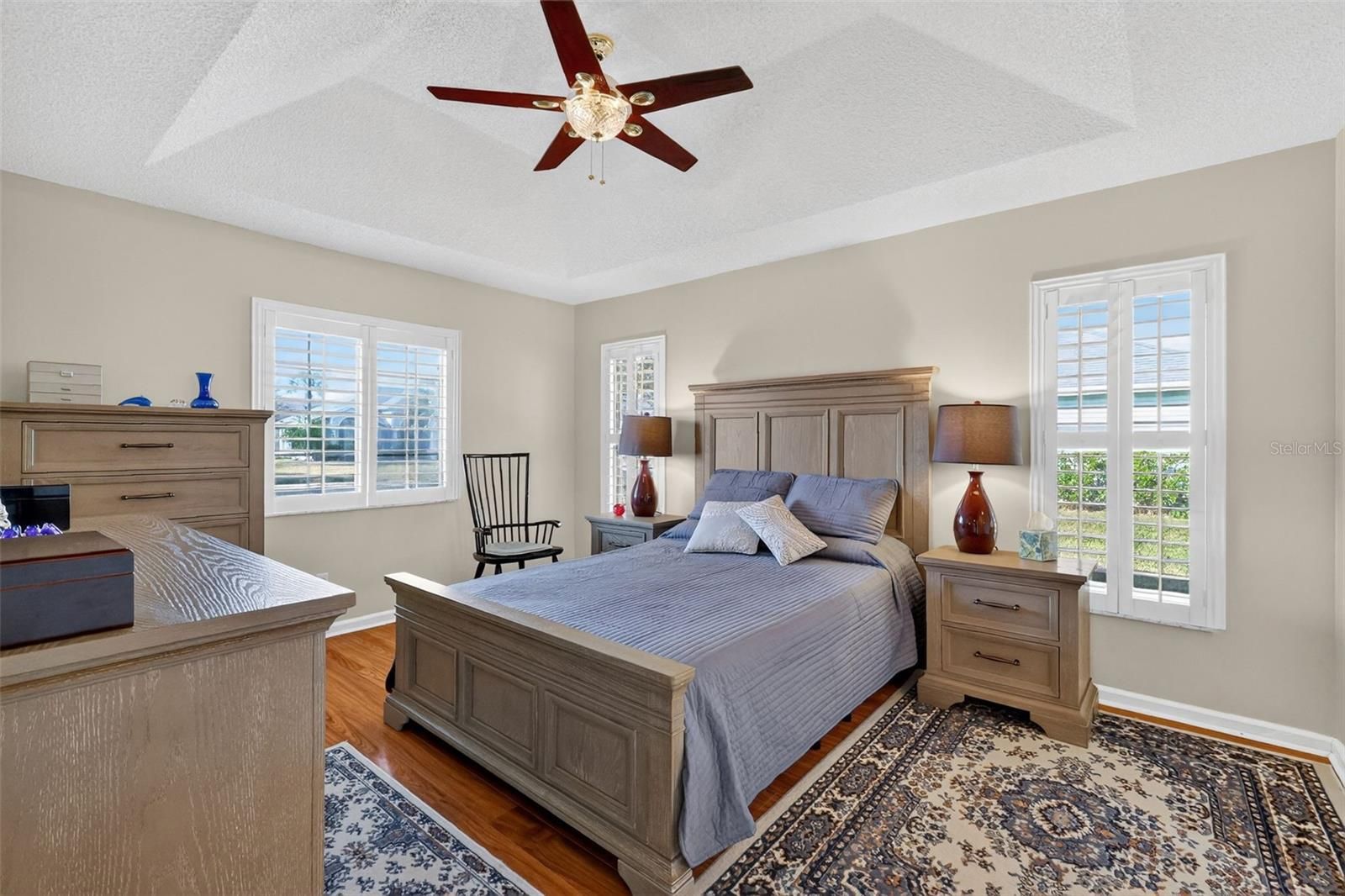 - Cathedral Ceiling(s), Ceiling Fan(s), Crown Molding, Eat-in Kitchen, Main Level Primary, Split Bedrooms, Stone Counters, Walk-In Closet(s), Window Treatments