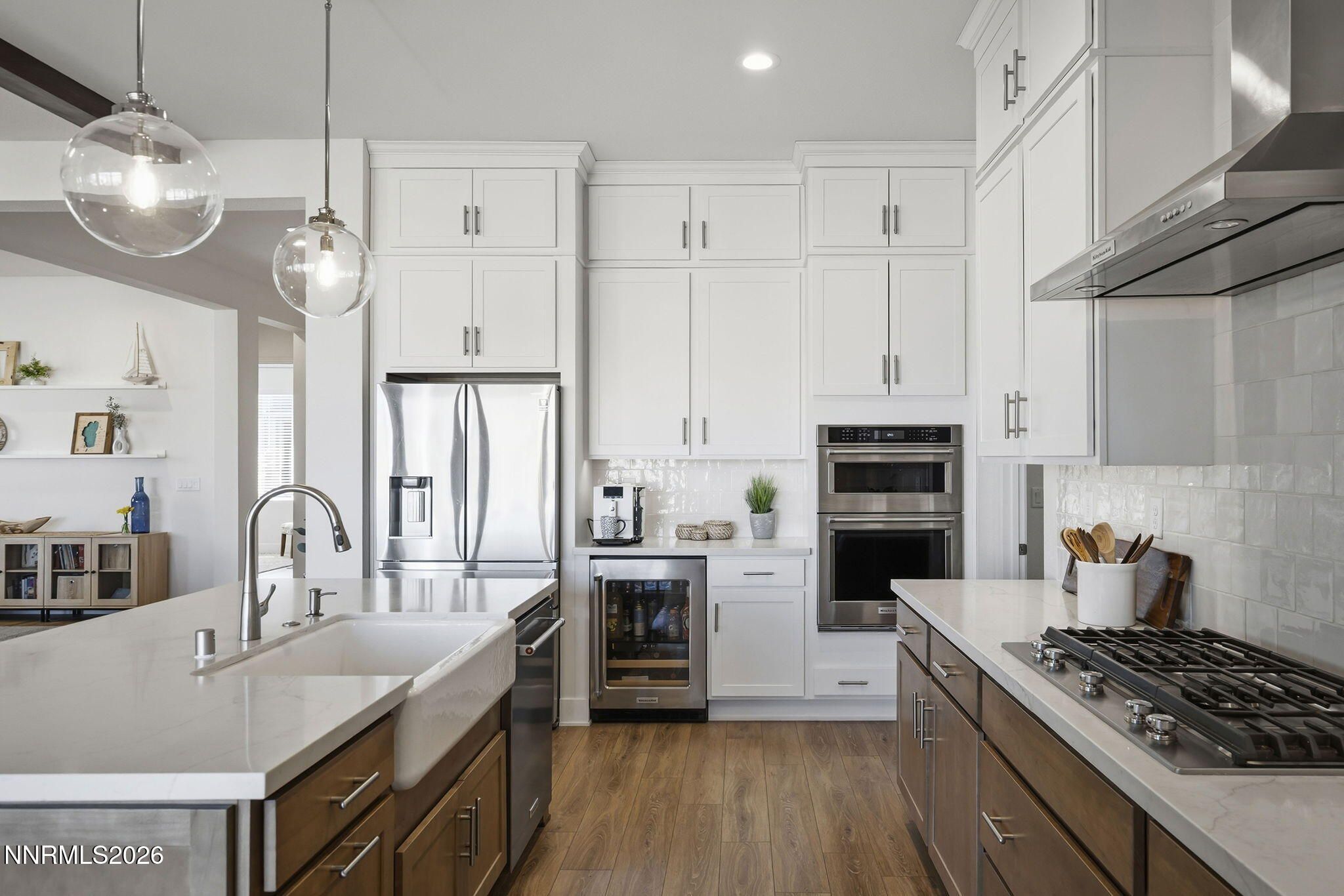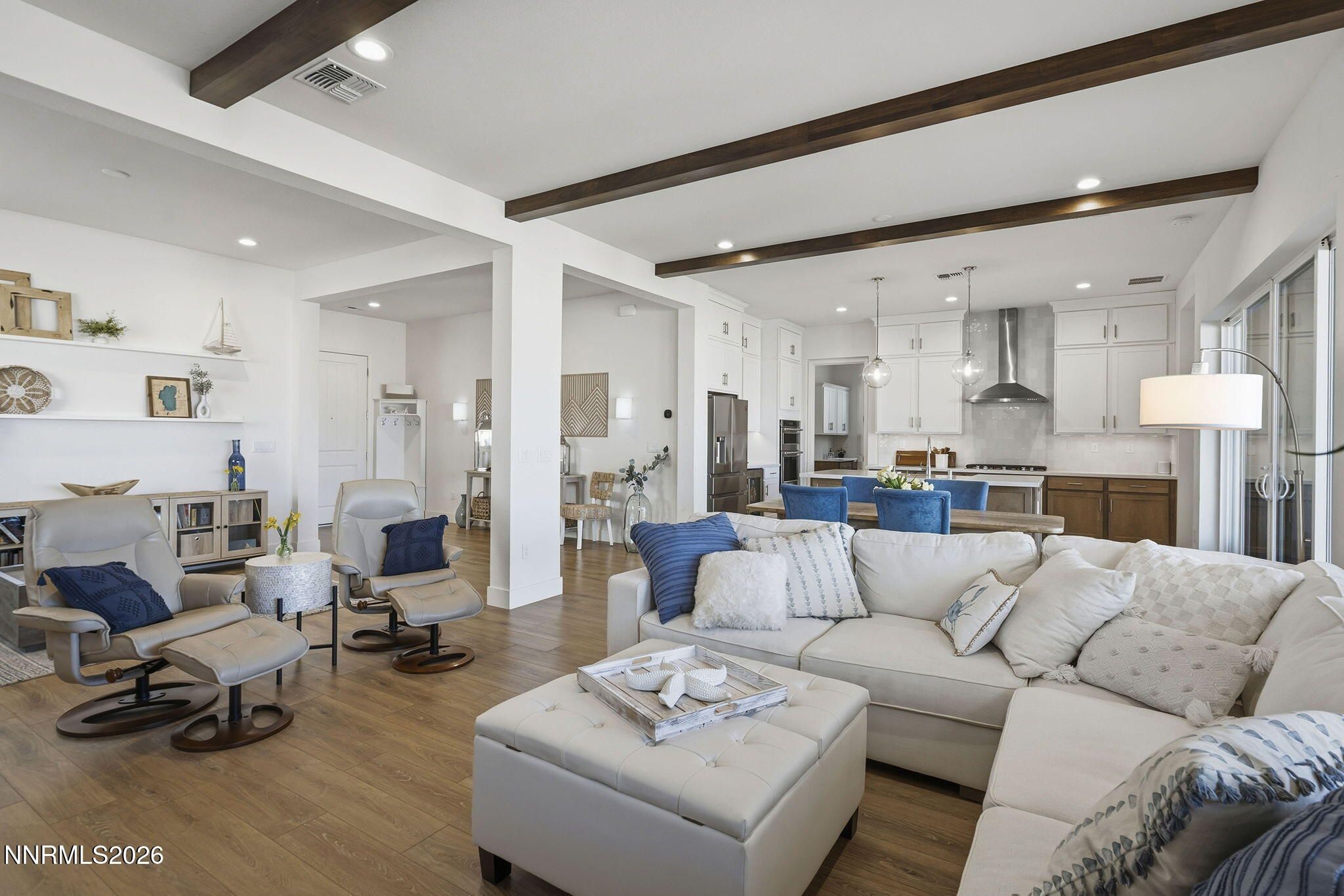 The Aberdeen welcomes you with a bright indoor-outdoor living space anchored by a 16 foot slider that opens to outdoor living. An extended patio and raised pergola create a seamless flow for relaxing or entertaining. Inside, upgraded luxury vinyl plank flooring runs throughout the home, complementing a beautifully designed kitchen with a large island, breakfast bar, ceiling height cabinets, pull out storage, and a built in beverage fridge. The spacious primary suite features its own patio access, filling the room with natural light and mountain views. The primary bath includes a generous walk in closet, dual sink vanity with lighted mirrors, a deluxe rain shower, built in linen storage, and a private water closet. A second bedroom sits on the opposite side of the home for ideal privacy, with a full bath close by. Additional highlights include striking ceiling beams extending from the dining area to the patio, soft close cabinetry throughout, a well appointed laundry room with extra storage and a sink, and a convenient pantry. Outdoor upgrades—gated side access, drip system landscaping, and artificial turf—make this a true lock and leave home. A whole house water softener/purification system, ceiling fans in both bedrooms and the patio, and an epoxy finished, well lit garage add comfort and ease. Located in a vibrant 55+ community known for its warm, welcoming neighbors, this home offers effortless living with stunning views and thoughtful design.