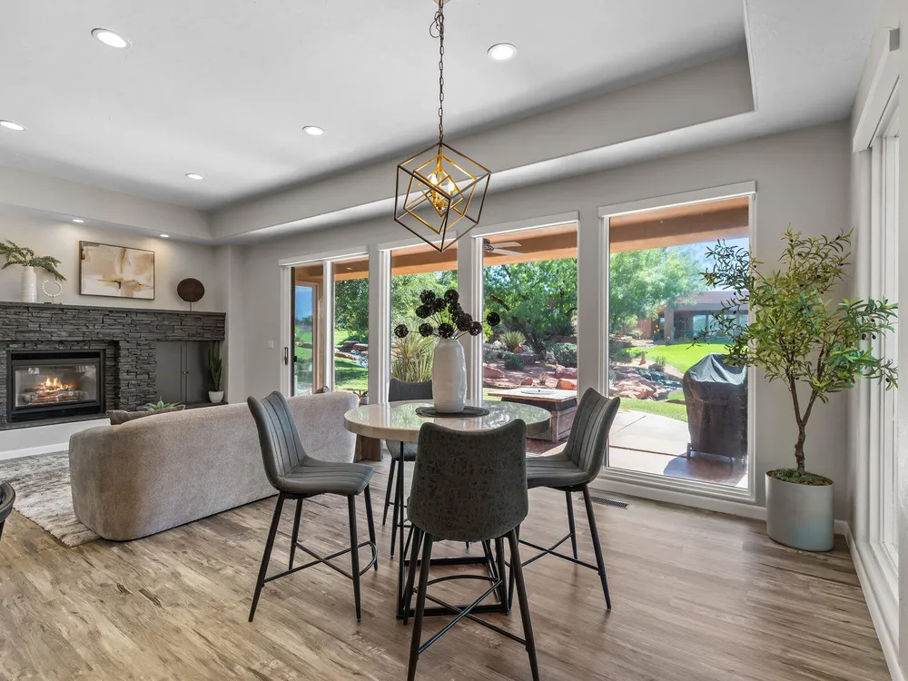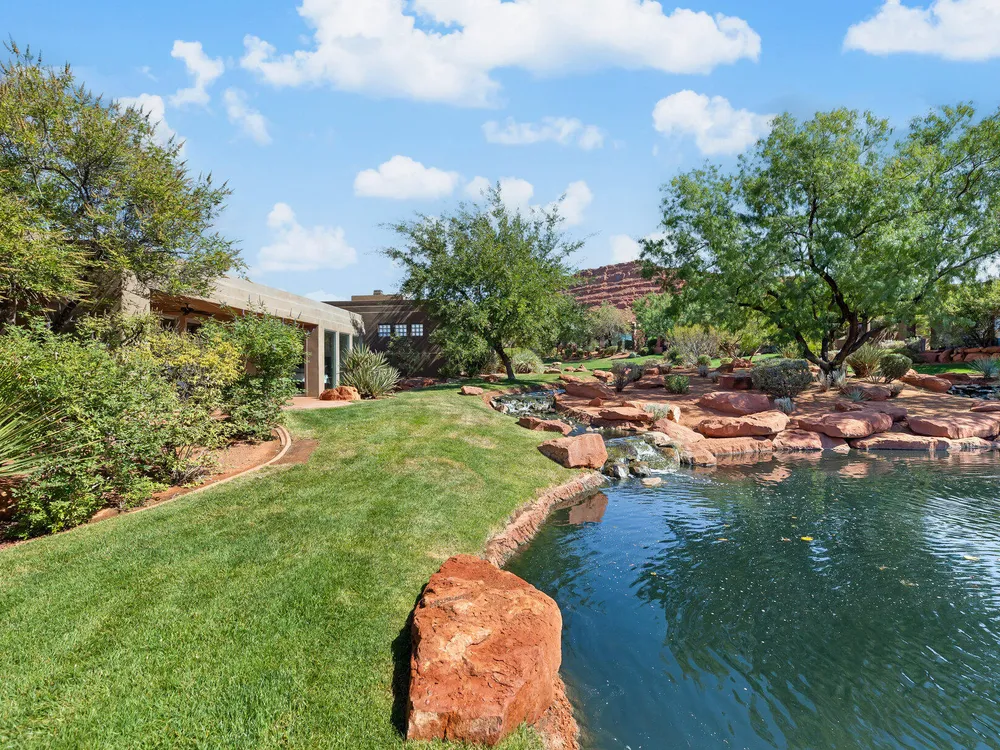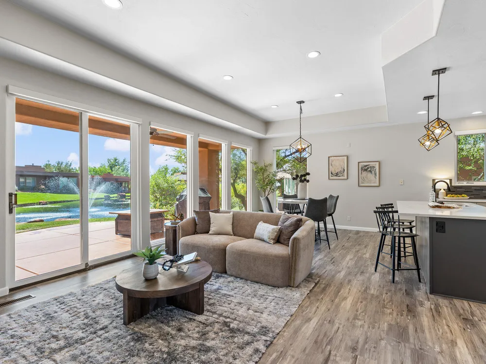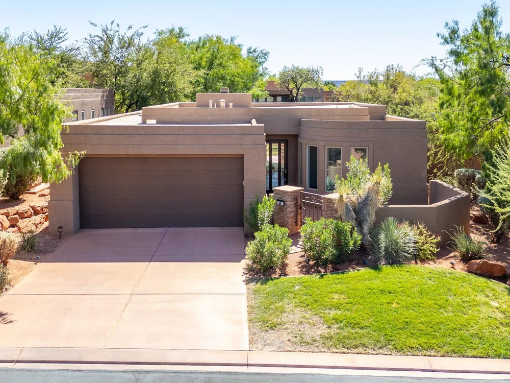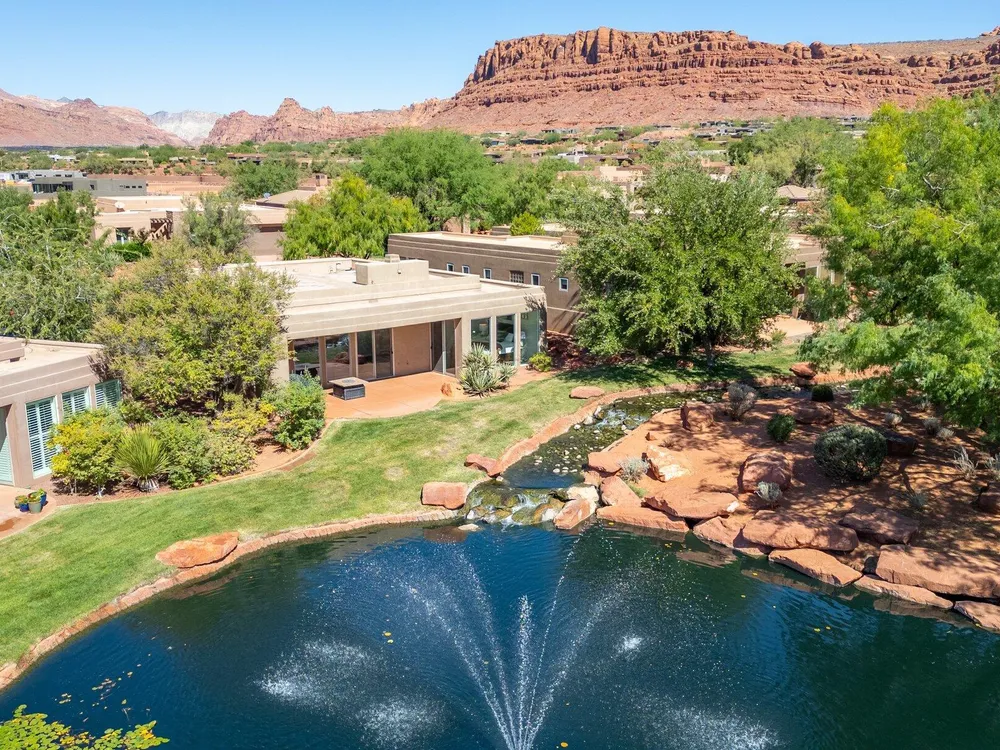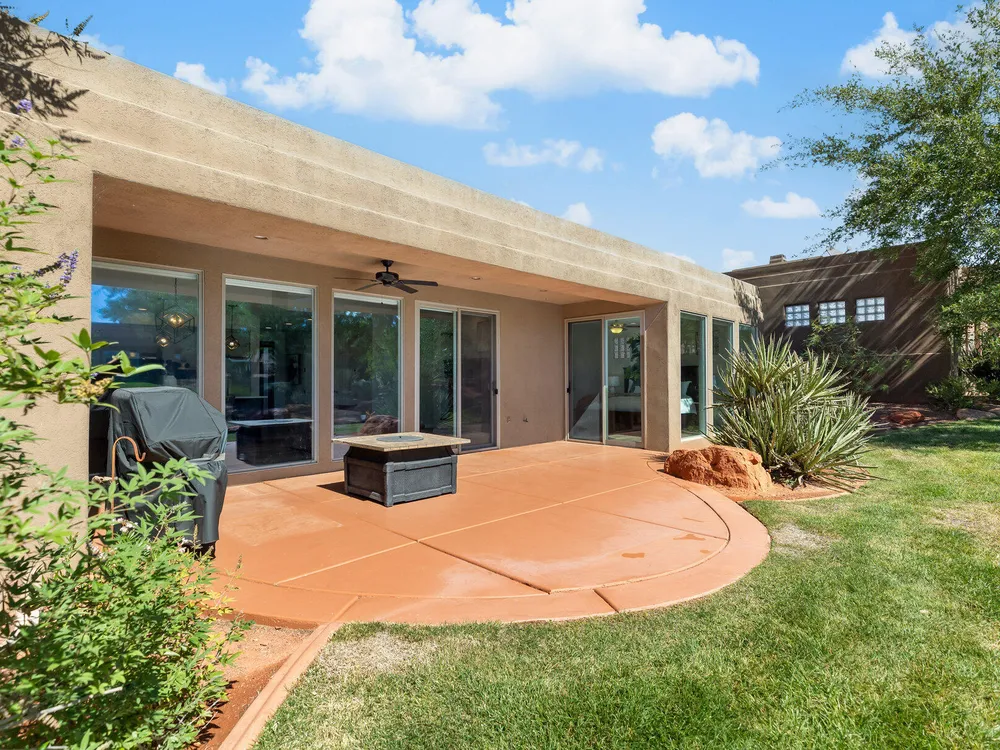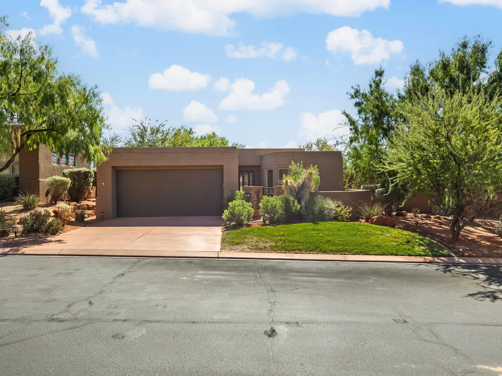 Set along the 3rd hole of Entrada's championship golf course, this beautifully remodeled home in Paiute Springs offers modern comfort and a resort-style lifestyle. A welcoming courtyard, highlighted by a striking glass-and-wood front door, opens to bright, open-concept living and kitchen spaces featuring beautiful wood floors throughout. The kitchen is a showpiece with an oversized island, custom gray wood cabinets, tile backsplash, modern light fixtures, and a bar—perfect for entertaining. The primary suite is a serene retreat, featuring oversized windows, a soaking tub, double vanity, and a generous walk-in closet. Throughout the home, large windows bring in natural light and frame views of the surrounding landscape. Outside, a covered patio overlooks a peaceful pond and water feature, creating an ideal spot for relaxing or entertaining. Residents enjoy world-class Entrada amenities, including indoor and outdoor pools, a clubhouse, fitness center, pickleball, volleyball, and basketball courts. With full landscaping and a prime golf course setting, this home blends Southern Utah's natural beauty with luxury living. The Entrada Golf Course features their recently redesigned course by the distinguished David McLay Kidd. As part of the Troon Prive Golf Course Network, Entrada has been rated the #2 best course in Utah with its par 72 course that extends across 7,280 yards of some of the most majestic desert landscape in the southwest. The community of Entrada includes a guard gate, clubhouse, two outdoor pools and spa, indoor pool, exquisite dining, fully equipped fitness center offering many fitness and yoga classes, tennis/pickleball courts, and a playground. The wellness center includes relaxing spa services such as facials, pedicures, massages, and body treatments. The community is centrally located in the beautiful city of Saint George, which is proud to now host the PGA Tour at Black Desert, multiple LPGA tournaments at Copper Rock, and many notable events, such as the World Championship of the Ironman, St. George Marathon, Red Bull Rampage, and tons of other amazing well-known events. It's only a short drive to America's most astonishing national parks, such as Zion, Bryce, and the North Rim of the Grand Canyon; and state parks and national forests like Snow Canyon, Sand Hollow Reservoir, Gunlock Reservoir, Quail Creek Reservoir, and Dixie Forest. The word is out that at 2,700 feet above sea level, on the edge of the Mojave desert, Colorado Plateau, and the Great Basin, lies one of America's most beautiful and distinctive geological places. This tranquil home is the perfect setting for you to establish your own gathering place in the heart of Southern Utah. Furniture package available. All information herein is deemed reliable but is not guaranteed. The buyer is responsible to verify all listing information, including square footage/acreage, to the buyer's own satisfaction.