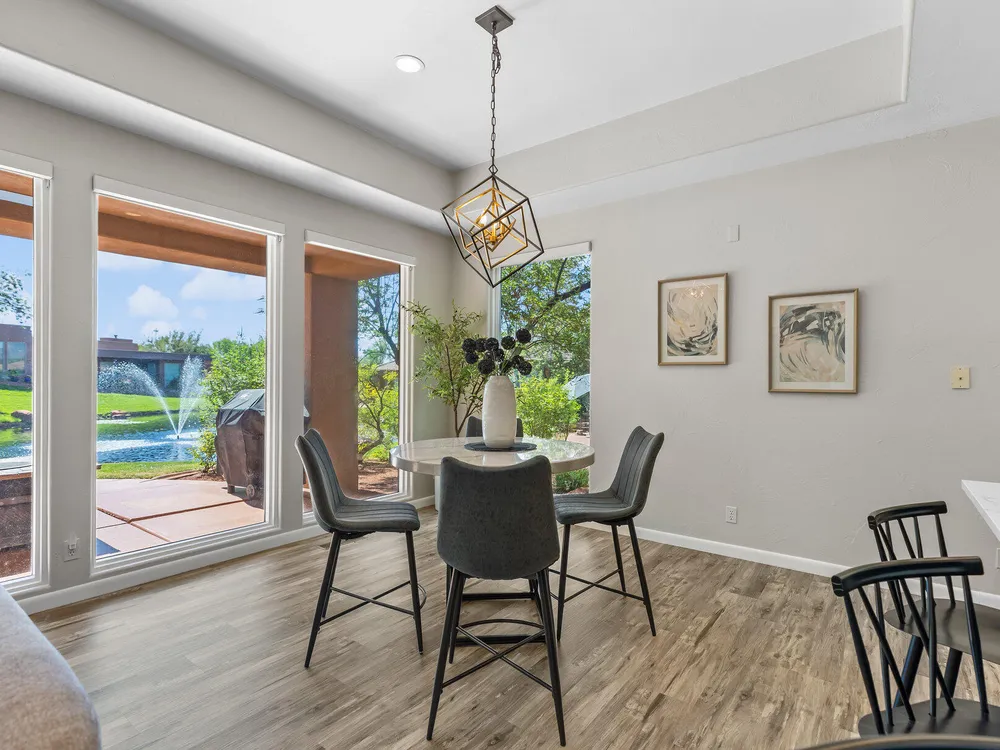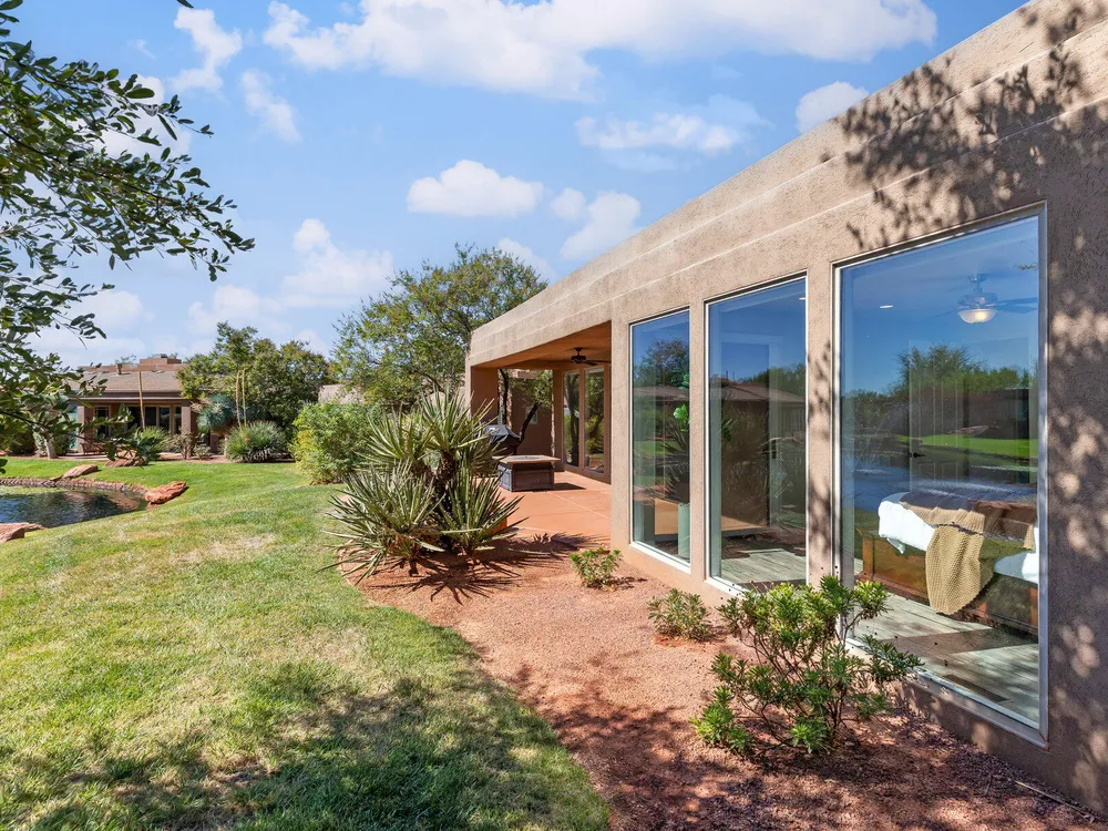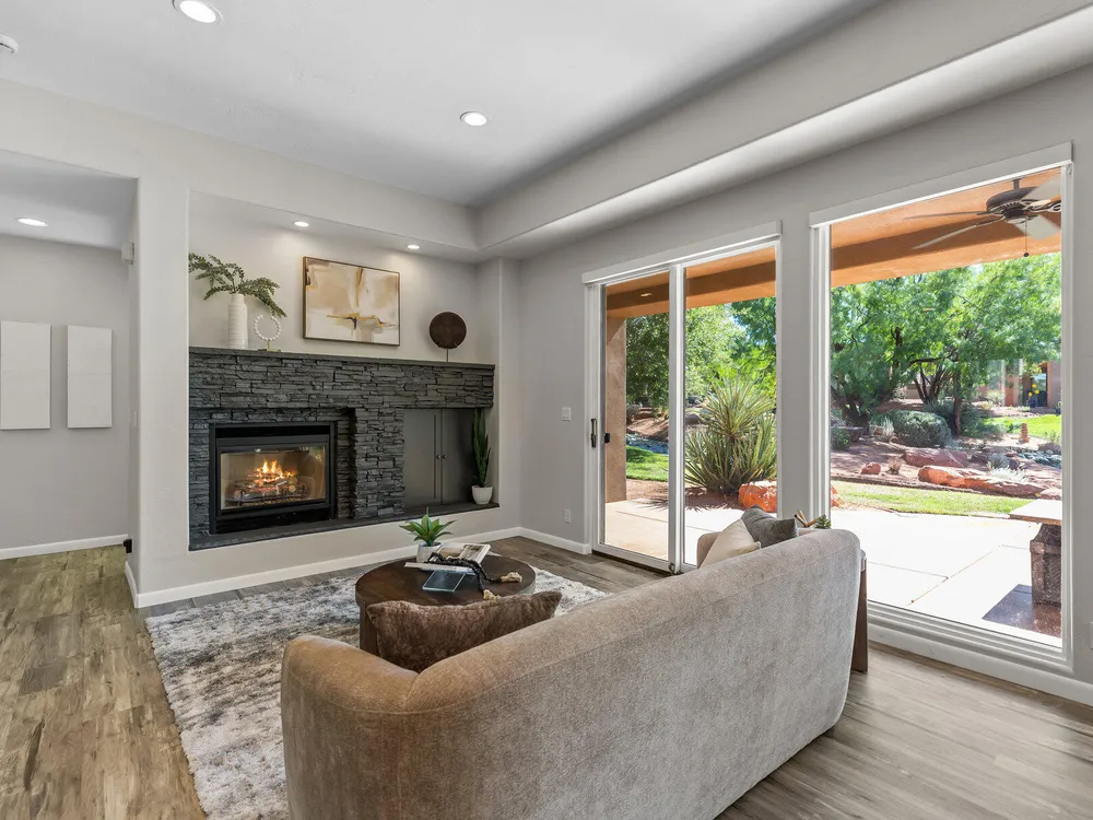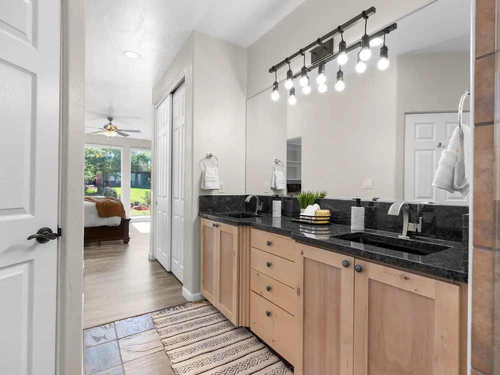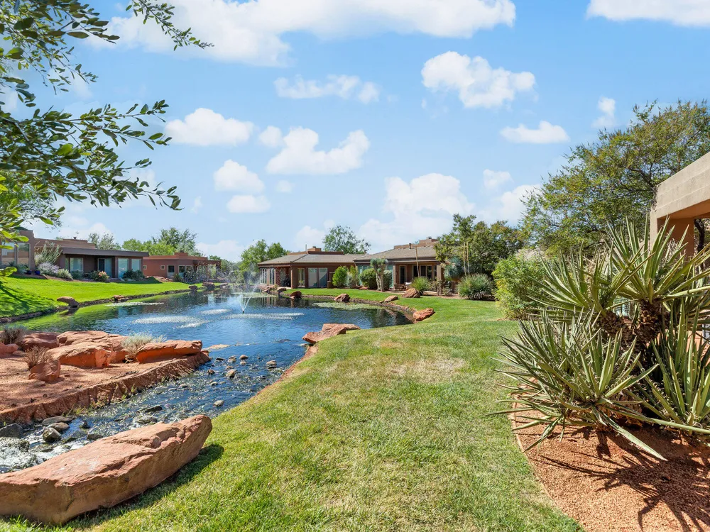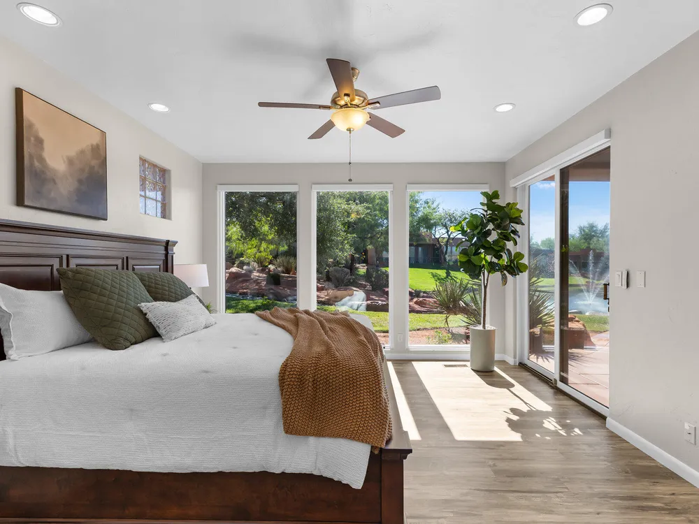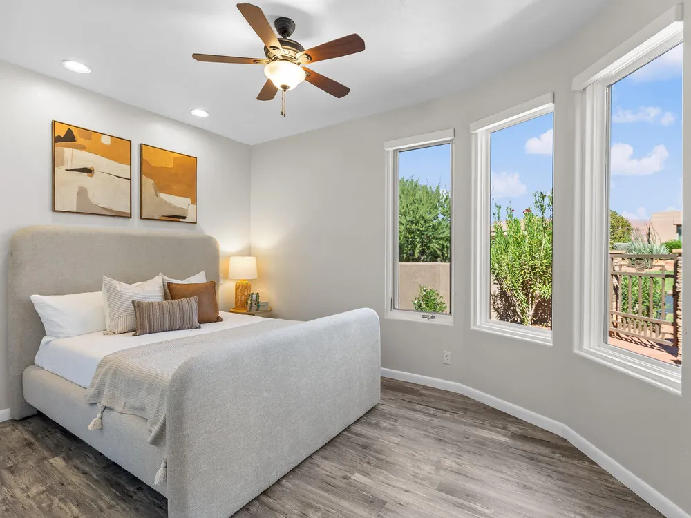 Set along the 3rd hole of Entrada's championship golf course, this beautifully remodeled home in Paiute Springs offers modern comfort and a resort-style lifestyle. A welcoming courtyard, highlighted by a striking glass-and-wood front door, opens to bright, open-concept living and kitchen spaces featuring beautiful wood floors throughout. The kitchen is a showpiece with an oversized island, custom gray wood cabinets, tile backsplash, modern light fixtures, and a bar—perfect for entertaining. The primary suite is a serene retreat, featuring oversized windows, a soaking tub, double vanity, and a generous walk-in closet. Throughout the home, large windows bring in natural light and frame views of the surrounding landscape. Outside, a covered patio overlooks a peaceful pond and water feature, creating an ideal spot for relaxing or entertaining. Residents enjoy world-class Entrada amenities, including indoor and outdoor pools, a clubhouse, fitness center, pickleball, volleyball, and basketball courts. With full landscaping and a prime golf course setting, this home blends Southern Utah's natural beauty with luxury living. The Entrada Golf Course features their recently redesigned course by the distinguished David McLay Kidd. As part of the Troon Prive Golf Course Network, Entrada has been rated the #2 best course in Utah with its par 72 course that extends across 7,280 yards of some of the most majestic desert landscape in the southwest. The community of Entrada includes a guard gate, clubhouse, two outdoor pools and spa, indoor pool, exquisite dining, fully equipped fitness center offering many fitness and yoga classes, tennis/pickleball courts, and a playground. The wellness center includes relaxing spa services such as facials, pedicures, massages, and body treatments. The community is centrally located in the beautiful city of Saint George, which is proud to now host the PGA Tour at Black Desert, multiple LPGA tournaments at Copper Rock, and many notable events, such as the World Championship of the Ironman, St. George Marathon, Red Bull Rampage, and tons of other amazing well-known events. It's only a short drive to America's most astonishing national parks, such as Zion, Bryce, and the North Rim of the Grand Canyon; and state parks and national forests like Snow Canyon, Sand Hollow Reservoir, Gunlock Reservoir, Quail Creek Reservoir, and Dixie Forest. The word is out that at 2,700 feet above sea level, on the edge of the Mojave desert, Colorado Plateau, and the Great Basin, lies one of America's most beautiful and distinctive geological places. This tranquil home is the perfect setting for you to establish your own gathering place in the heart of Southern Utah. Furniture package available. All information herein is deemed reliable but is not guaranteed. The buyer is responsible to verify all listing information, including square footage/acreage, to the buyer's own satisfaction.
