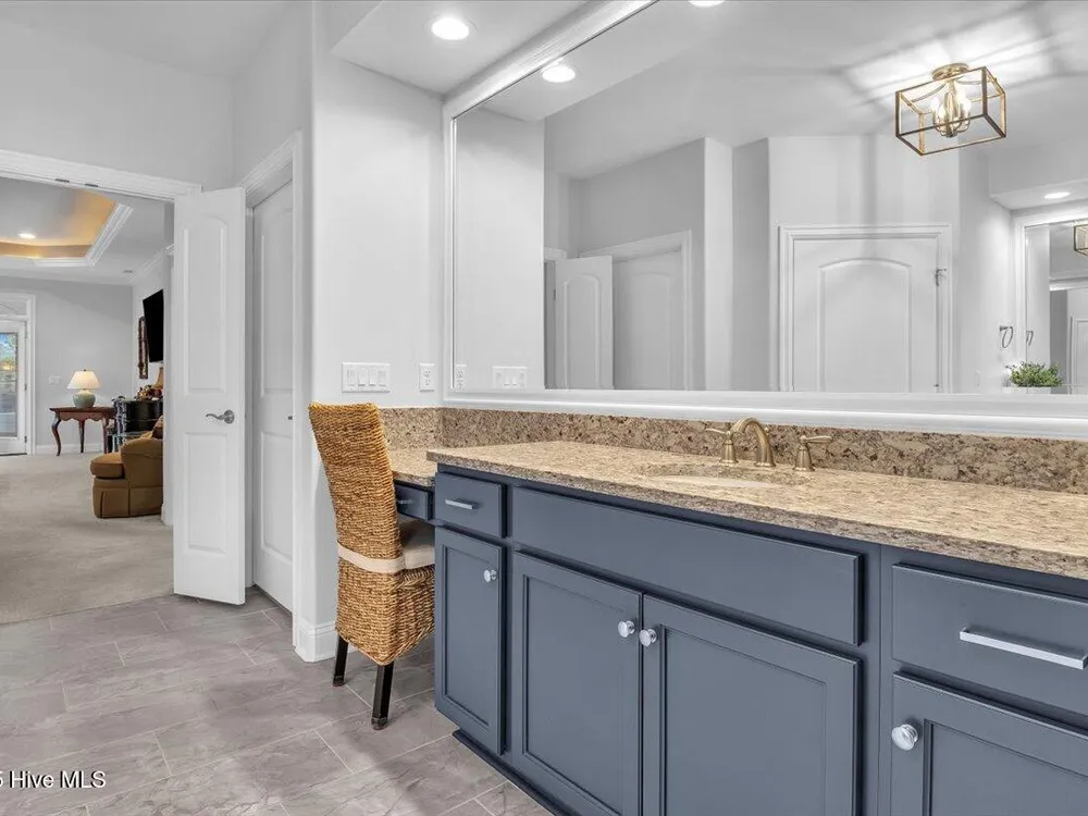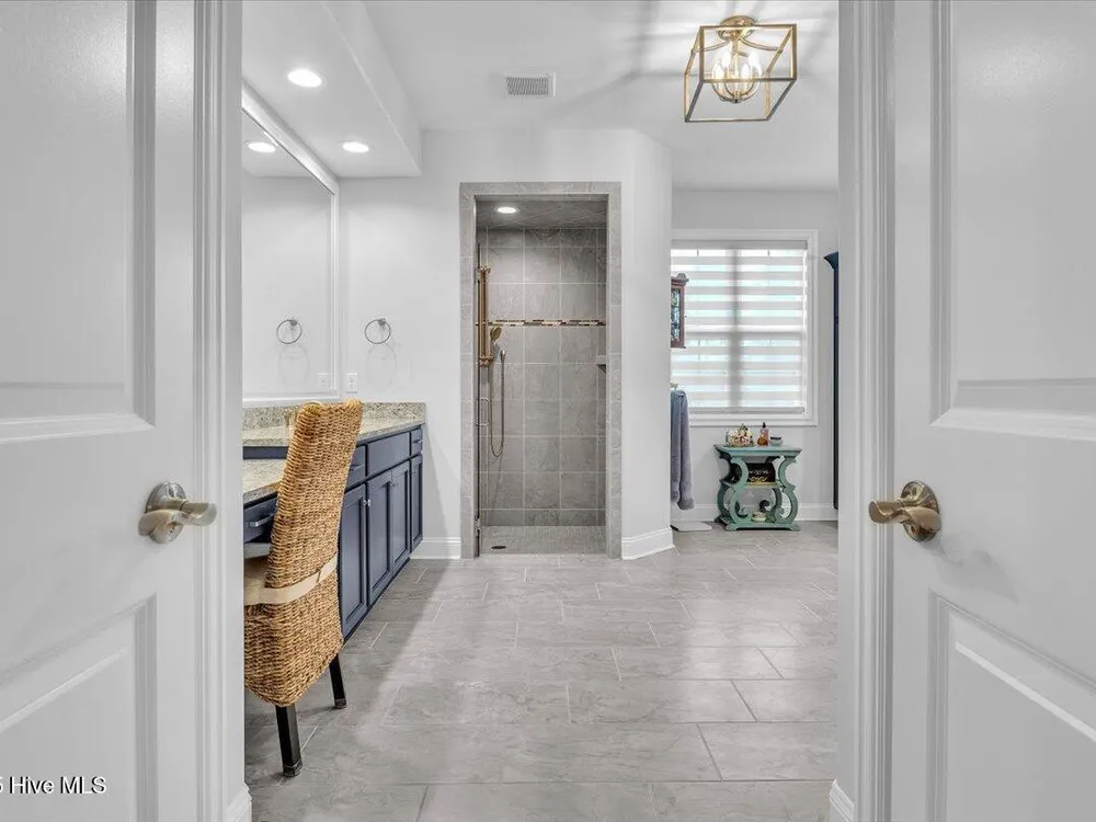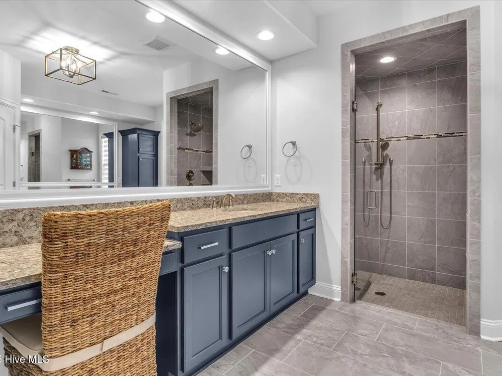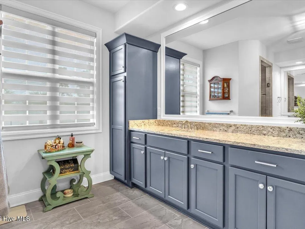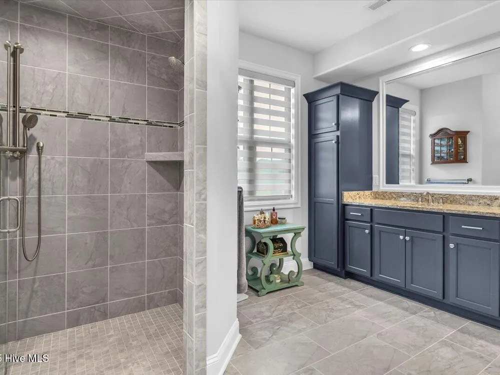 - Blinds/Shades, Solid Surface, Walk-In Closet(s), Walk-in Shower, Tray Ceiling(s), Entrance Foyer, Pantry, Mud Room, Master Downstairs, Kitchen Island, High Ceilings, Gas Log, Ceiling Fan(s), Bookcases