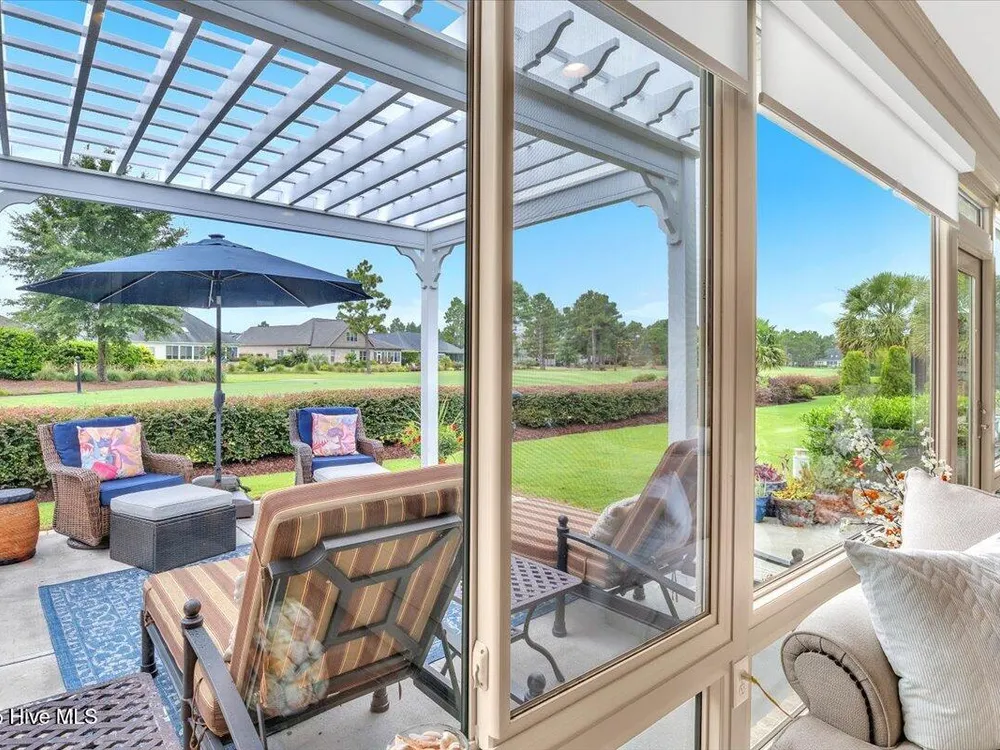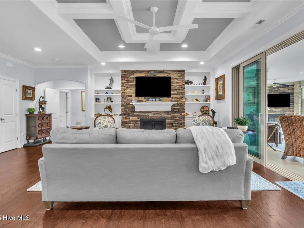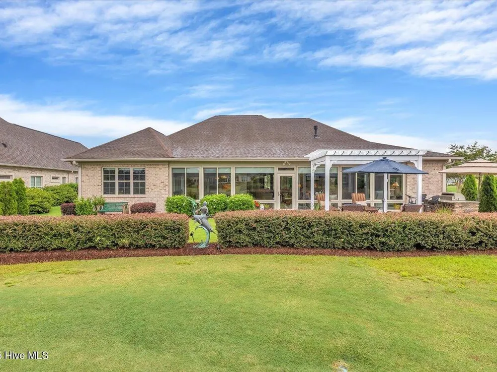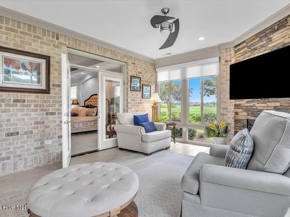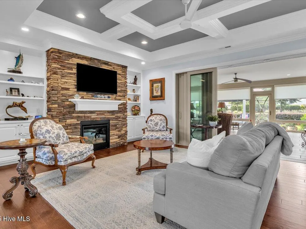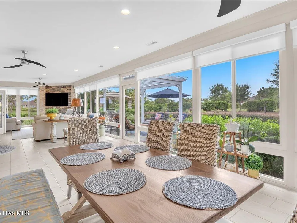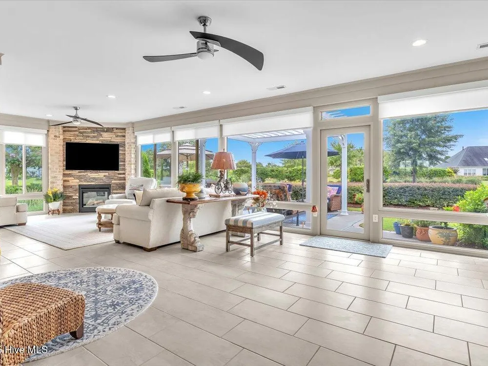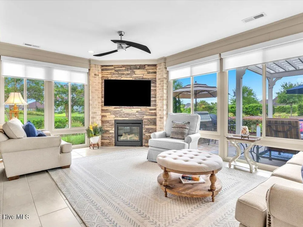 Presented for sale is this stunning executive home built by Coastal Luxury Homes, crafted for the discerning buyer. Thoughtfully designed and perfectly positioned along the par-3 8th fairway of the Rick Robbins Championship golf course, this home offers breathtaking tee-to-green and pond views every day. Located on a beautifully landscaped 1/3-acre lot in the prestigious Compass Pointe community, this light-filled, custom-built home exudes luxury. From the meticulously maintained split floor plan to the exquisite finishes, every detail has been carefully considered. Exterior curb appeal is unmatched, with professionally designed landscaping, lush greenery, and a no-outlet street that offers peace and privacy. Inside, you'll be immediately impressed as the open foyer reveals a direct view through the living room's stacked stone fireplace and out the telescoping glass doors to the expansive 736 sq/ft heated and cooled lanai. The chef's kitchen is a showstopper, featuring a massive quartz island, custom cabinetry, Kitchenaid appliances, gas range, wall ovens, Bosch refrigerator, Zephyr hood, tiled backsplash, under-cabinet lighting, and soft-close drawers with cabinet rollouts. The living, dining, office, and breakfast nook areas showcase custom built-ins, detailed moldings, and coffered ceilings, all framed by panoramic golf course views. Retreat to your private 312 sq/ft master suite, where you can relax in bed while enjoying views of the SECOND stacked stone fireplace and direct access to your spacious lanai through the French doors. The luxurious master bath includes dual granite vanities, two walk-in closets, and a zero-entry tiled shower. The 4-season room is a true highlight, with telescoping doors, tiled floors, a stacked stone fireplace, and a wall of windows that seamlessly connect the indoors to the beautifully landscaped exterior.