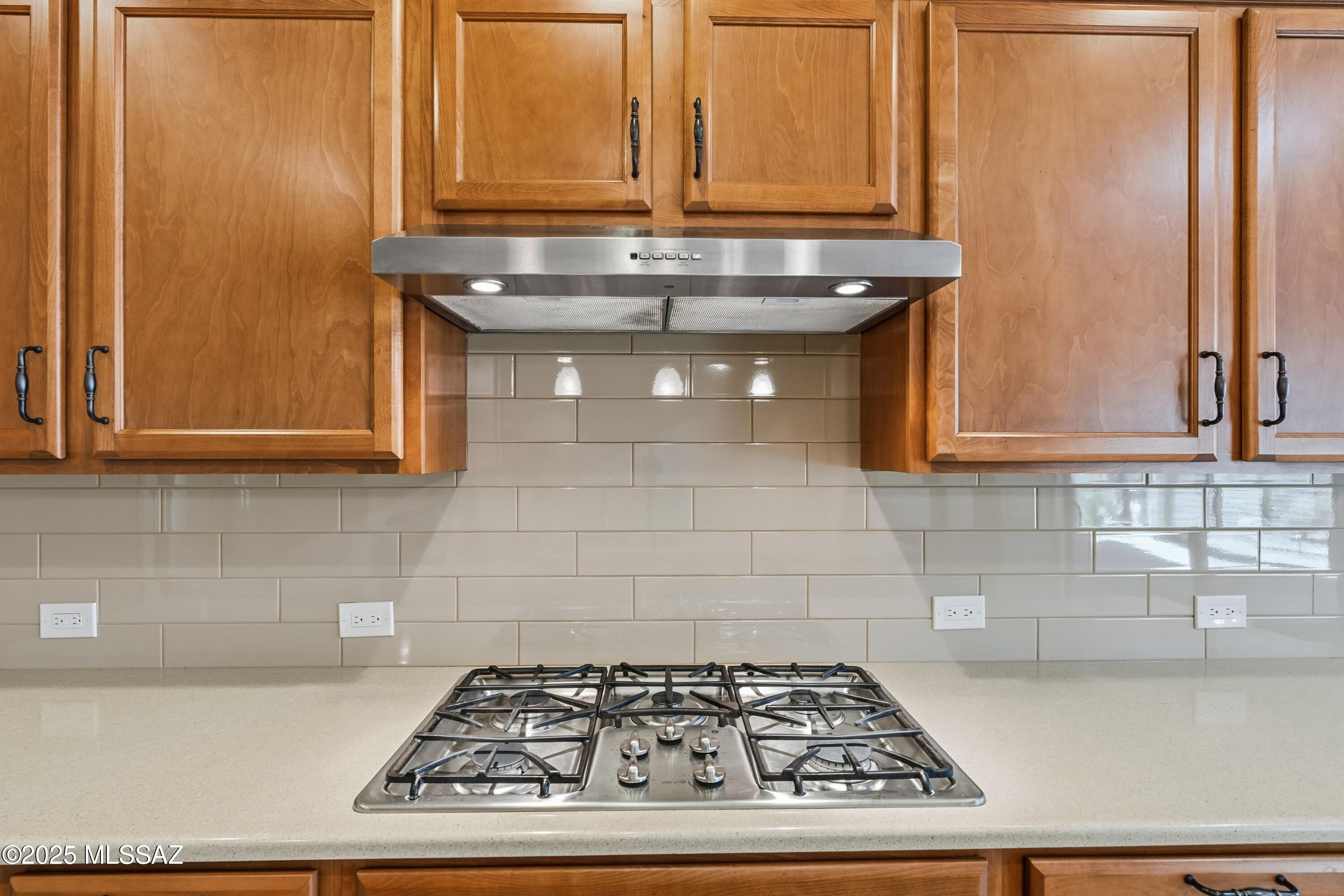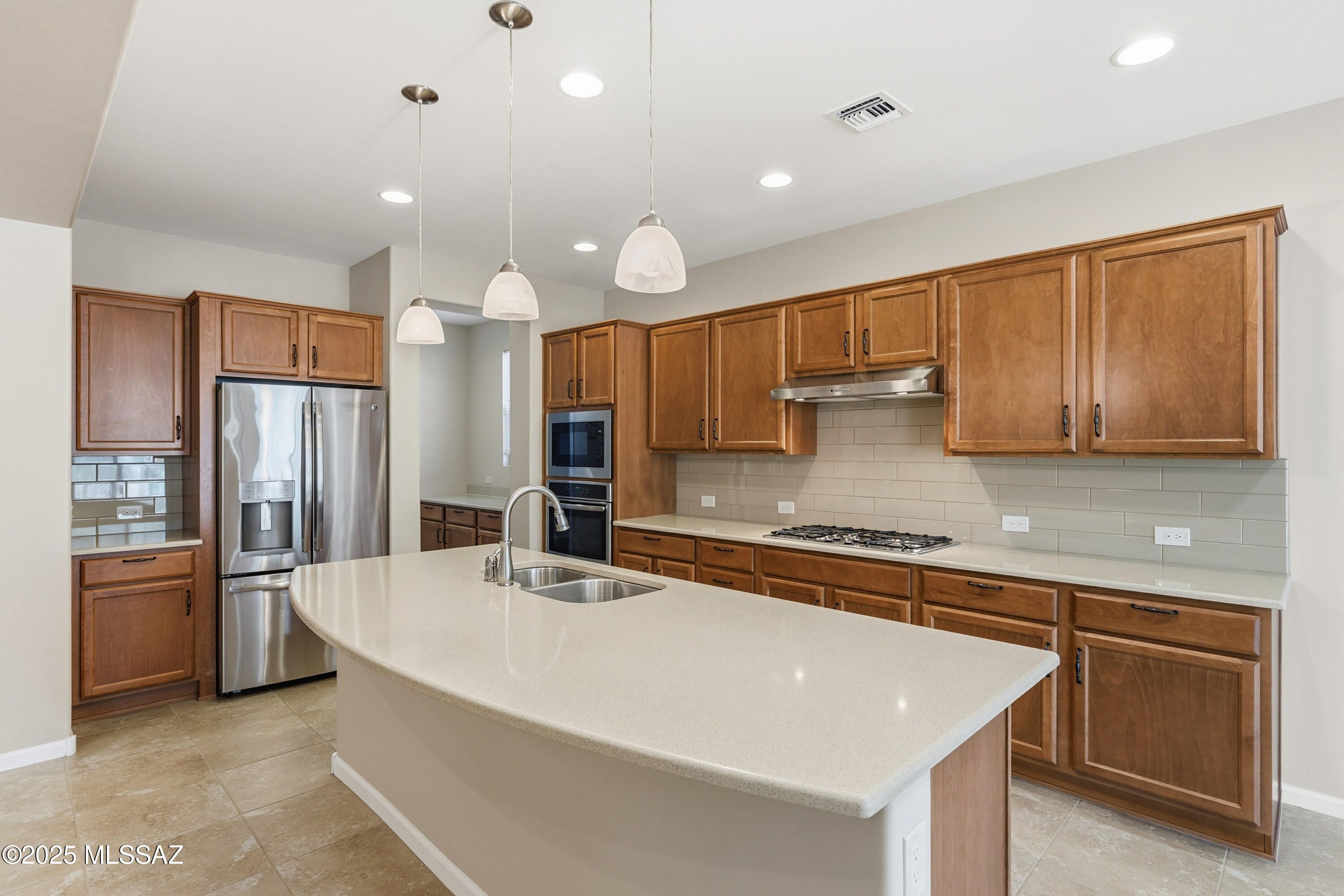 Crisp and clean and move-in ready! This 2,193 sq.ft. Pavona model resides on a corner lot in Quail Creek, offering 2 BR, 2.5 BA +Den. Interior features include tile floors throughout and neutral color palette to compliment any decor. Upgraded kitchen complete with center island, quartz counters, pendant lighting, stainless appliances incl. wall oven/microwave and gas cooktop, butler's pantry and walk-in storage pantry. Extended owner's suite w/ box bay window, dual vanity bath, soaking tub, separate shower, and large walk-in closet. Overnight guests enjoy private en suite bath. Separate Den, powder room, and large laundry with extra storage cabinets. Outback is an extended covered paver patio, built-in BBQ, and low care, desert landscape, all backing to common area with sunrise views.
