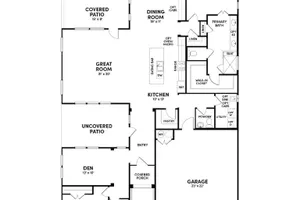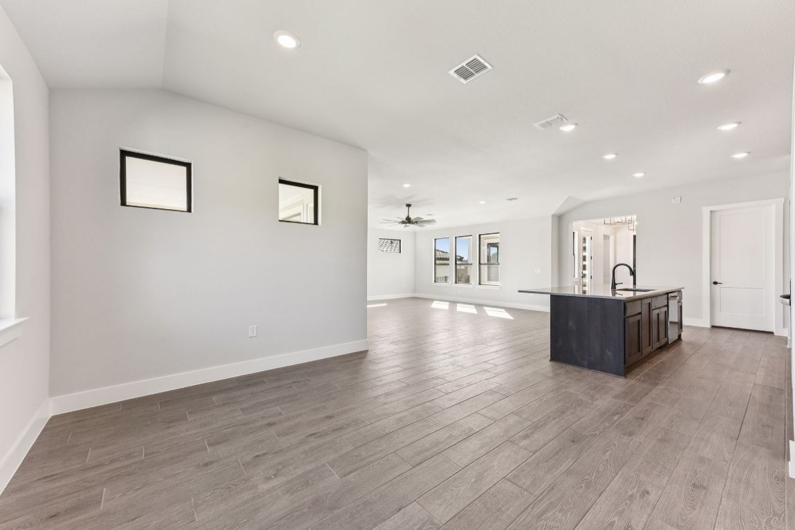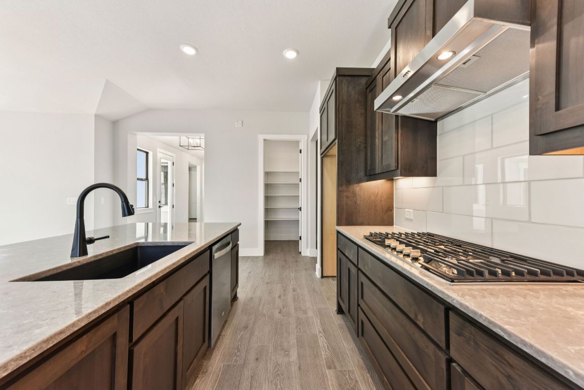 Trinity plan with upgraded kitchen, quartz countertops, upgraded tile flooring, optional study with double doors, optional shower in second bath, garage int mounted tankless water heater