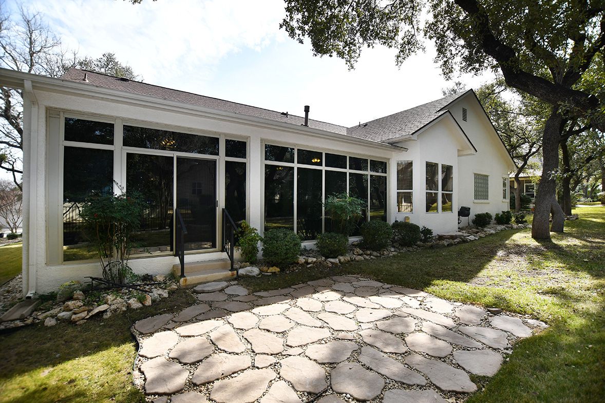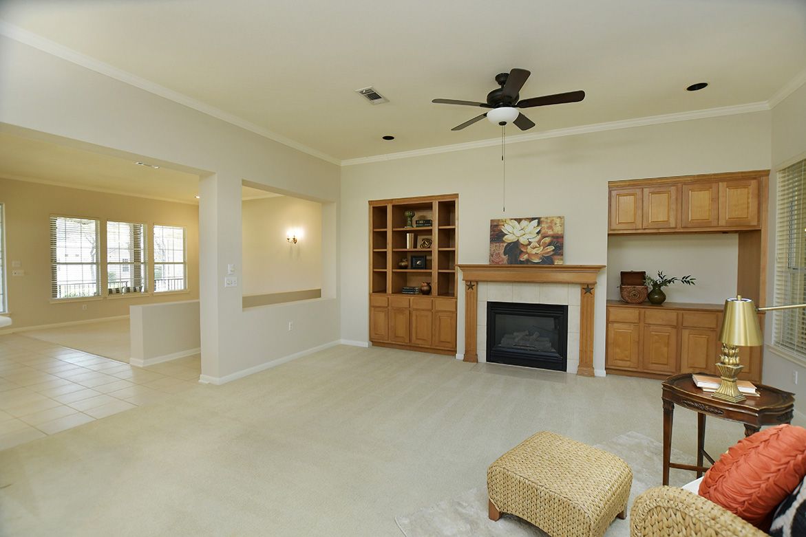Centrally located within the Sun City community - with easy access to Texas Drive main amenities center, Legacy Hills golf course and miles of nearby walking trails - this Colorado estate plan was built with 10-foot ceilings, side-entry golf cart garage door, 2 bedrooms, 2 full baths, powder room, 2 living, 2 dining plus a generously-sized study. It comfortably sits among mature trees and landscaping, and enjoys exterior landscape lighting. Recent interior paint freshens the walls, recent ceiling fans have been added, leaded glass inserts accent doors & windows, and a glass-enclosed sun porch provides extra space to enjoy. This warm & inviting home is waiting for someone to come in and make it their own! Recent Roof/Water Heater/Water Softener. Come live your best life in Sun City Texas!
