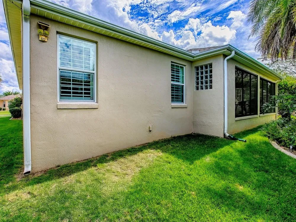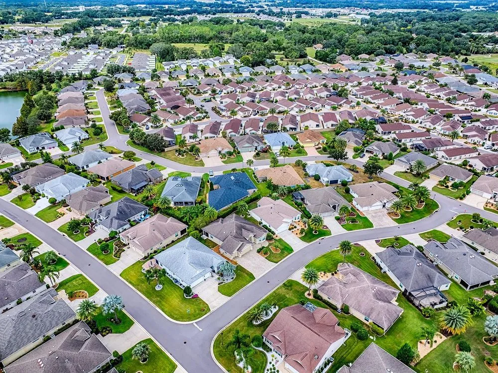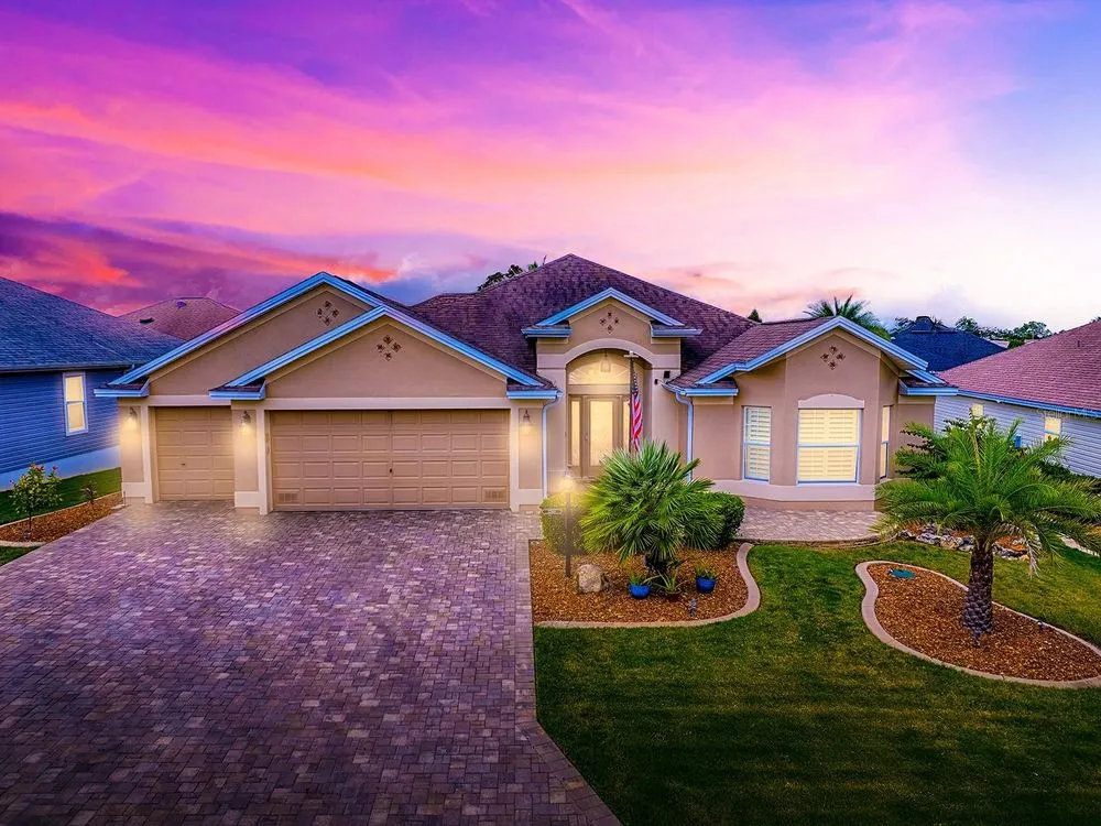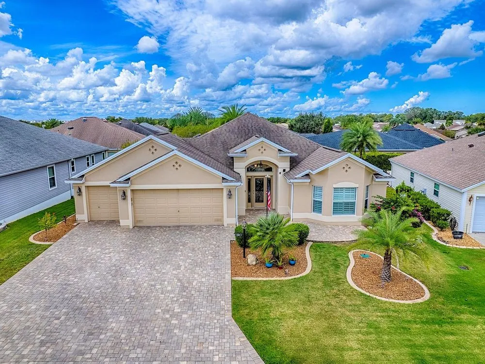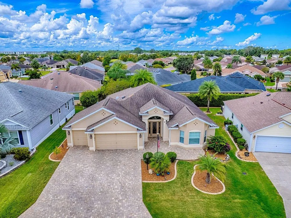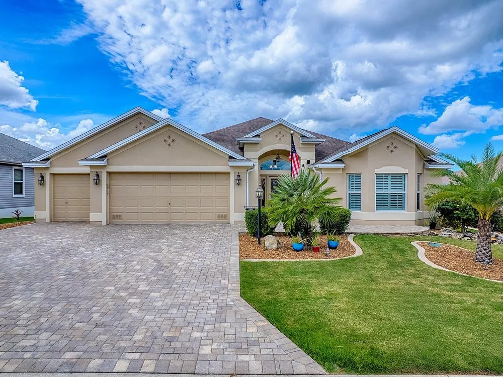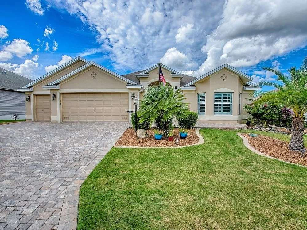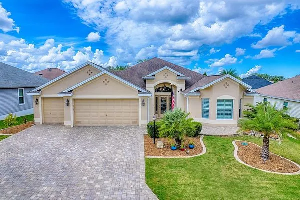 BOND PAID and TURNKEY! This stunning Designer Lily boasts a 2-Car with GOLF CART GARAGE in the Village of Tamarind Grove. From the moment you arrive, the artistic paver stone driveway and expanded patio set the tone, inviting you inside to discover more. Step inside through the decorative glass front door with sidelights into the foyer. The bright, sun-filled interior features a spacious open great room with volume ceilings, EXTENDED CROWN MOLDING, PLANTATION SHUTTERS, and tile laid on the diagonal, with cozy carpet in the bedrooms. The formal dining room has ample space to entertain guests, while the inviting breakfast nook, with a view of the lush, filtered sunlight backyard, is the perfect spot for more casual dining. A SOLAR TUBE illuminates the gourmet kitchen which is designed for both style and function. The kitchen showcases maple cabinetry with pull-outs, GRANITE countertops, tile backsplash, under-cabinet lighting, double wall ovens, and a GAS cooktop stove. A stylish breakfast bar provides even more seating with convenient foot ledge for comfort. The owner’s retreat offers elegance and comfort with a tray ceiling with rope lighting, and a large walk-in closet. The primary bathroom is complete with dual sinks, a separate toilet room, and a luxurious ROMAN SHOWER. An extra-large guest bedroom is located at the front of the home, featuring a bay window and a double-door closet. A second guest bedroom also features a double-door closet and is situated just outside the guest bath. The well-appointed guest bath features a tile-lined shower with a decorative glass surround. Practicality meets convenience in the laundry room, complete with wall cabinets and a utility sink. Expansive stack-back sliding glass doors open to an oversized glass-enclosed lanai, complete with a spectacular SUMMER KITCHEN full BBQ grill and dual burner side stove, sink, mini-fridge, and permanent gas line to a buried propane tank—perfect for entertaining. The 2-car garage with TANDEM GOLF CART GARAGE is climate-controlled with an HVAC MINI-SPLIT and includes epoxy floors, pull-down attic stairs, secondary full-size refrigerator, workbench, an electronic water softener, and a WHOLE-HOUSE WATER FILTRATION SYSTEM. Additional upgrades include hideaway screen on the front door, landscape lighting, GARAGE DOOR SCREEN, lanai blinds, and fresh interior paint. Great location close to Lake Sumter Landing and Brownwood Paddock Square, Several pools and rec centers, and four executive golf courses are just a quick golf cart ride away. Shopping and Restaurants are also close by on 466A. Come fall in love and make this your next home!