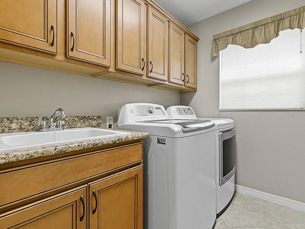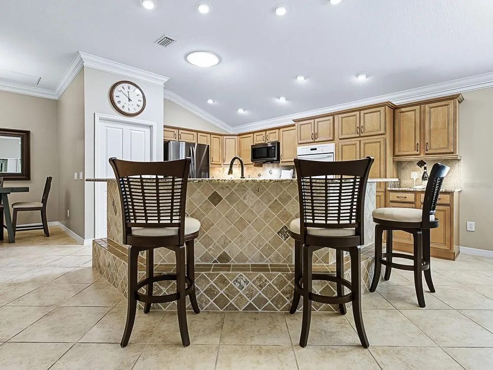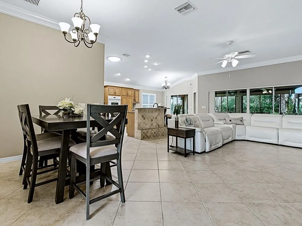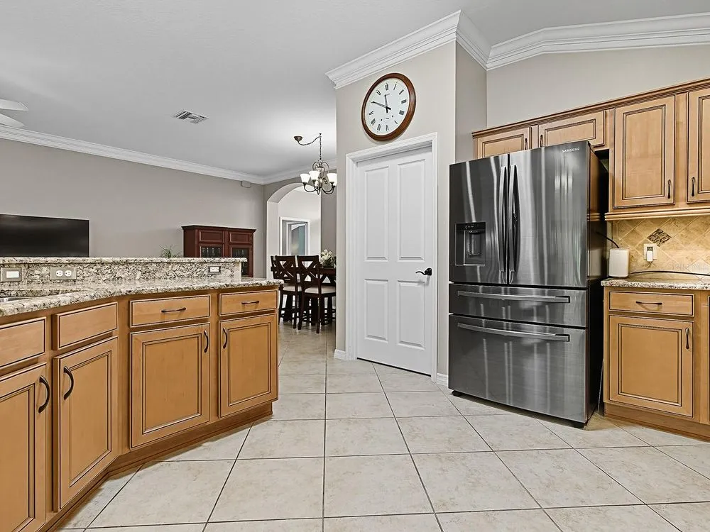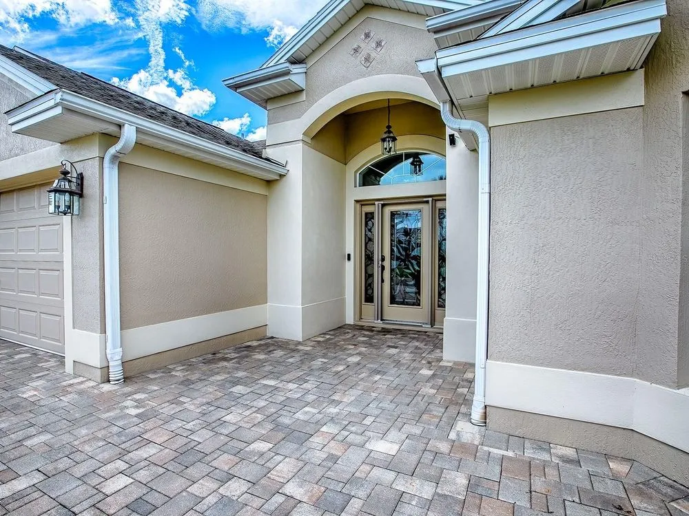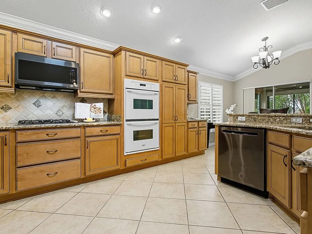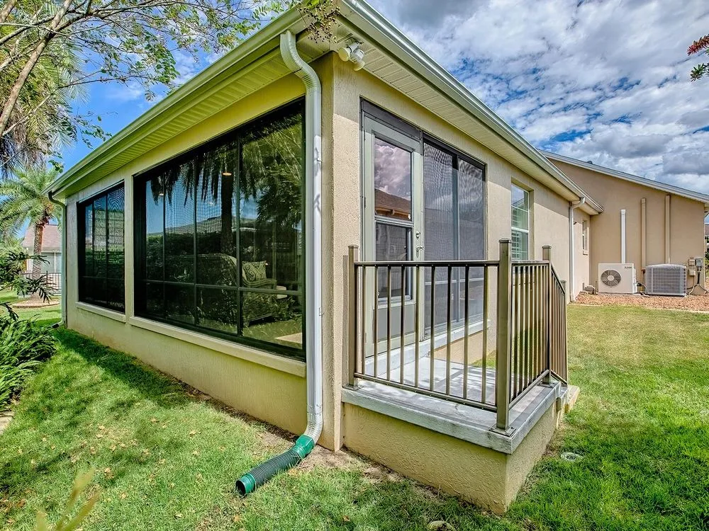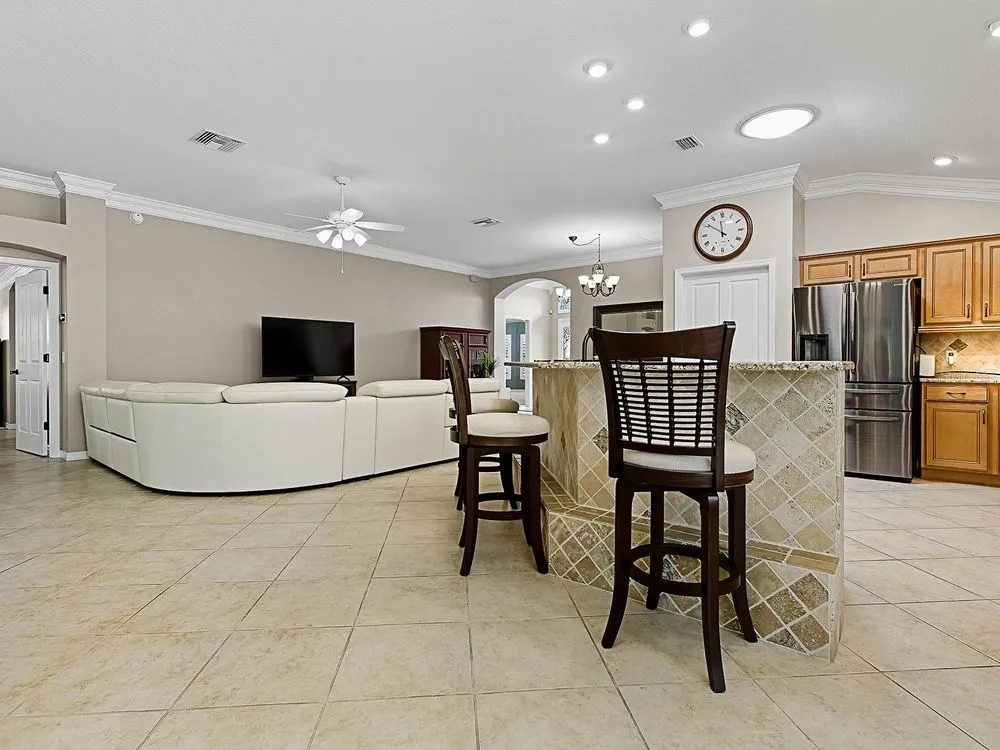 BOND PAID and TURNKEY! This stunning Designer Lily boasts a 2-Car with GOLF CART GARAGE in the Village of Tamarind Grove. From the moment you arrive, the artistic paver stone driveway and expanded patio set the tone, inviting you inside to discover more. Step inside through the decorative glass front door with sidelights into the foyer. The bright, sun-filled interior features a spacious open great room with volume ceilings, EXTENDED CROWN MOLDING, PLANTATION SHUTTERS, and tile laid on the diagonal, with cozy carpet in the bedrooms. The formal dining room has ample space to entertain guests, while the inviting breakfast nook, with a view of the lush, filtered sunlight backyard, is the perfect spot for more casual dining. A SOLAR TUBE illuminates the gourmet kitchen which is designed for both style and function. The kitchen showcases maple cabinetry with pull-outs, GRANITE countertops, tile backsplash, under-cabinet lighting, double wall ovens, and a GAS cooktop stove. A stylish breakfast bar provides even more seating with convenient foot ledge for comfort. The owner’s retreat offers elegance and comfort with a tray ceiling with rope lighting, and a large walk-in closet. The primary bathroom is complete with dual sinks, a separate toilet room, and a luxurious ROMAN SHOWER. An extra-large guest bedroom is located at the front of the home, featuring a bay window and a double-door closet. A second guest bedroom also features a double-door closet and is situated just outside the guest bath. The well-appointed guest bath features a tile-lined shower with a decorative glass surround. Practicality meets convenience in the laundry room, complete with wall cabinets and a utility sink. Expansive stack-back sliding glass doors open to an oversized glass-enclosed lanai, complete with a spectacular SUMMER KITCHEN full BBQ grill and dual burner side stove, sink, mini-fridge, and permanent gas line to a buried propane tank—perfect for entertaining. The 2-car garage with TANDEM GOLF CART GARAGE is climate-controlled with an HVAC MINI-SPLIT and includes epoxy floors, pull-down attic stairs, secondary full-size refrigerator, workbench, an electronic water softener, and a WHOLE-HOUSE WATER FILTRATION SYSTEM. Additional upgrades include hideaway screen on the front door, landscape lighting, GARAGE DOOR SCREEN, lanai blinds, and fresh interior paint. Great location close to Lake Sumter Landing and Brownwood Paddock Square, Several pools and rec centers, and four executive golf courses are just a quick golf cart ride away. Shopping and Restaurants are also close by on 466A. Come fall in love and make this your next home!