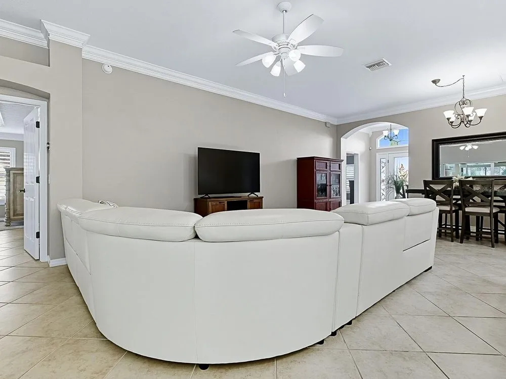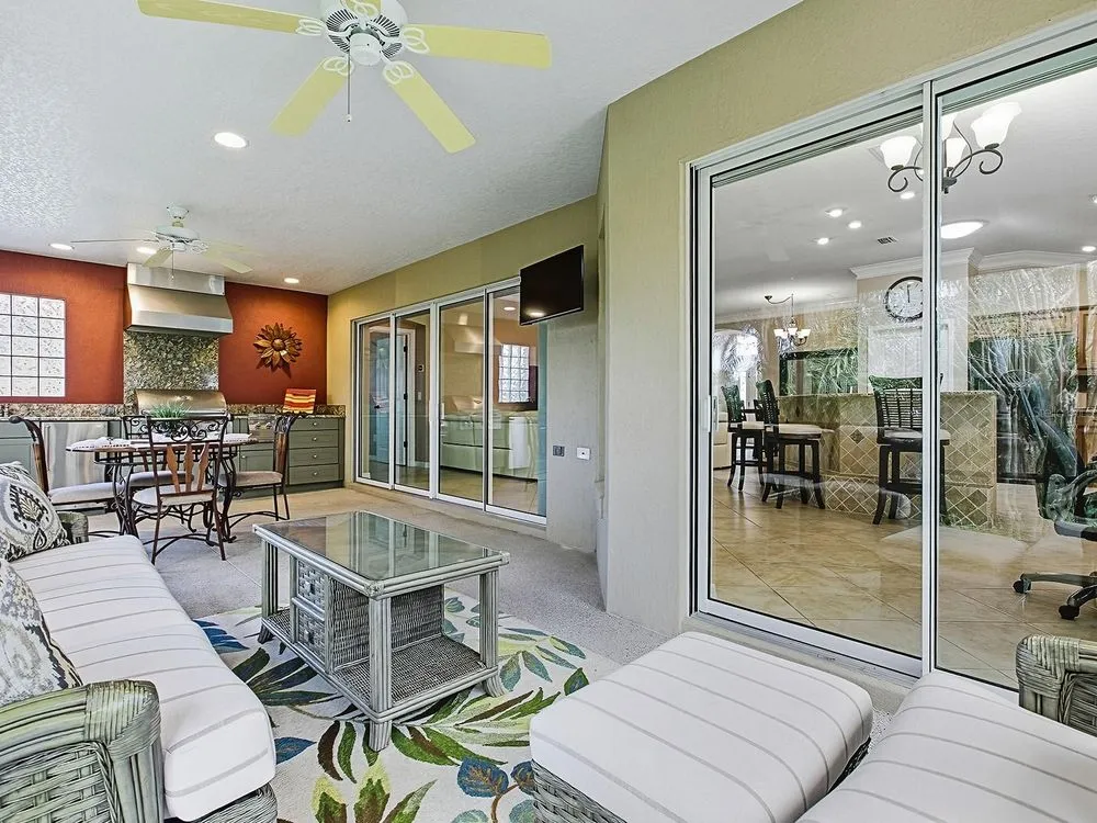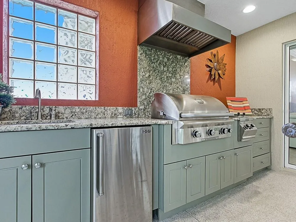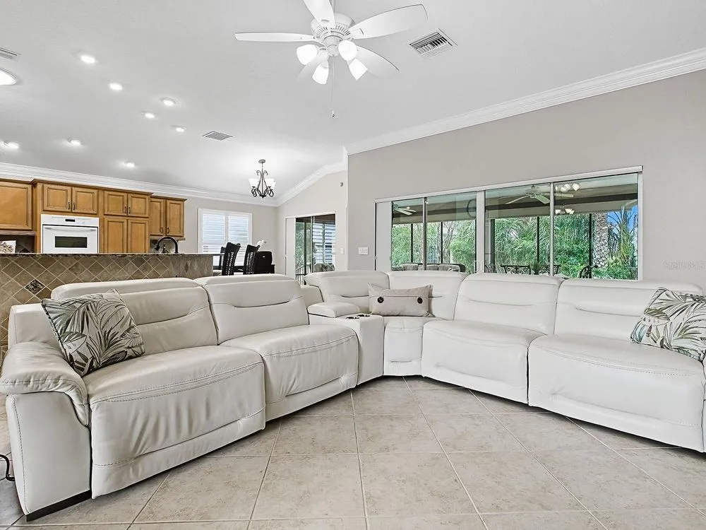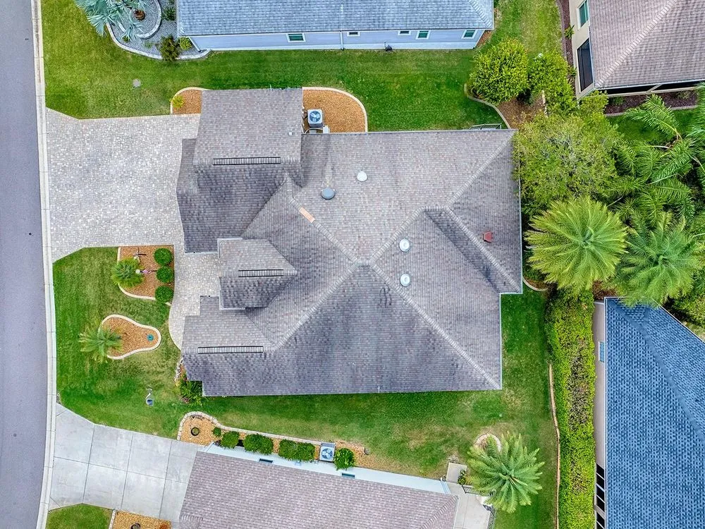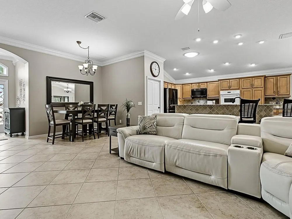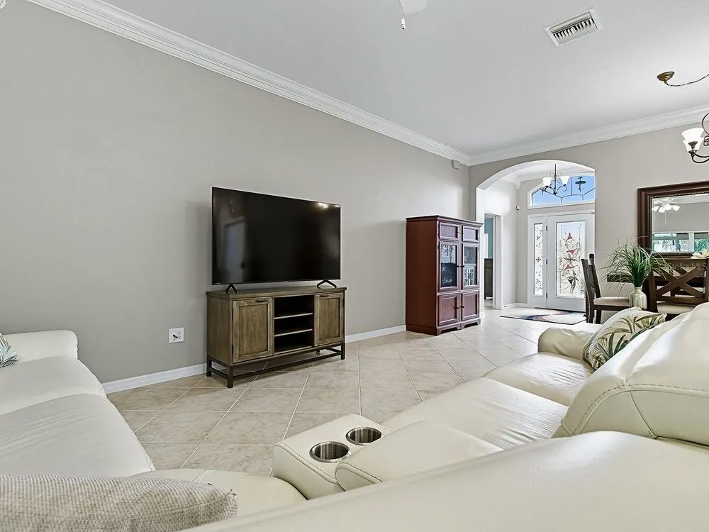 BOND PAID and TURNKEY! This stunning Designer Lily boasts a 2-Car with GOLF CART GARAGE in the Village of Tamarind Grove. From the moment you arrive, the artistic paver stone driveway and expanded patio set the tone, inviting you inside to discover more. Step inside through the decorative glass front door with sidelights into the foyer. The bright, sun-filled interior features a spacious open great room with volume ceilings, EXTENDED CROWN MOLDING, PLANTATION SHUTTERS, and tile laid on the diagonal, with cozy carpet in the bedrooms. The formal dining room has ample space to entertain guests, while the inviting breakfast nook, with a view of the lush, filtered sunlight backyard, is the perfect spot for more casual dining. A SOLAR TUBE illuminates the gourmet kitchen which is designed for both style and function. The kitchen showcases maple cabinetry with pull-outs, GRANITE countertops, tile backsplash, under-cabinet lighting, double wall ovens, and a GAS cooktop stove. A stylish breakfast bar provides even more seating with convenient foot ledge for comfort. The owner’s retreat offers elegance and comfort with a tray ceiling with rope lighting, and a large walk-in closet. The primary bathroom is complete with dual sinks, a separate toilet room, and a luxurious ROMAN SHOWER. An extra-large guest bedroom is located at the front of the home, featuring a bay window and a double-door closet. A second guest bedroom also features a double-door closet and is situated just outside the guest bath. The well-appointed guest bath features a tile-lined shower with a decorative glass surround. Practicality meets convenience in the laundry room, complete with wall cabinets and a utility sink. Expansive stack-back sliding glass doors open to an oversized glass-enclosed lanai, complete with a spectacular SUMMER KITCHEN full BBQ grill and dual burner side stove, sink, mini-fridge, and permanent gas line to a buried propane tank—perfect for entertaining. The 2-car garage with TANDEM GOLF CART GARAGE is climate-controlled with an HVAC MINI-SPLIT and includes epoxy floors, pull-down attic stairs, secondary full-size refrigerator, workbench, an electronic water softener, and a WHOLE-HOUSE WATER FILTRATION SYSTEM. Additional upgrades include hideaway screen on the front door, landscape lighting, GARAGE DOOR SCREEN, lanai blinds, and fresh interior paint. Great location close to Lake Sumter Landing and Brownwood Paddock Square, Several pools and rec centers, and four executive golf courses are just a quick golf cart ride away. Shopping and Restaurants are also close by on 466A. Come fall in love and make this your next home!