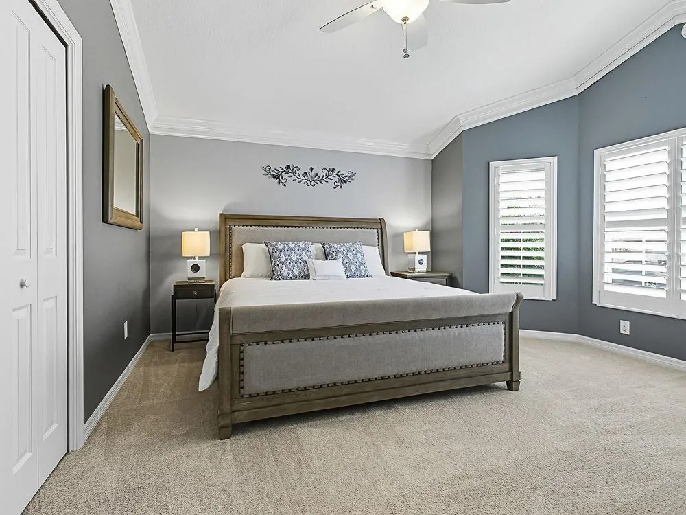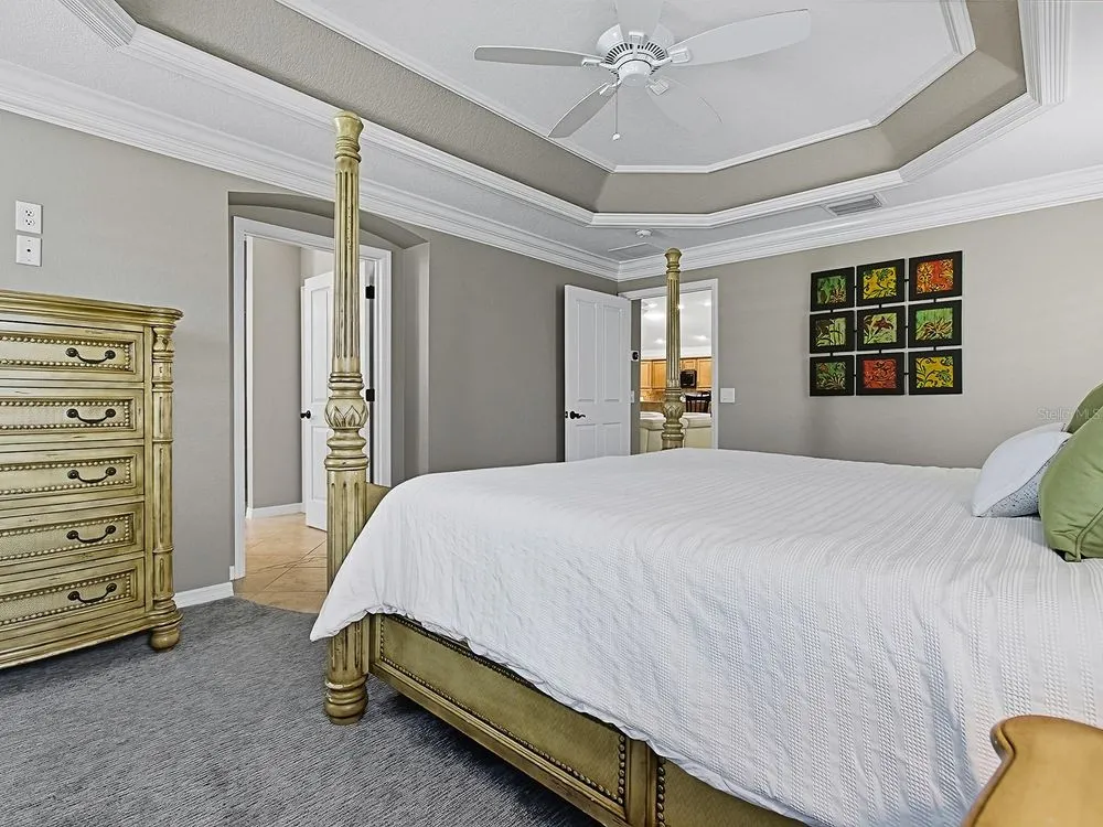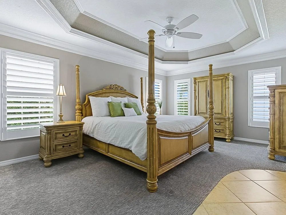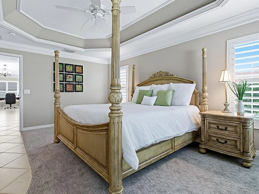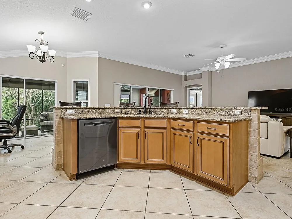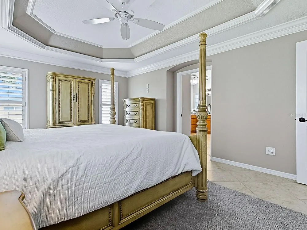 - Ceiling Fan(s), Crown Molding, High Ceilings, Kitchen/Family Room Combo, Living/Dining Room, Open Floorplan, Split Bedrooms, Stone Counters, Tray Ceiling(s), Walk-In Closet(s), Window Treatments