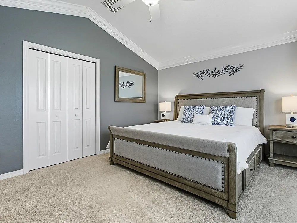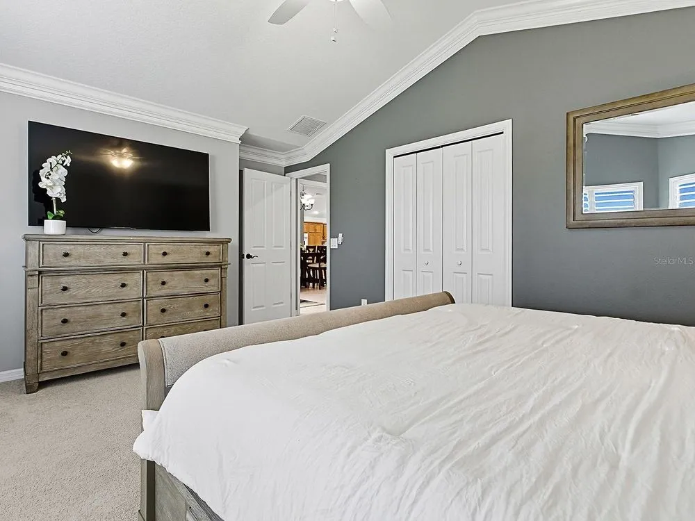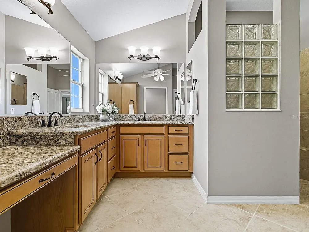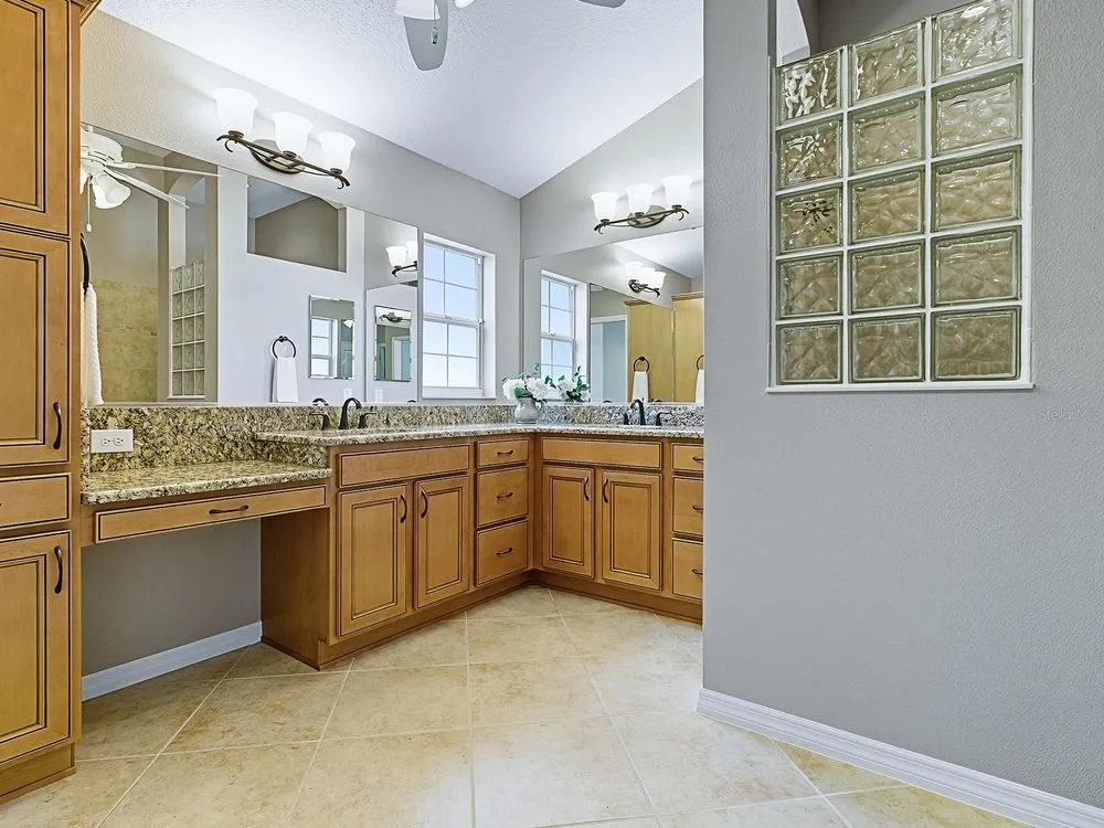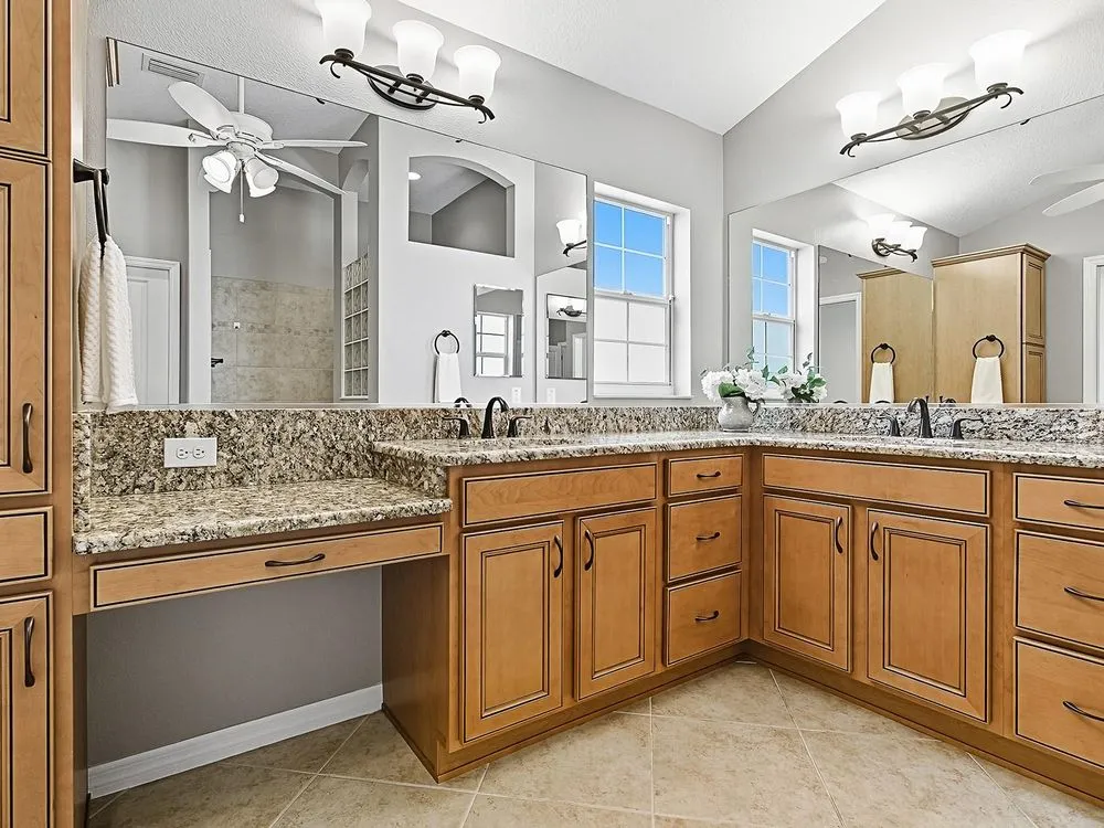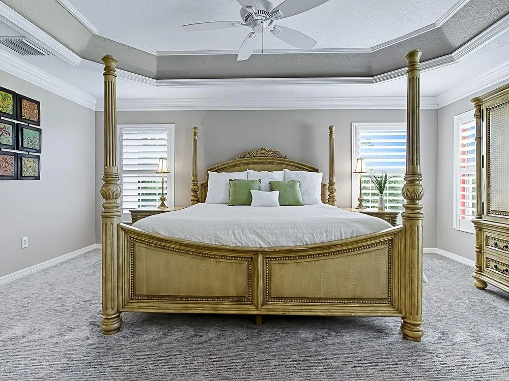 - Ceiling Fan(s), Crown Molding, High Ceilings, Kitchen/Family Room Combo, Living/Dining Room, Open Floorplan, Split Bedrooms, Stone Counters, Tray Ceiling(s), Walk-In Closet(s), Window Treatments