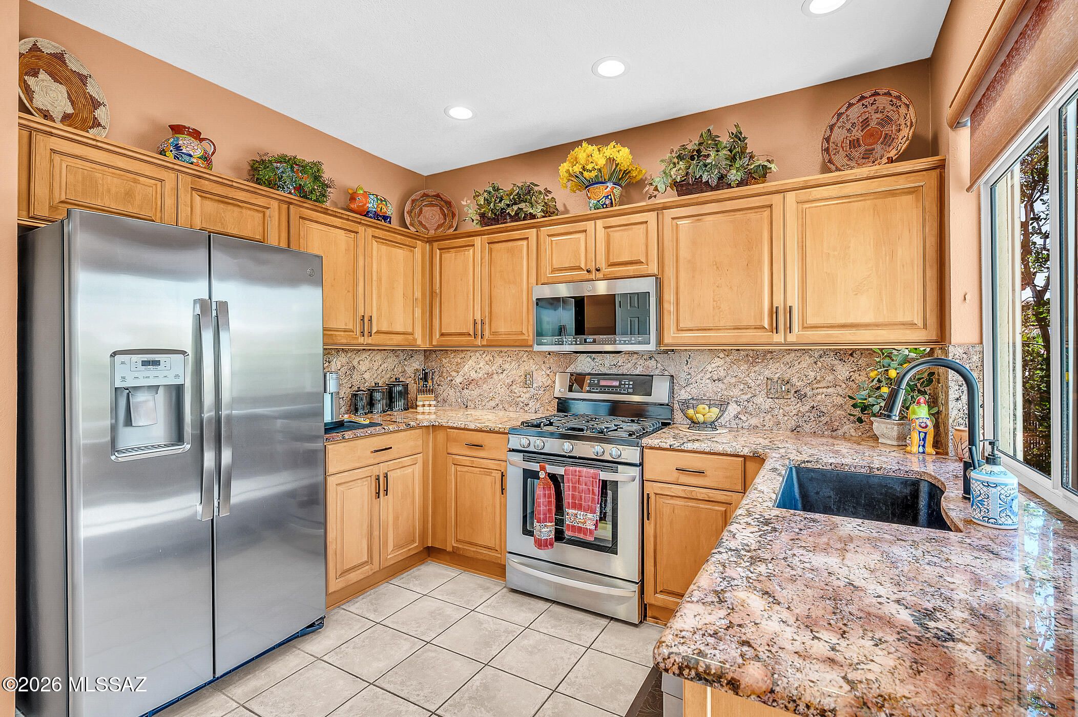 If a gorgeous, updated, turnkey home on a beautiful desert & mountain view lot is what you're looking for, look no further! Upon entering, you'll want to call this wonderful property ''Home''. With beautiful upgrades throughout, high quality furnishings & most of the artwork included, you'll soon be enjoying your new life in the highly desirable community of Sun City Oro Valley. The light & bright kitchen has pretty granite countertops, updated cabinets, stainless steel appliances, separate pantry & breakfast nook overlooking the beautifully landscaped & fully fenced backyard. You'll enjoy Catalina Mountain views from the kitchen, dining nook, living room & the Primary bedroom. Entertaining is easy in the welcoming living & dining rooms. The Primary bedroom boasts a bay window & sliding