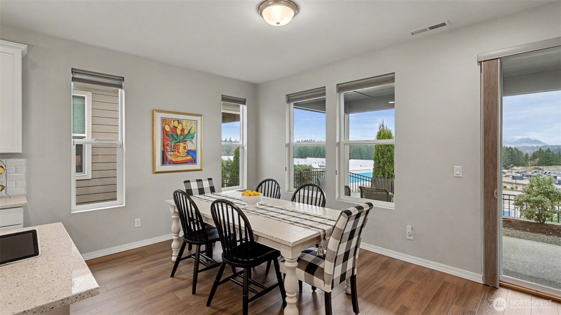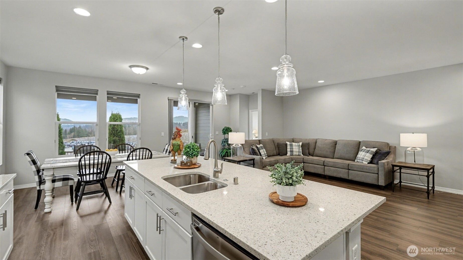 Welcome to your next chapter at Meadow Ridge, a sought-after 55+ community in the heart of Maple Valley. This thoughtfully designed 2-bedroom, 2.5-bath rambler offers comfortable single-level living, stunning territorial views, and a peaceful neighborhood setting. Built in 2021, the home blends modern finishes with a light-filled, open layout. The kitchen anchors the living space with quartz countertops, a large island, gas cooktop, and high-end appliances—perfect for hosting gatherings or enjoying a quiet evening at home. Luxury vinyl plank flooring flows throughout the main living areas and bedrooms, creating both durability and style. A versatile bonus/den space provides flexibility for a home office, hobby room, or additional living area. Large windows frame beautiful views and fill the home with natural light. Step outside to the covered concrete patio, an inviting space to start the day with coffee or unwind in the evening while taking in mountain views and fresh air. Additional features include upgraded Hunter Douglas window treatments with blackout shades in both bedrooms, HardiePlank siding, AC, and modern construction built in 2021. Meadow Ridge residents also enjoy access to a neighborhood clubhouse available for gatherings and events, and the HOA fee includes front yard maintenance. Ideally located near Maple Valley shops, restaurants, parks, and local amenities, this home offers convenient, low-maintenance living in a welcoming community.