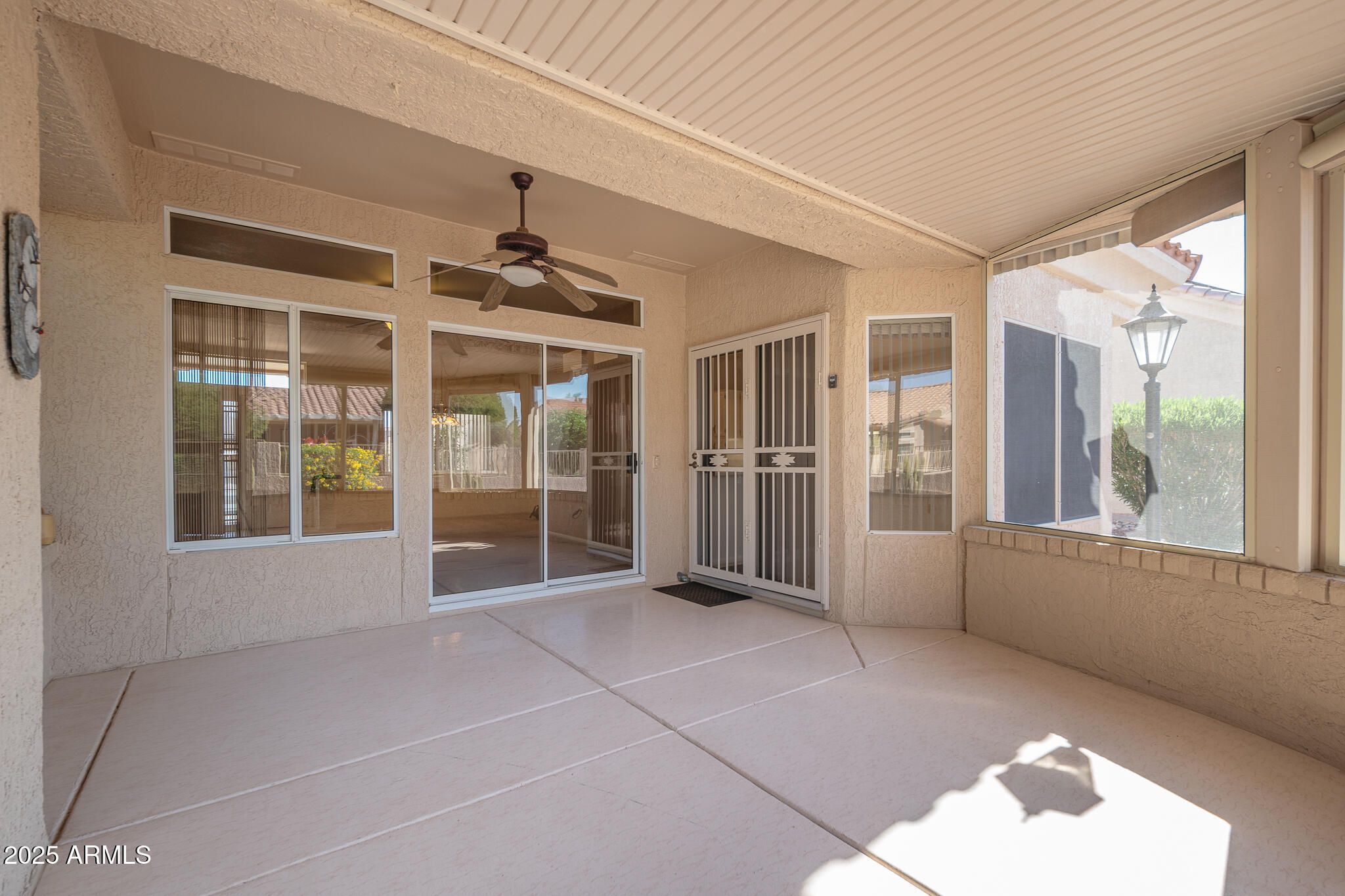 Welcome to Sun City West! This popular Cameron model offers a desirable split floor plan with two bedrooms and two bathrooms across 1,337 sq. ft. The spacious great room includes a dining area and access to the backyard. Enjoy your morning coffee on the covered front patio or the extended, screened-in patio out back. The eat-in kitchen provides additional access to the rear patio, perfect for indoor-outdoor living. The garage features built-in storage and a utility sink for added convenience. Solar panels help improve energy efficiency and reduce utility costs. Located just down the road from the community center, residents enjoy access to amenities including tennis, swimming, pickleball, and more. This well-maintained home is ready for its next owner to enjoy the Sun City West lifestyle