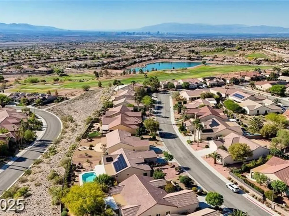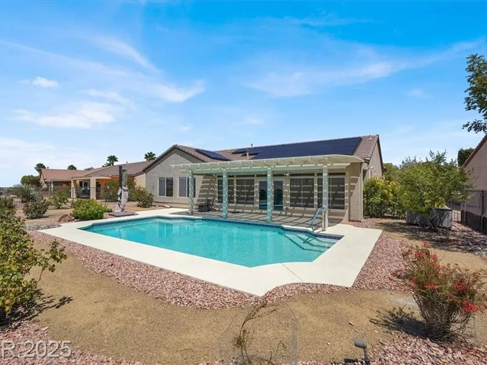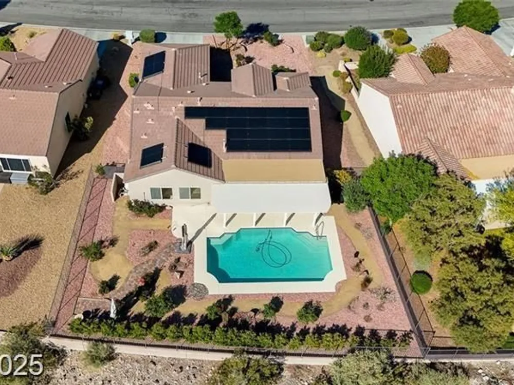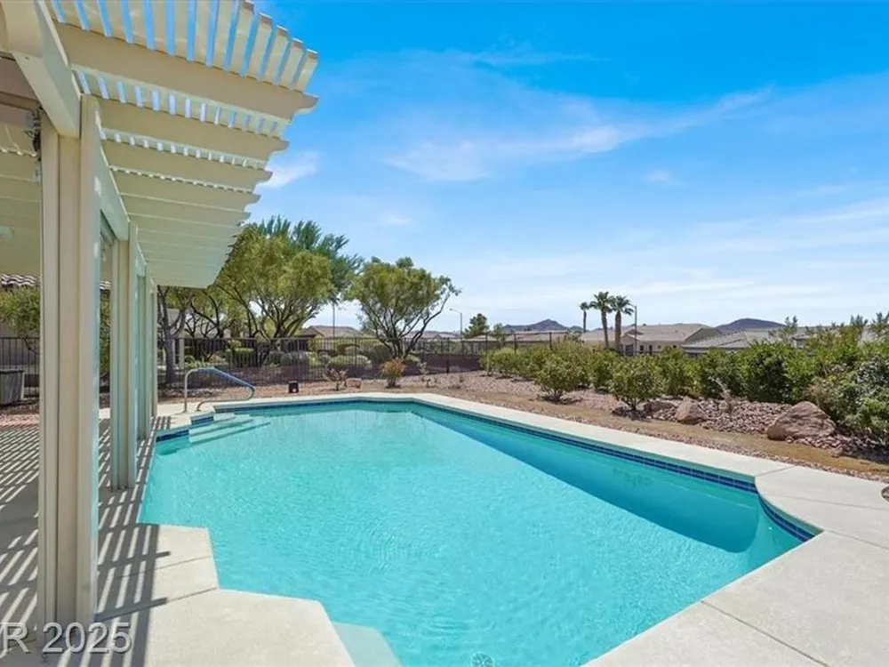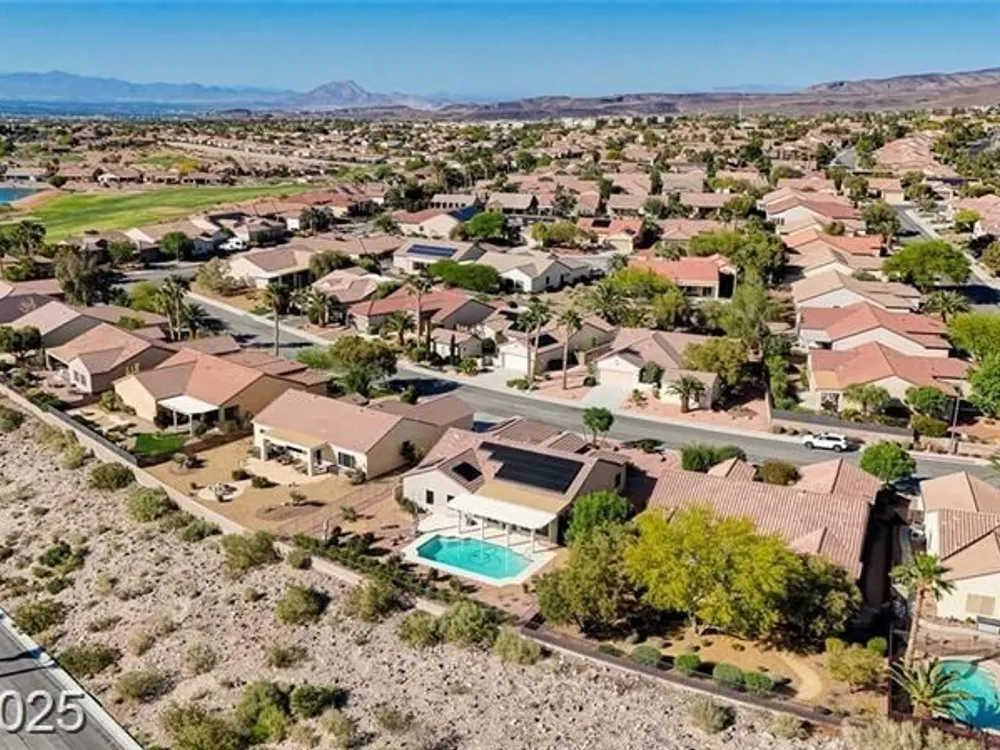 Welcome to this beautifully maintained Sun City Anthem home with breathtaking Strip and mountain views, a sparkling private pool to relax and watch the city come alive!! Solar Power Panels owned free at clear!!! This 2-bedroom, 2-bath property also offers a flexible third space—ideal as a den, office, or hobby room—and an enclosed patio/sunroom perfect for relaxing while enjoying sunset views. The open floor plan features a bright living area with a fireplace, a spacious dining space, and a well-equipped kitchen with an island, breakfast bar, and sunny dining nook. Plantation shutters add charm throughout. The oversized primary suite includes a cozy sitting area, large ensuite with a soaking tub, walk-in shower, and dual sinks. Recent updates include newer HVAC, reverse osmosis, and a soft water system. Enjoy all the amenities this vibrant 55+ community offers—clubhouses, indoor/outdoor pools, fitness centers, tennis, pickleball, bocce, golf, and dozens of clubs and activities.
