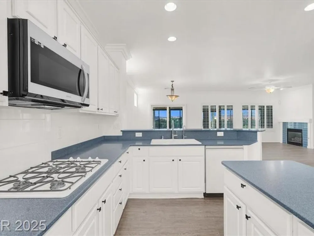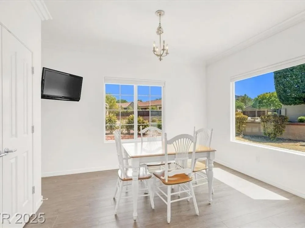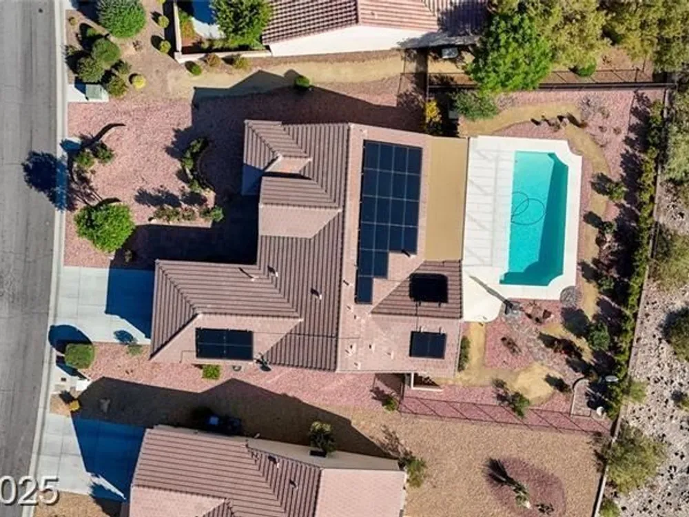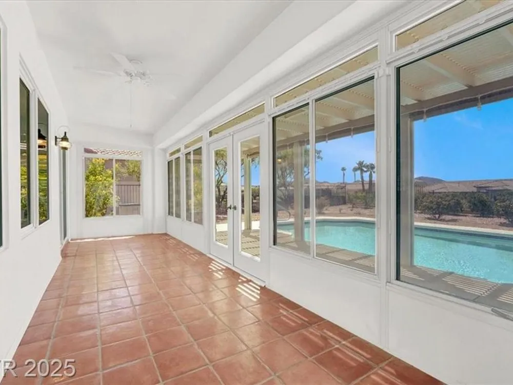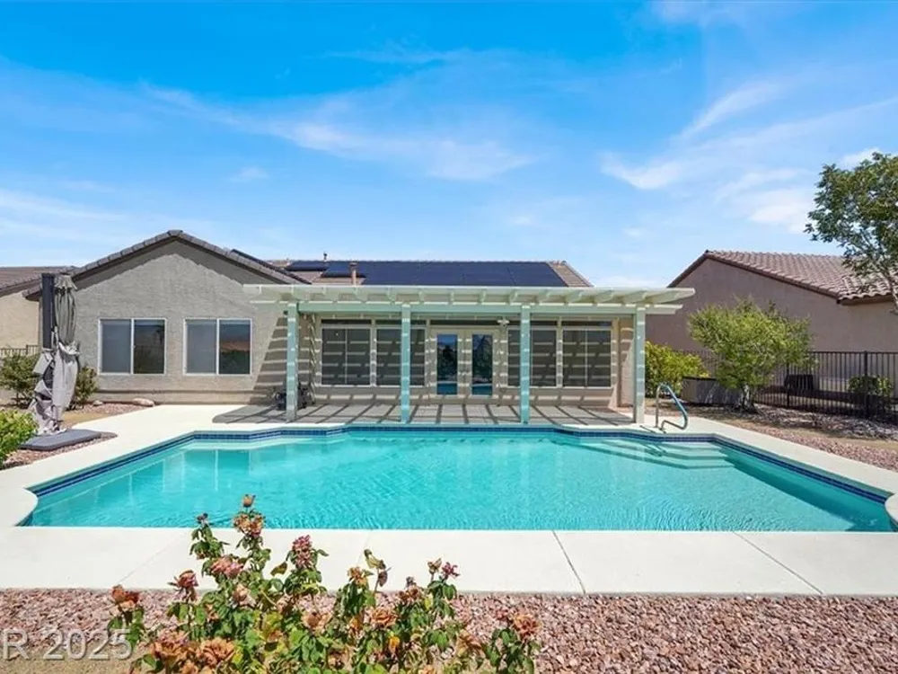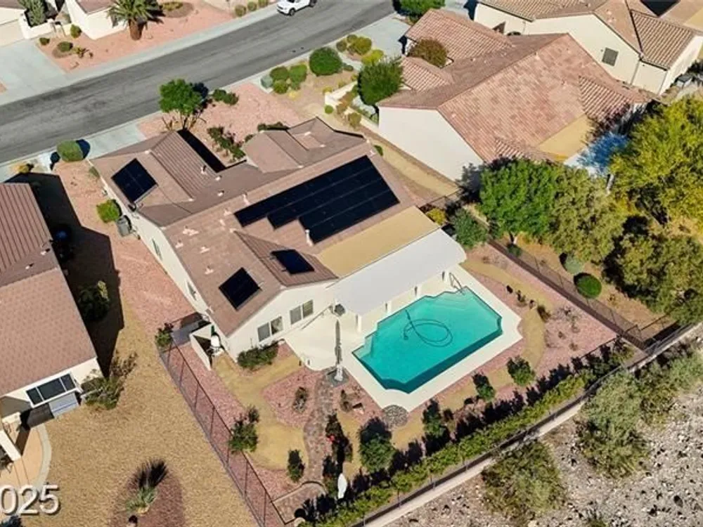 Welcome to this beautifully maintained Sun City Anthem home with breathtaking Strip and mountain views, a sparkling private pool to relax and watch the city come alive!! Solar Power Panels owned free at clear!!! This 2-bedroom, 2-bath property also offers a flexible third space—ideal as a den, office, or hobby room—and an enclosed patio/sunroom perfect for relaxing while enjoying sunset views. The open floor plan features a bright living area with a fireplace, a spacious dining space, and a well-equipped kitchen with an island, breakfast bar, and sunny dining nook. Plantation shutters add charm throughout. The oversized primary suite includes a cozy sitting area, large ensuite with a soaking tub, walk-in shower, and dual sinks. Recent updates include newer HVAC, reverse osmosis, and a soft water system. Enjoy all the amenities this vibrant 55+ community offers—clubhouses, indoor/outdoor pools, fitness centers, tennis, pickleball, bocce, golf, and dozens of clubs and activities.