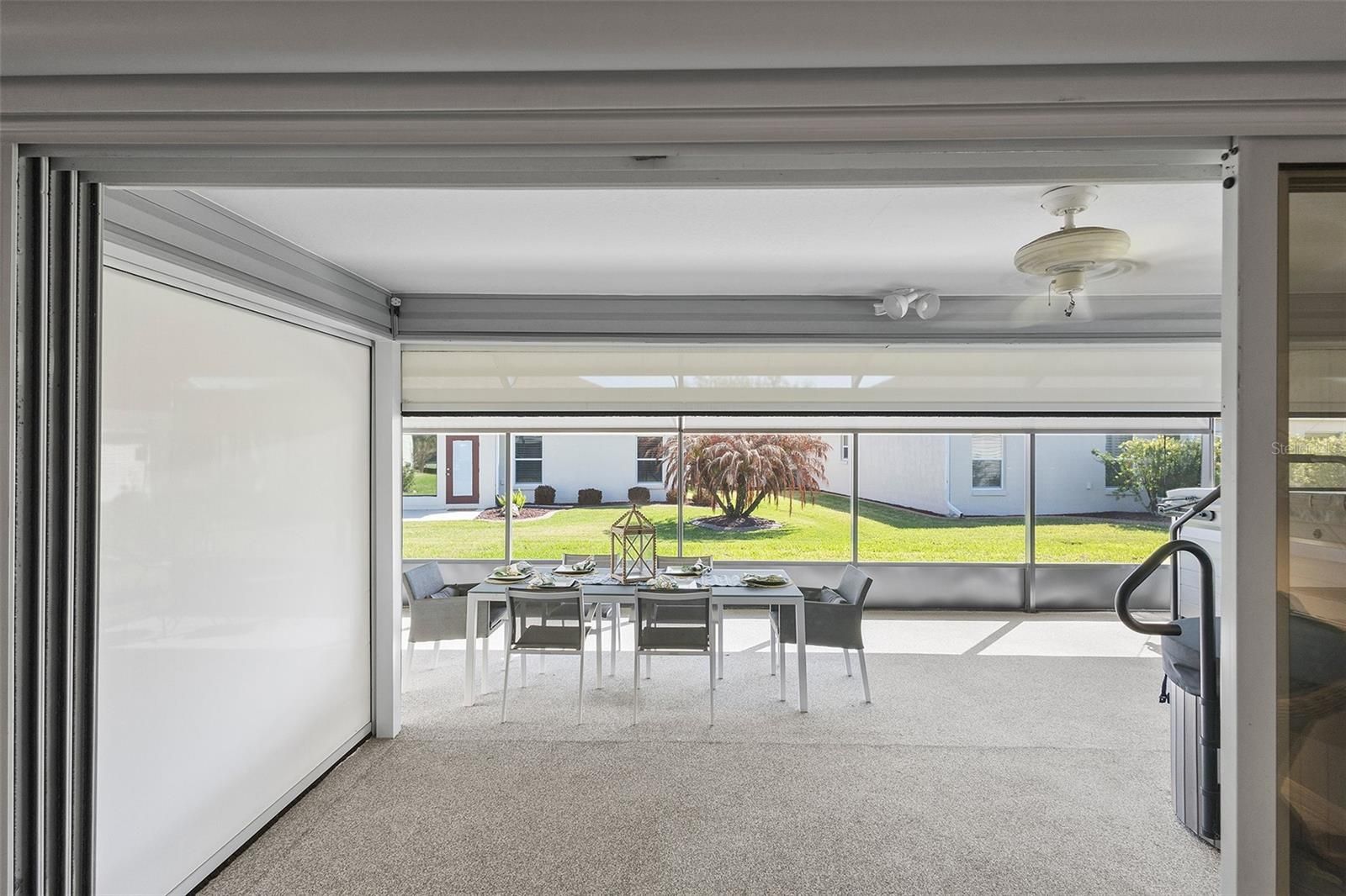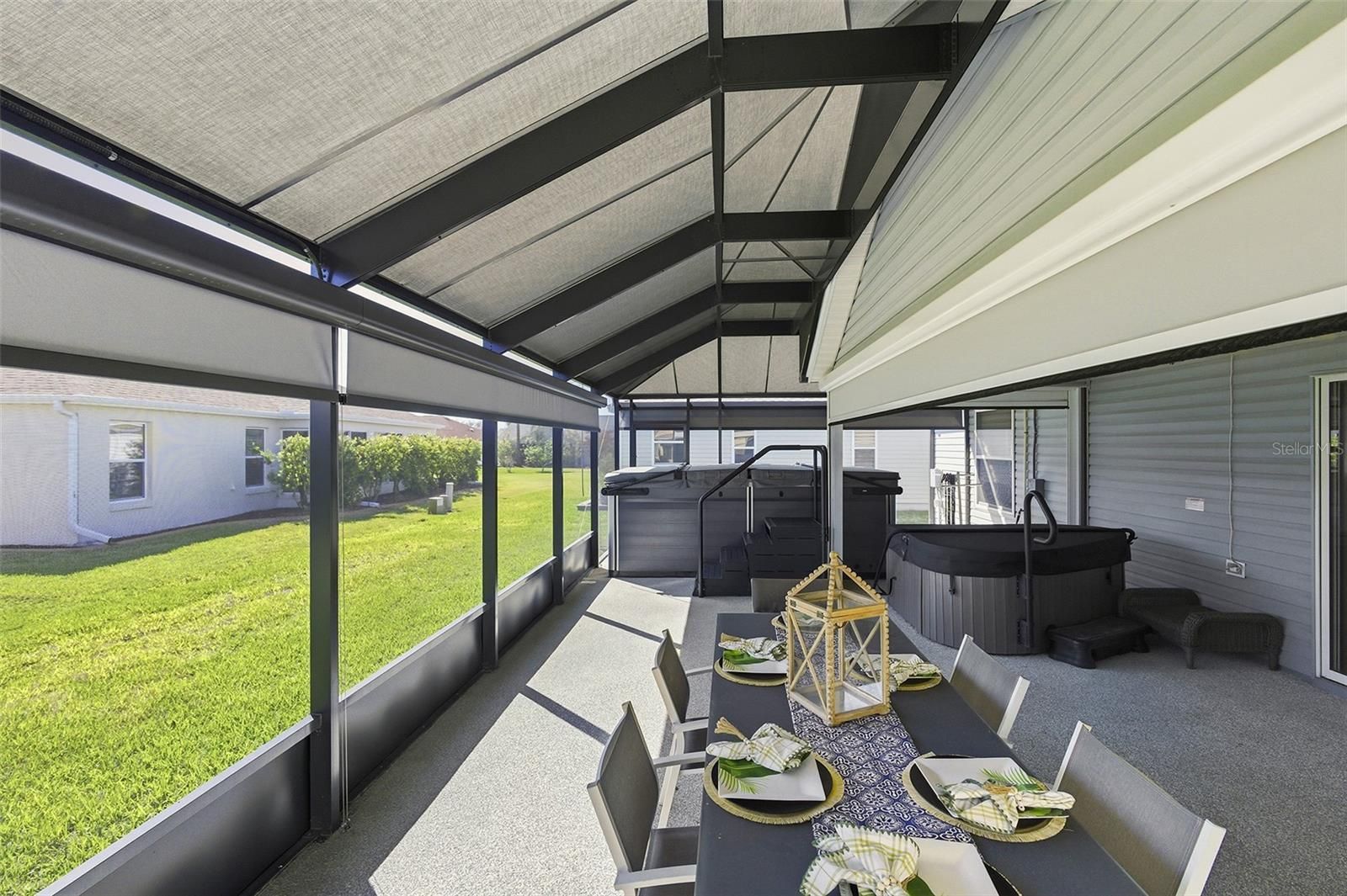 Welcome Home to this pristinely maintained Whispering Pine designer home ideally located in the Village of Tall Trees in The Villages. ROOF 2020. HVAC 2022. WH 2021. Situated on an expansive homesite with attractive landscaping and a welcoming front entry, this property offers both curb appeal and exceptional outdoor living space in one of the most convenient locations in the community. WATCH the VIDEO TOUR by clicking on the Tour Link above. Enjoy !! Step inside to an open and airy interior where volume ceilings and a soft, neutral color palette create a bright and inviting atmosphere. Luxury vinyl plank flooring flows throughout the main living areas and primary suite, adding both style and durability. The spacious living and dining areas connect seamlessly to the kitchen, making the layout ideal for both everyday living and entertaining. The kitchen features crisp white cabinetry, stainless steel appliances, and the added benefit of natural gas service, perfect for those who enjoy cooking on a gas range. Generous counter space and cabinetry provide excellent storage and functionality. The primary bedroom suite is spacious and comfortable, offering a relaxing retreat with continued luxury vinyl plank flooring and abundant natural light. Two additional guest bedrooms provide flexibility for visiting family, hobbies, or a home office, while the guest bathroom is conveniently located nearby. One of the standout features of this home is the exceptional outdoor living space. The oversized lanai creates a true backyard oasis and is equipped with automatic remote-controlled roll-down shades that allow you to adjust privacy and sunlight throughout the day. Here you will find a swim spa and hot tub, perfect for relaxing or entertaining guests year-round. Enjoy the sunset in the front of the home where you'll find an open patio with a lighted seating area, creating the ideal setting for evening gatherings under the Florida sky. Inside the home, automated remote-control sheer shades on the windows allow for additional light control while maintaining an elegant look. For peace of mind, several major updates have already been completed, including a new roof in 2020, water heater replaced in 2021, and HVAC system replaced in 2022. The Village of Tall Trees is known for its beautifully established surroundings and its incredibly convenient location. Residents enjoy quick access to shopping, dining, and everyday conveniences along the 466 corridor, while Lake Sumter Landing Market Square is just minutes away. Spanish Springs and Brownwood Paddock Square are also easily accessible, offering live entertainment, restaurants, boutiques, and the vibrant lifestyle that makes The Villages so special. This beautifully maintained Whispering Pine offers a rare combination of space, updates, outdoor luxury, and an outstanding central location. It is a wonderful opportunity to enjoy the very best of The Villages lifestyle.