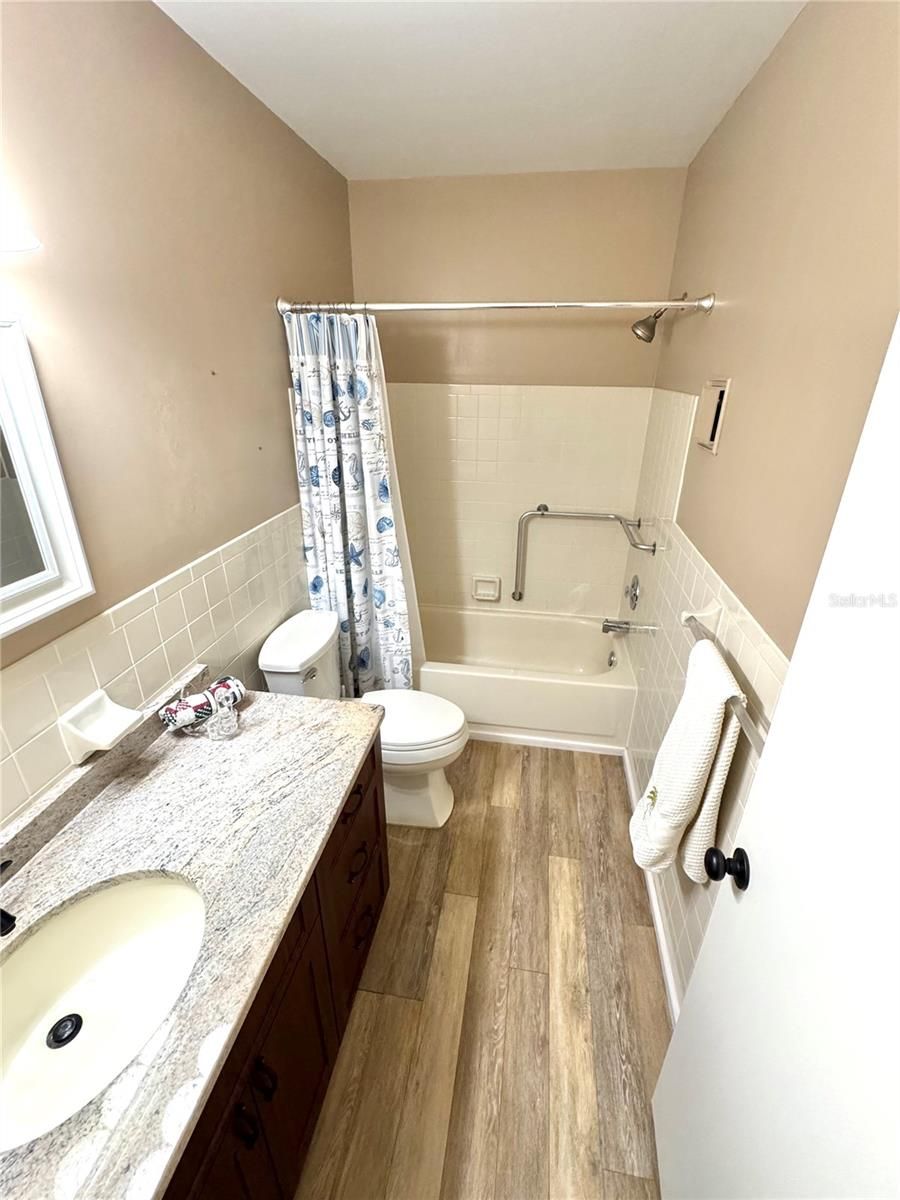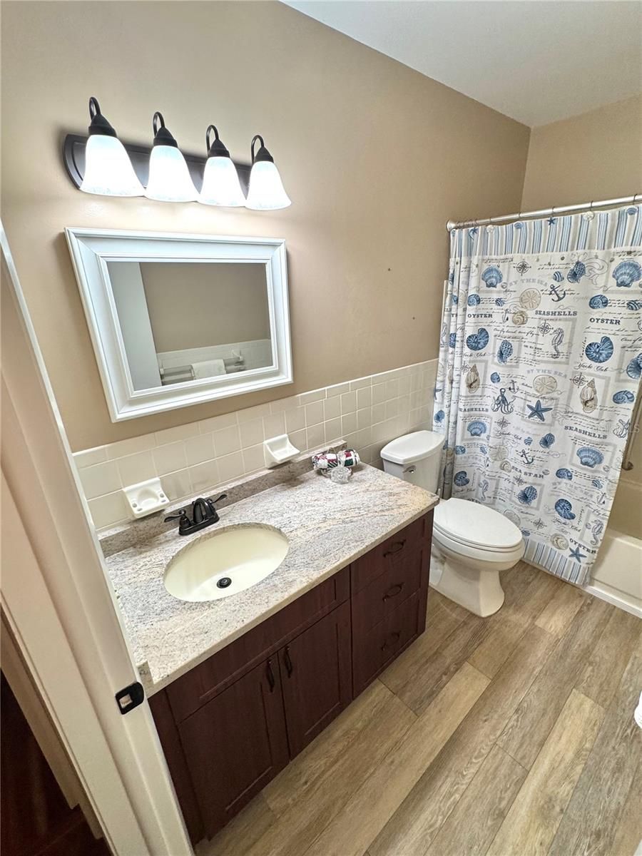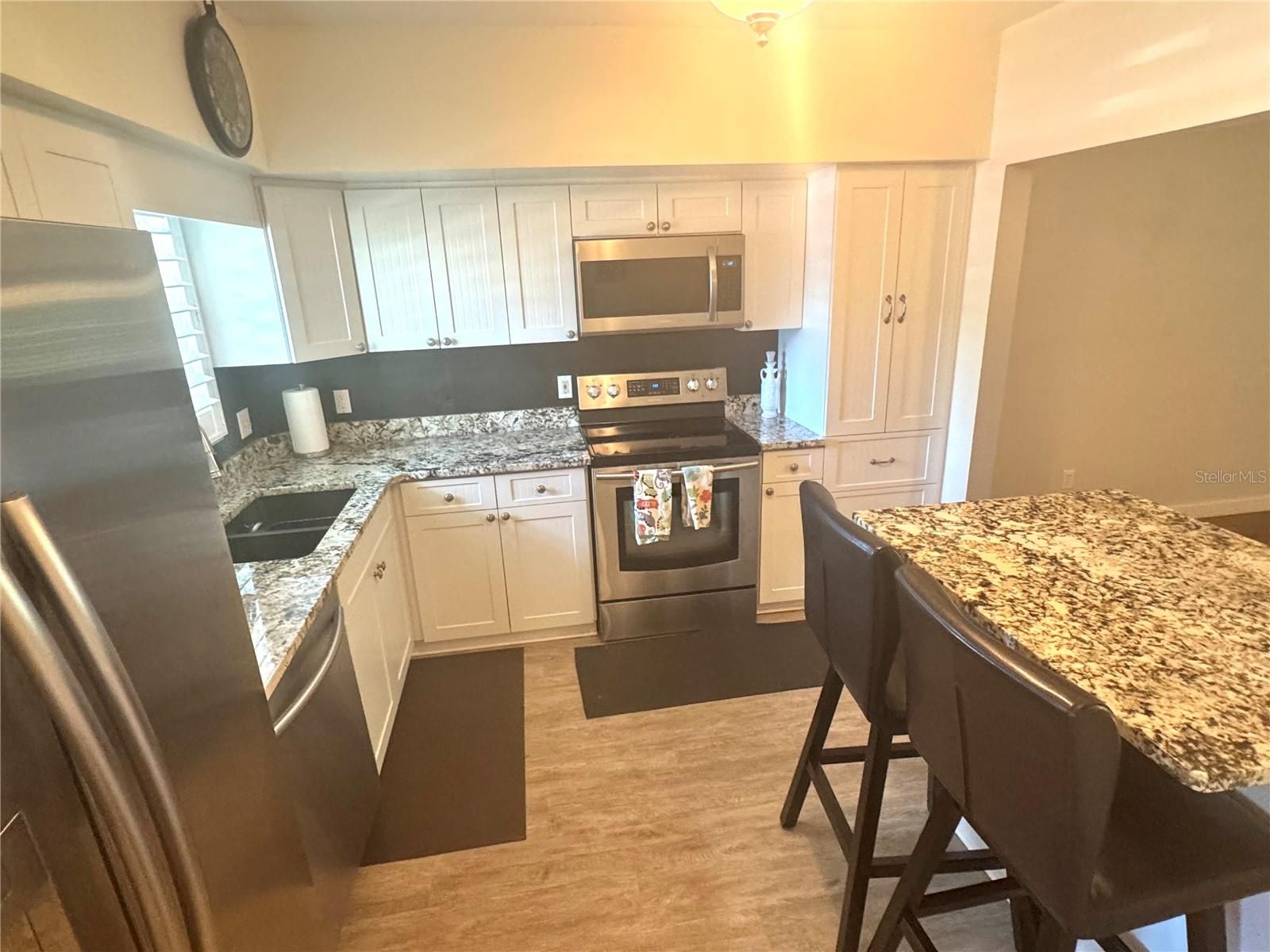 Incredible price on this HIGHLY SOUGHT AFTER UPDATED GROUND FLOOR 1415 square foot CONDO. HIGH-END UPGRADES from front to back. IMPACT-RATED insulated windows with PLANTATION SHUTTERS, high quality shaker cabinets, granite counters and stainless steel appliances that include a built in microwave oven. Gorgeous and functional granite island with breakfast bar in kitchen. The kitchen has been opened up to the dining area and family room. There is a large pantry closet in entry hallway. The A/C system was replaced in 2016. Enjoy the look and feel of upgraded hand-scraped looking laminate flooring in all the non-wet area and luxury vinyl plank flooring in the kitchen and bathrooms. Updates in both bathrooms. Huge master bedroom with tons of closet space. Huge 10'-26' lanai with aluminum railing and insulated aluminum panel roof overlooks spacious park-like green shady courtyard. Upgraded door to the lanai has integrated blinds inside. You will spend a lot of time out there when you are not at one of the two community pools, two clubhouses, two golf courses, 175 different clubs, 4 tennis courts, gym, fitness center, dog park, 2 horse shoe pits, 2 pickleball courts, 6 lawn bowling courts, 8 shuffleboard courts and two lakes for fishing. There is no place like OTOW. A Community laundry room and shared storage room is on the second floor in the elevator core down the walkway.