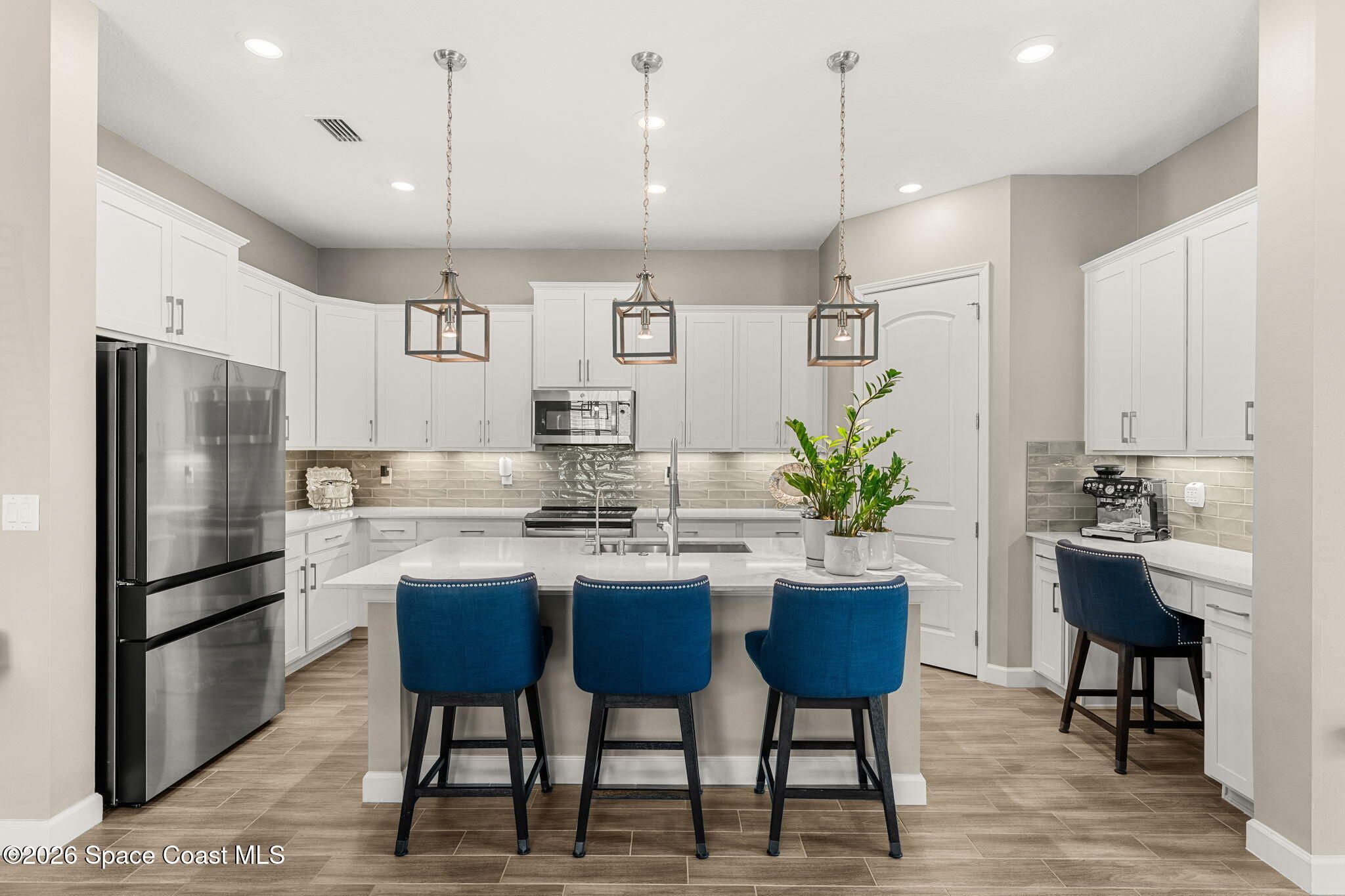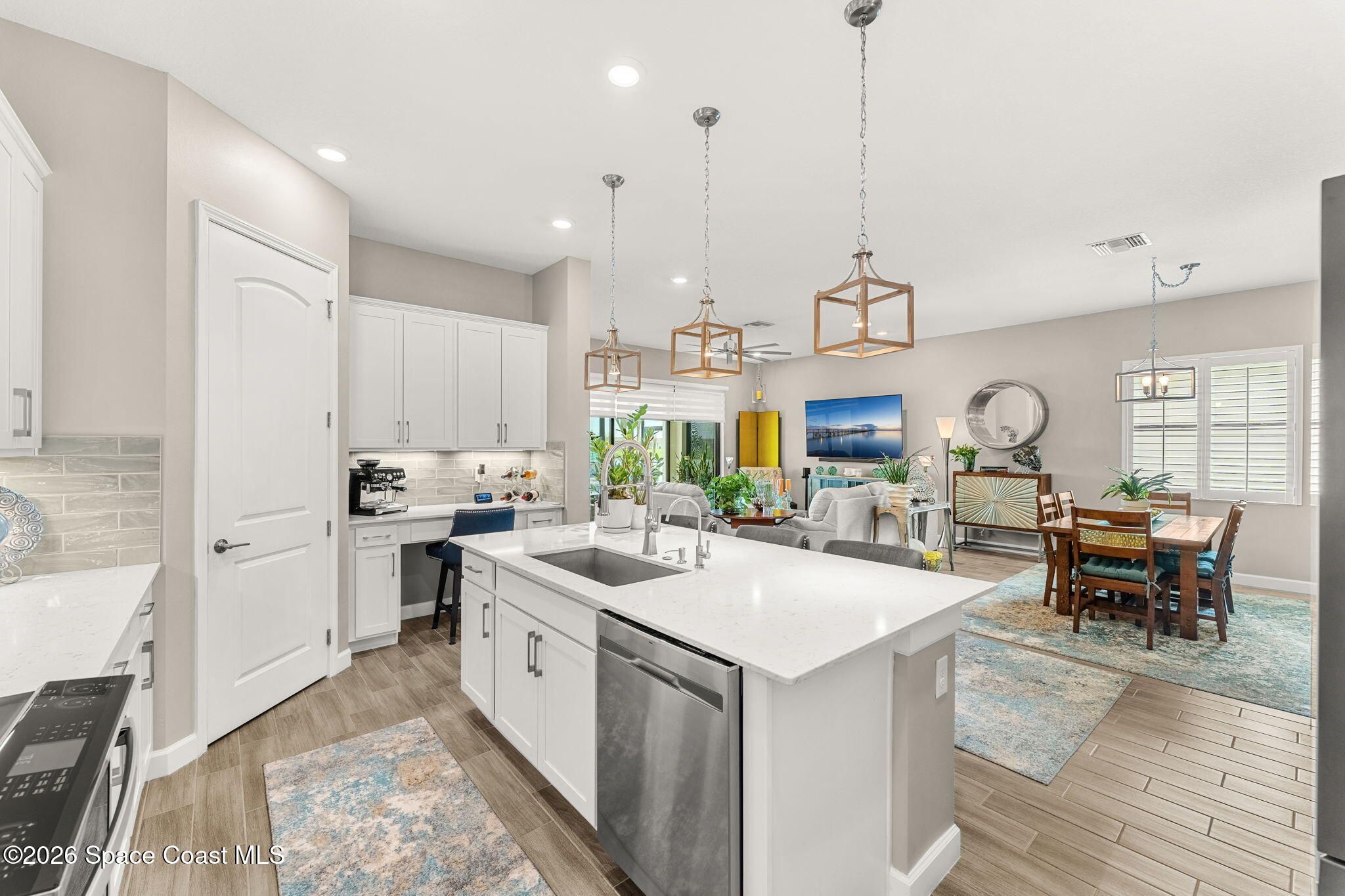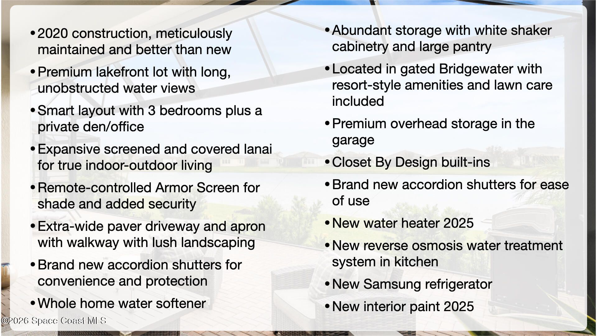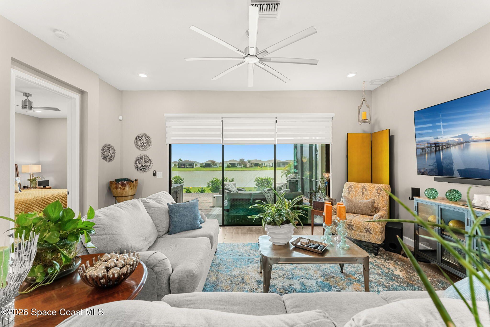 Expansive water views stretch wide across a panoramic, extended screened lanai, creating a striking backdrop for this meticulously maintained 2020-built residence in Bridgewater. The thoughtfully designed layout introduces a versatile den alongside three bedrooms, offering flexibility while maintaining an effortless flow throughout the home. Outdoor living is elevated with the enlarged lanai, complete with a remote-controlled screen that enhances comfort, shade, and privacy at any time of day. A long list of upgrades is evident at every turn, including a whole-home water treatment system and softener, along with all-new kitchen fixtures and faucet and updated faucets and bathroom fixtures throughout, complementing the home's clean condition and attention to detail. The arrival sets the tone with an extended paver driveway, manicured landscaping, and full accordion storm protection, all within a gated community known for its clubhouse, amenities, and low-maintenance lifestyle.