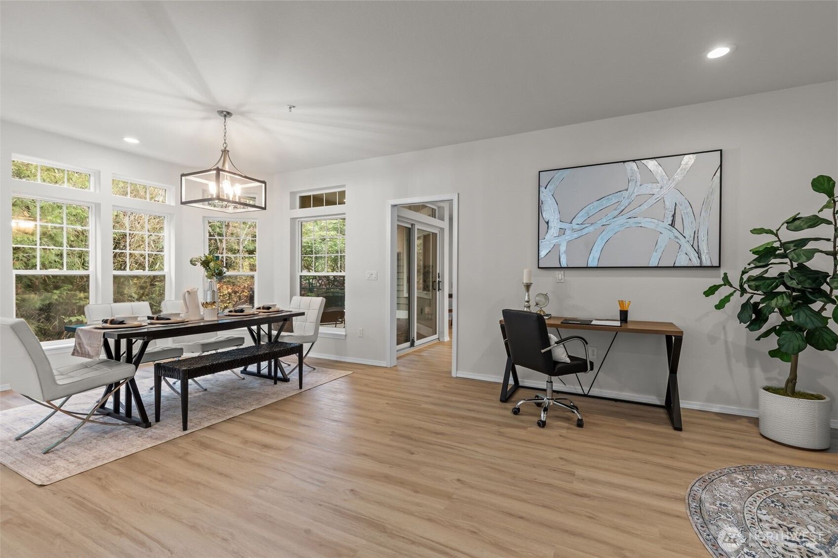 Welcome to this beautifully updated Forest Village home. The spacious floorplan offers a large living and dining room, den just off the dining room, open kitchen with new appliances, quartz counters & subway tile backsplash. Enjoy new LVP flooring, fresh paint, updated baths and new carpet in bedrooms. A primary suite with walk-in closet and a dual-vanity bathroom. A large second bedroom with an ensuite bath. High ceilings and oversized windows fill the home with light and greenery. Cozy gas fireplace for cooler days and a private patio for warm summer nights. View deer passing through the serene greenery. Oversized 2-car garage. This 55+ community offers exceptional amenities with an indoor pool, hot tub, fitness room, clubhouse and more.