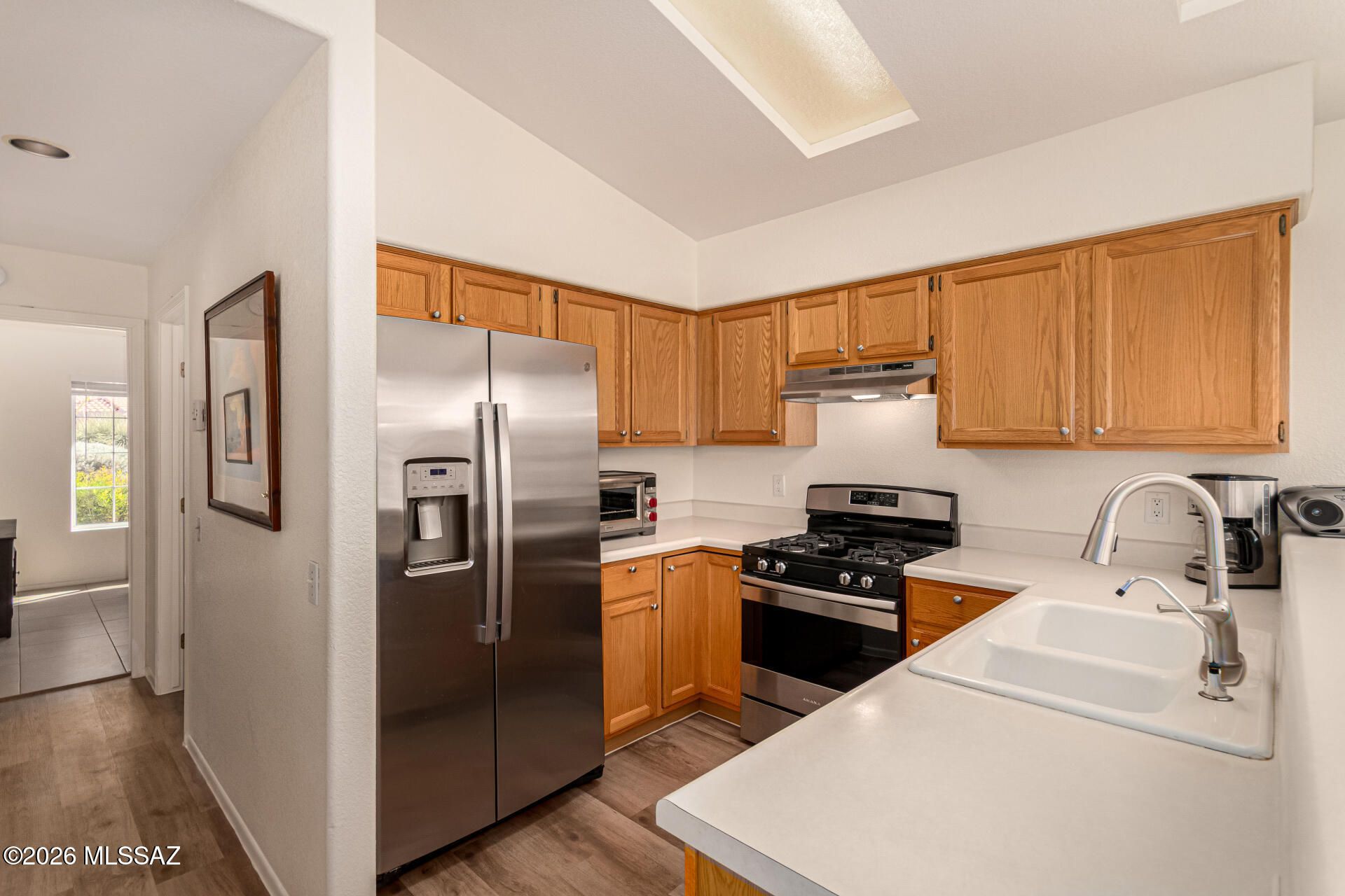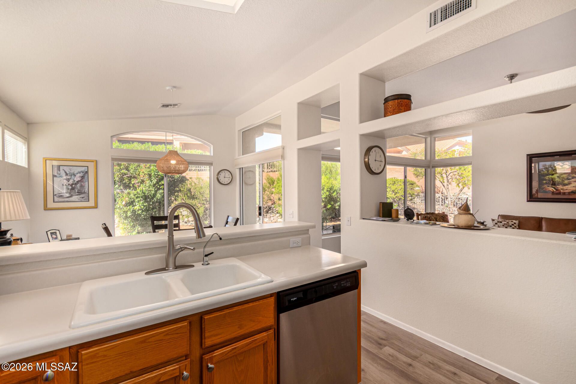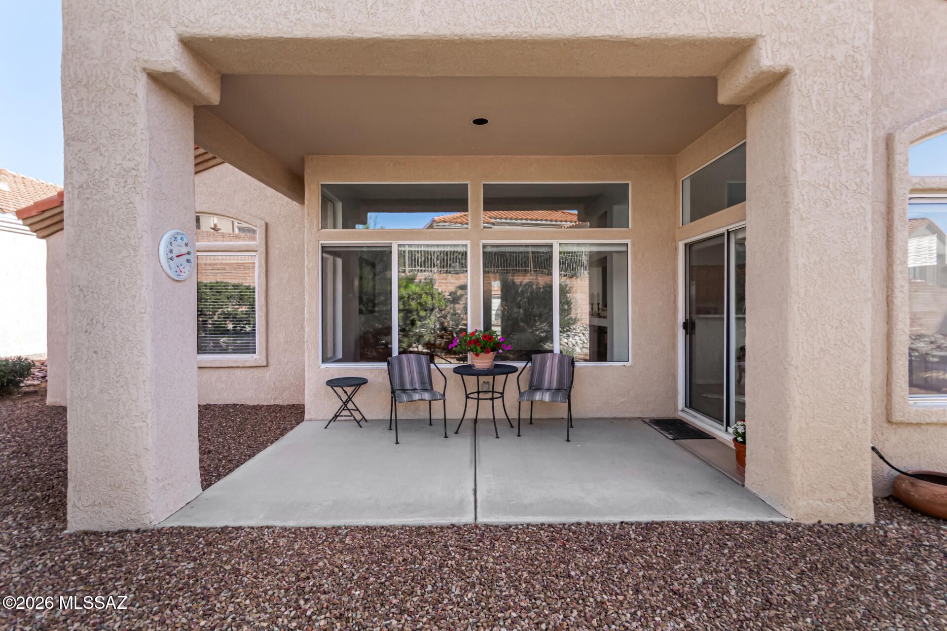Well-maintained 2bed/2bath Mariposa model located in the highly desirable Sun City Oro Valley community. Enjoy mountain views from the front yard, attractive low-maintenance landscaping and a covered rear patio, perfect for relaxing, or entertaining. The spacious living room welcomes you with vaulted ceilings, abundant natural light and a convenient pass-through to the kitchen. The open, bright kitchen features ample cabinetry, stainless steel appliances, a pantry and a breakfast bar, with a cozy breakfast nook overlooking the serene backyard. A split-bedroom floorplan provides privacy for both owner and guests. The generously sized primary suite offers walk-in shower and a walk-in closet. New laundry room off of garage has a utility sink.