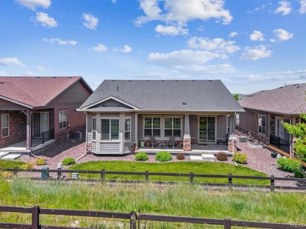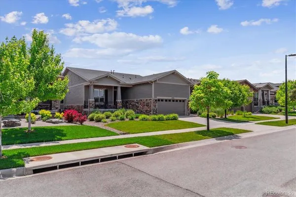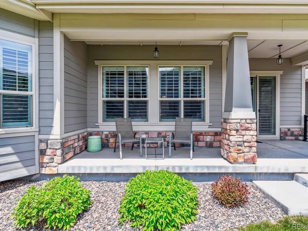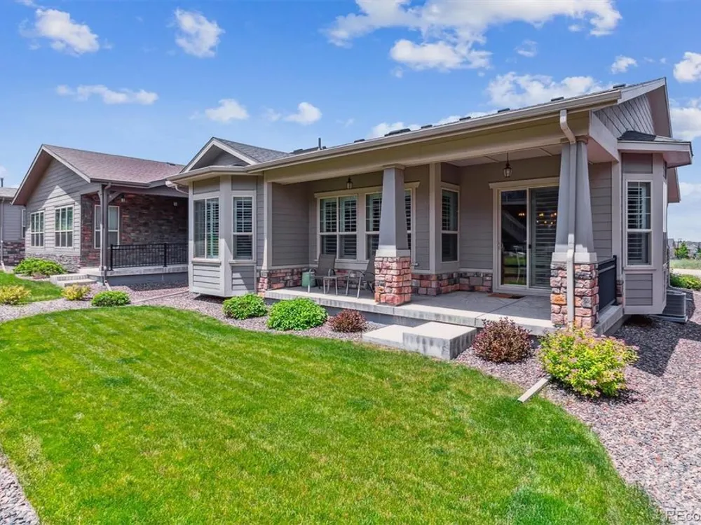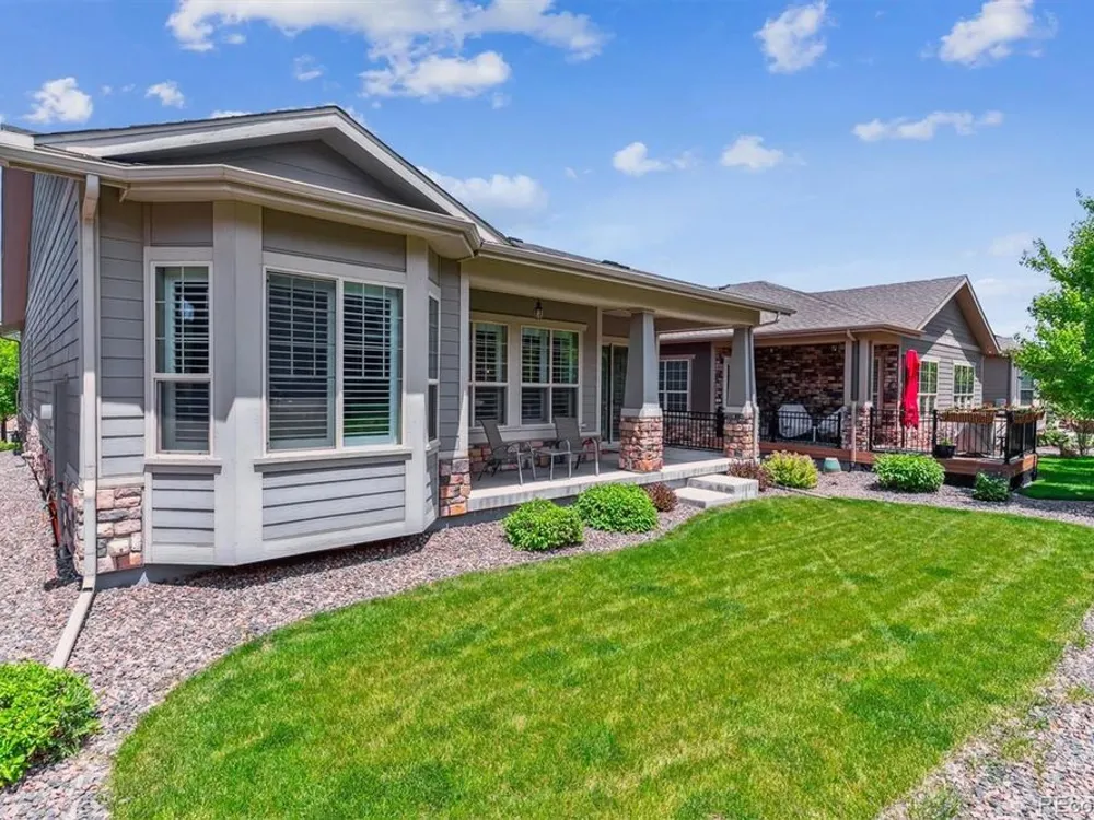 Welcome to your dream home in the sought-after Inspiration 55+ community, where modern convenience and breathtaking mountain views meet. This impeccably maintained ranch-style smart home features exceptional craftsmanship and thoughtful upgrades throughout. Step inside to find 9' ceilings, wide-plank LVP flooring, upgraded lighting, plantation shutters, and a full home security system. Just off the foyer, a private office is ideal for remote work or study. The chef’s kitchen includes quartz countertops, stainless steel appliances, gas cooktop, large pantry, and an oversized island perfect for casual meals or entertaining. Thoughtful upgrades include soft-close cabinets with pull-outs, glass-front accents, under-cabinet lighting, crown molding, and designer fixtures. A custom chandelier highlights the adjacent dining area, which flows into the spacious family room for open-concept living. Step outside to an oversized covered patio overlooking a professionally landscaped backyard and greenbelt—perfect for quiet mornings or lively gatherings. The serene primary suite boasts a coffered ceiling, plantation shutters, spa-like bath with a sleek walk-in shower, and a custom closet system. A spacious secondary bedroom with its own walk-in closet and custom organizers provides comfort for guests. A full upgraded bath and large laundry room with cabinetry complete the main level. This smoke-free, energy-efficient home includes an insulated 2-car garage, water-saving fixtures, and a high-efficiency HVAC system. Enjoy resort-style amenities: clubhouse, fitness center, pool, library, tennis, and a vibrant 200-member pickleball group. Whether relaxing on the patio or joining social events, this home offers the perfect balance of comfort, style, and community. Schedule your private tour today and discover why Inspiration is one of Colorado’s premier 55+ communities.