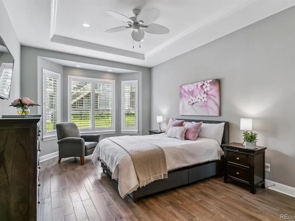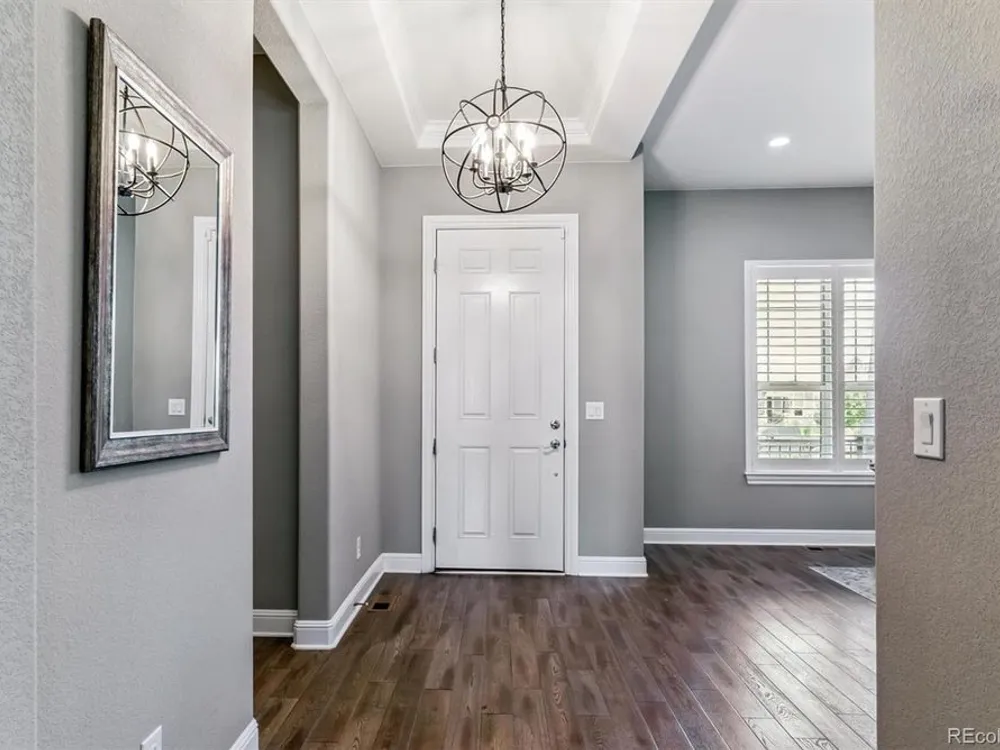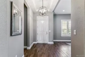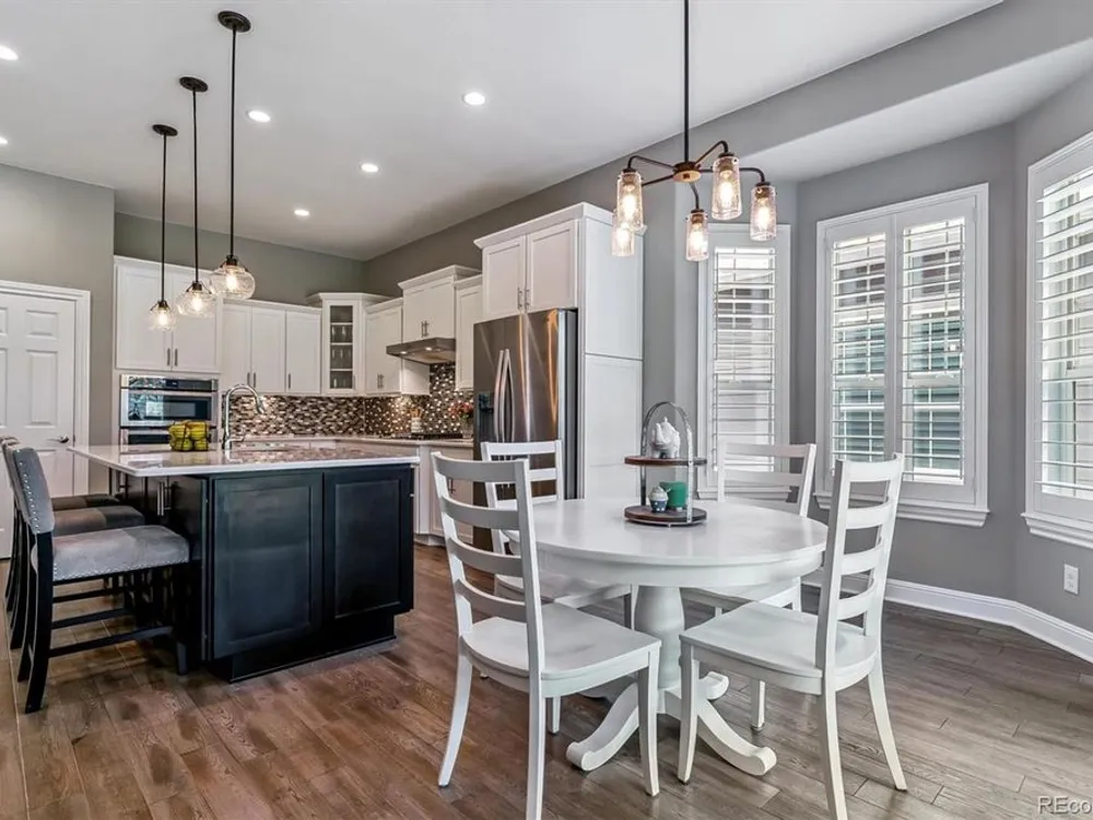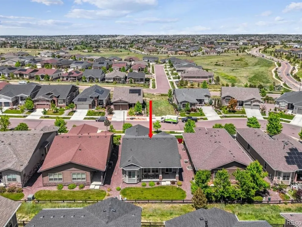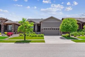 Welcome to your dream home in the sought-after Inspiration 55+ community, where modern convenience and breathtaking mountain views meet. This impeccably maintained ranch-style smart home features exceptional craftsmanship and thoughtful upgrades throughout. Step inside to find 9' ceilings, wide-plank LVP flooring, upgraded lighting, plantation shutters, and a full home security system. Just off the foyer, a private office is ideal for remote work or study. The chef’s kitchen includes quartz countertops, stainless steel appliances, gas cooktop, large pantry, and an oversized island perfect for casual meals or entertaining. Thoughtful upgrades include soft-close cabinets with pull-outs, glass-front accents, under-cabinet lighting, crown molding, and designer fixtures. A custom chandelier highlights the adjacent dining area, which flows into the spacious family room for open-concept living. Step outside to an oversized covered patio overlooking a professionally landscaped backyard and greenbelt—perfect for quiet mornings or lively gatherings. The serene primary suite boasts a coffered ceiling, plantation shutters, spa-like bath with a sleek walk-in shower, and a custom closet system. A spacious secondary bedroom with its own walk-in closet and custom organizers provides comfort for guests. A full upgraded bath and large laundry room with cabinetry complete the main level. This smoke-free, energy-efficient home includes an insulated 2-car garage, water-saving fixtures, and a high-efficiency HVAC system. Enjoy resort-style amenities: clubhouse, fitness center, pool, library, tennis, and a vibrant 200-member pickleball group. Whether relaxing on the patio or joining social events, this home offers the perfect balance of comfort, style, and community. Schedule your private tour today and discover why Inspiration is one of Colorado’s premier 55+ communities.