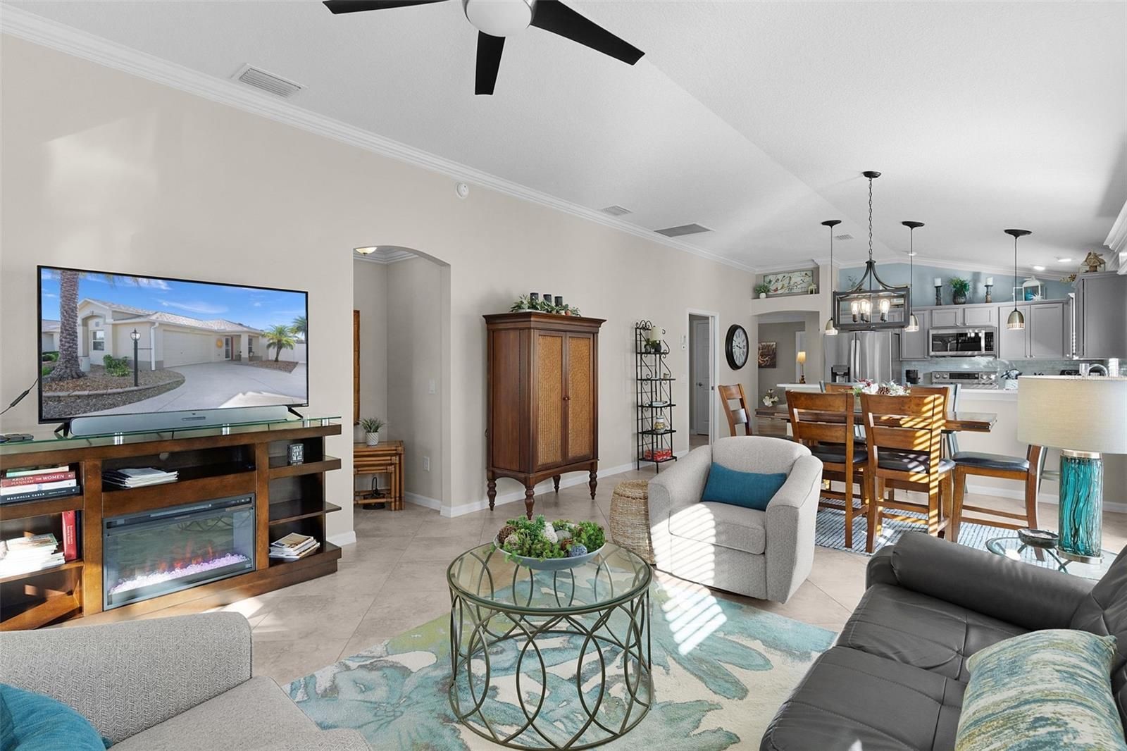 BEST FIND OF 2026 IS HERE & is being sold TURNKEY!! BOND PAID! ROOF NEW JAN 2025; Kitchen & Baths RECENTLY UPDATED: QUARTZ IN KITCHEN & BATHS, LG Stainless Steel APPLIANCES including French Door Refrigerator, Composite sink in Kitchen, Upgraded FAUCETS, Beautiful tile Backsplash, Much of the Lighting has been updated, CROWN MOLDING THROUGHOUT, ENCLOSED LANAI w/Mini-split; Layout is Open and EASY TO LOVE whether entertaining or relaxing at home! Kitchen has abundant cabinetry (some with pull-outs), BREAKFAST BAR is convenient for quick dining or great for serving buffet style, Dining area has slider to side patio for easy access to outdoor cooking; CERAMIC TILE throughout; OWNER'S SUITE has lovely view of backyard when you wake up in the morning, Custom closet installed in Owner's Suite; Larger Guest Bedroom has twin beds while Bedroom 3 is set up as a great office...both have dual closets; UPDATED BATHS sparkle w/lighting, faucets, mirrors and Quartz countertops being replaced; INTERIOR LAUNDRY is a delight with great cabinet space and is stubbed for a utility sink under the left base cabinet; ENCLOSED LANAI has Mini-split for Year round comfort, this room is a great office or reading room w/roll down shades; OTHER IMPROVEMENTS:WATER SOFTENER, FRONT STORM DOOR '21, GARAGE DOOR OPENER & SPRINGS '21, EXTERIOR PAINT '21, DISPOSAL '21, WASHER '23, AIR DUCT/DRYER CLEANING (installed UV LIGHT) '24, H/W HEATER 2/26; You'll Love this Amazing SCREENED BIRDCAGE! Located between the 466's, this home has the convenience of being near several Regional Recreation Centers, Numerous Championship and Executive Golf Courses, Squares for Nightly Entertainment, Dining & Shopping; TAXES FOR 2025: AD-VALOREM $2,761.41 & NON-AD VALOREM $723.28 (note: of this Ad-Valorem total of $723.28 does include the CDD fee of $402.47 listed in on the CDD above) The total tax bill for 2025 was $3,484.69 **Seller reserves 3 pictures on the walls with sentimental value** Golf Cart sold separately.