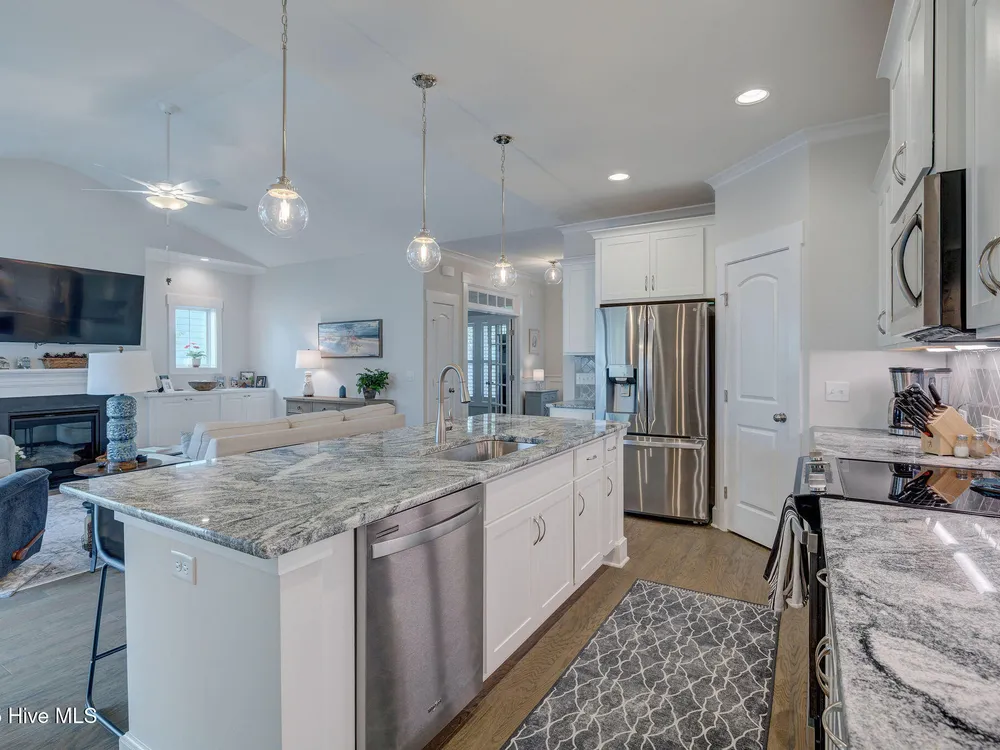 - Master Downstairs, Walk-In Closet(s), Tray Ceiling(s), High Ceilings, Entrance Foyer, Kitchen Island, Ceiling Fan(s), Pantry, Walk-In Shower, Blinds