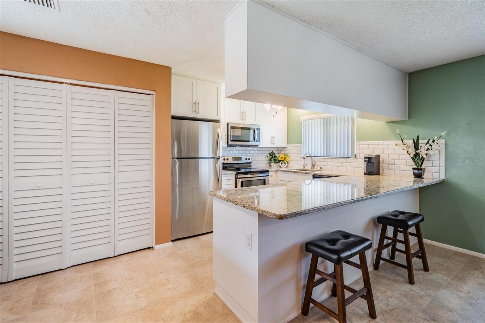 Rarely available! This meticulously maintained and elegantly updated 2 bed/2bath/1-car garage patio home is nestled within the desirable 55+ community of Village on the Green. Move in with peace of mind knowing you have a brand-new roof (2025), newer A/C (2023), and over $80,000 in upgrades including a full kitchen remodel, both bathrooms beautifully renovated, new flooring (no carpet), custom blinds, leaf gutters, fresh paint, and more. The open, airy floor plan is an entertainer’s delight. The modern kitchen shines with granite countertops, stainless steel appliances, a tile backsplash, and abundant cabinetry and counter space. It flows seamlessly into the dining and cozy living areas, creating the perfect gathering space. A bonus Florida room invites you to enjoy morning coffee or evening relaxation, and the outdoor patio offers a peaceful place to unwind while admiring the lush greenery and gentle sounds of nature. The spacious primary suite features ample closet space and a luxurious granite vanity with a seated makeup area. The primary bath includes a step-in shower, while the guest bath offers a relaxing tub. The low HOA fee covers lawn maintenance, basic cable, and access to an array of amenities — including a sparkling lakefront pool, fitness center, library, shuffleboard courts, and an active clubhouse with yoga, cards, crafts, and social gatherings. No CDD fees. Located just minutes from downtown Dunedin, Honeymoon Island, Caladesi, and Clearwater Beach, plus local shops, restaurants, and weekend artisan markets — this home offers the perfect balance of peaceful living and vibrant convenience. Schedule your private showing today and make it yours!
