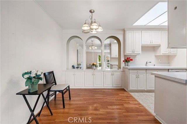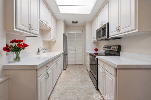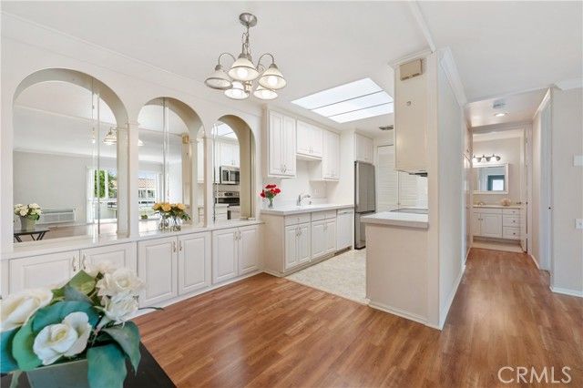 This CONDO HAS NO STAIRS TO GET INTO THIS HOME. NO STAIRS INSIDE THIS HOME. NO STAIRS TO GET TO THE CARPORT. NO STAIRS ANYWHERE! The lowest priced CONDO with: INSIDE LAUNDRY, Carport close by 2175-9, NO ONE above and NO ONE LIVING BELOW YOU. UPGRADED. Prime Interior Location w/NO Steps + Ultra Clean Move-In Condition + Fantastic Price = VERY HAPPY BUYER!!! This single level Monterey end unit in Laguna Woods features easy access w/NO steps from your assigned carport. You'll love coming home every day and entering your large private covered patio with large storage closet. Covered Patio with Storage gets Morning Sun!!! You will love the open-flowing floor plan that features contemporary laminate flooring, crown molding, big newer windows. The kitchen offers quartz counters, loads of cabinetry and pantry space, and brand newer stainless steel appliances. The formal dining room has plenty of room for your nice furnishings. Both bedrooms are large. One boast mirrored closet doors wonderful windows w/private open space views. The bathroom features new modern fixtures and has the perfect walk-in shower design. There is an awesome location, professionally maintained grass lawn and plenty of available guest parking right outside from your front door. This is the ultimate 55+ adult community and lifestyle w/27 hole golf course, 9 hole executive par 3 course, 5 pools, 7 clubhouses, an equestrian center, multiple world-class craft workshops, and over 200 different social clubs. Residents enjoy free shuttle service to major amenities and markets throughout the City. No stairs or elevators at this home!