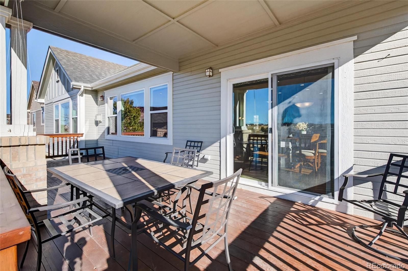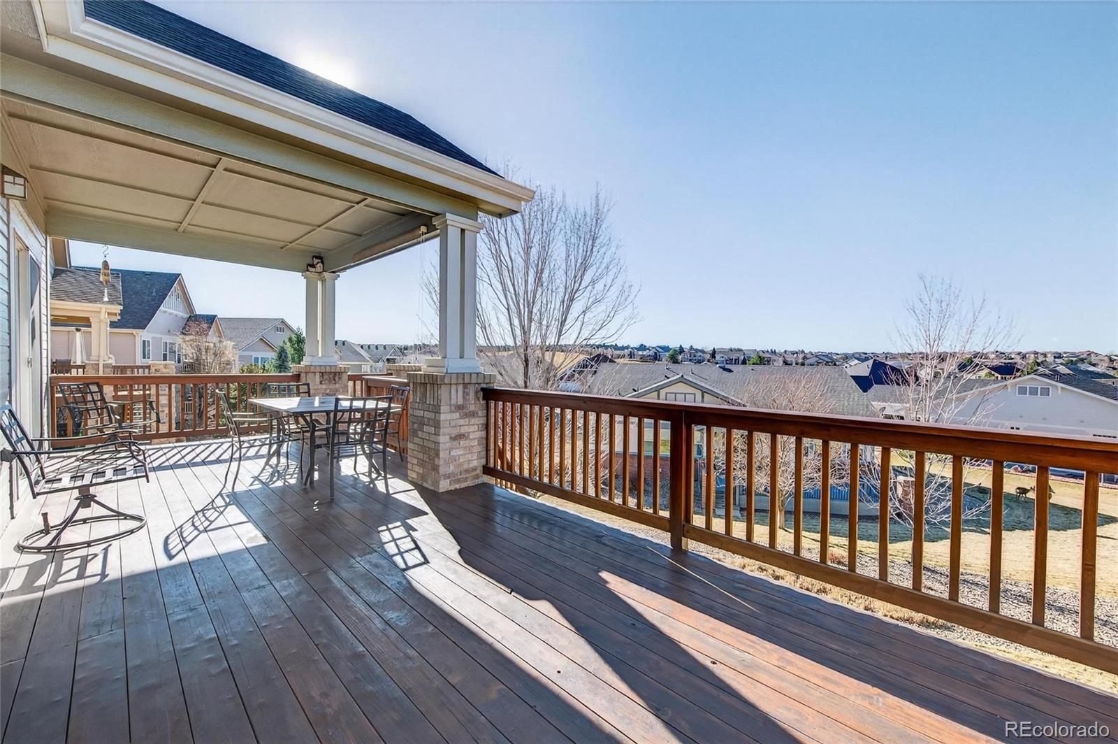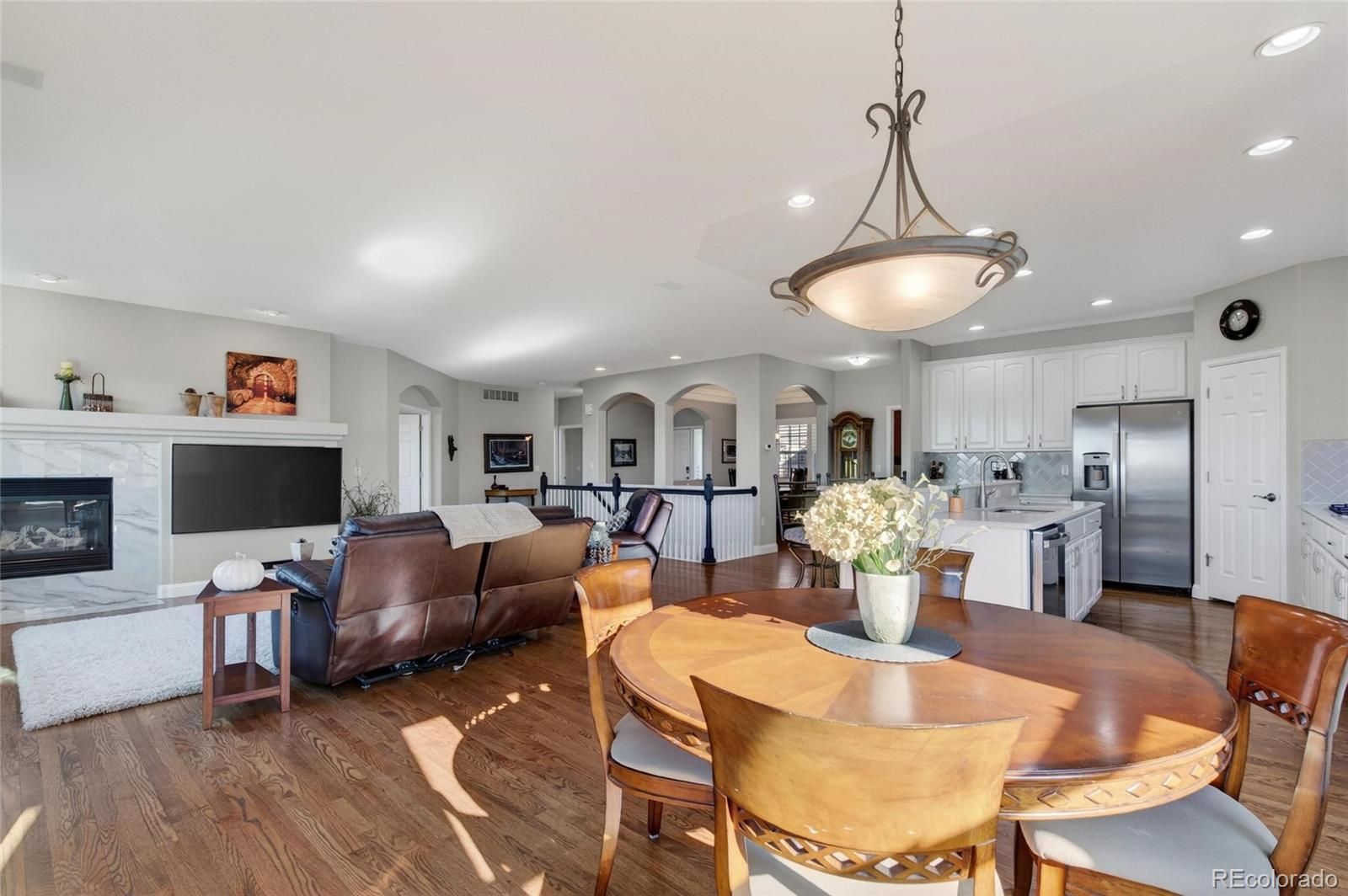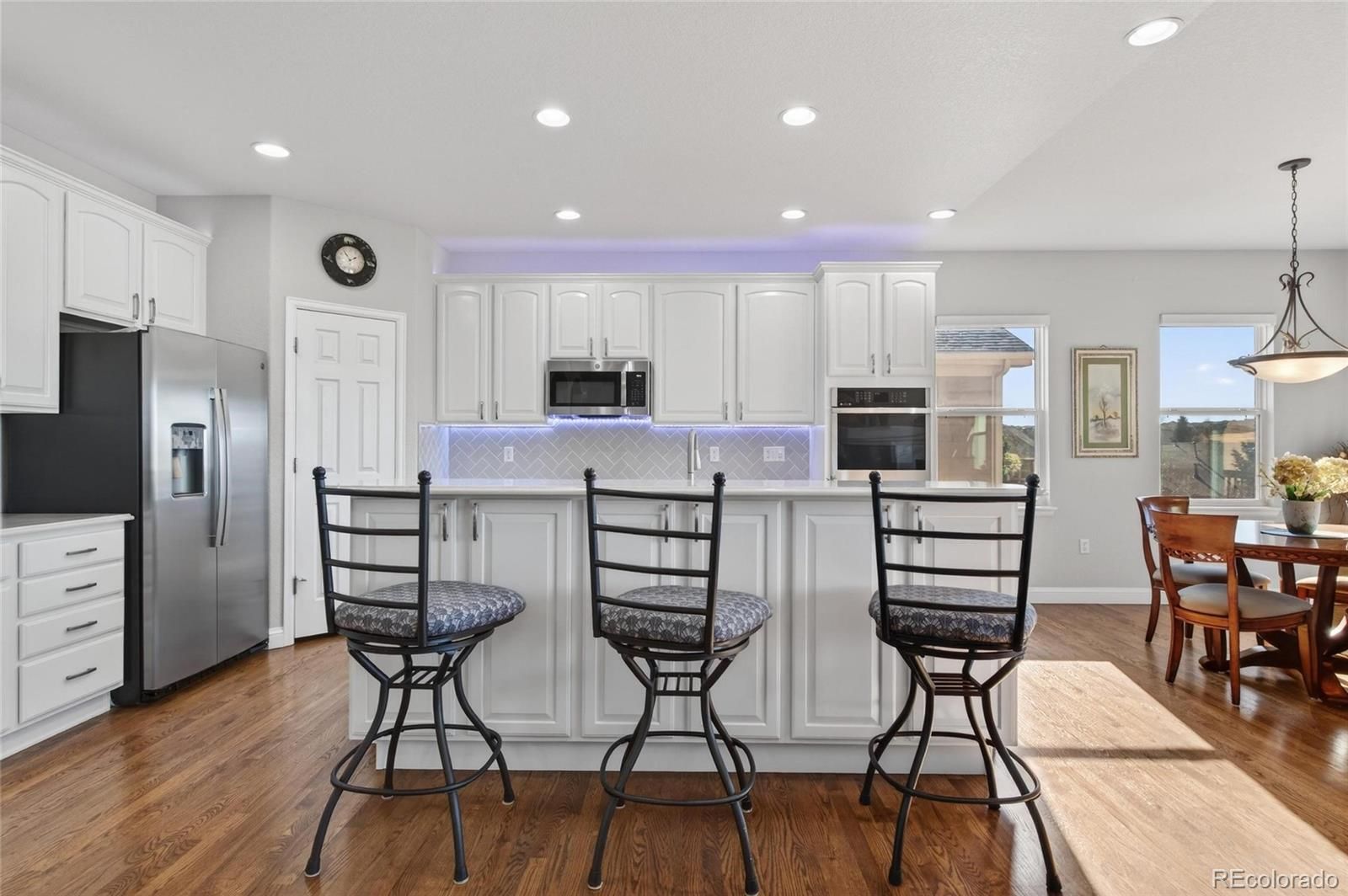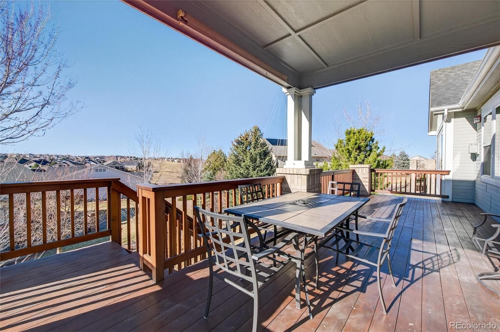 Don't miss the opportunity to own one of the finest ranch style homes located in Heritage Eagle Bend! Pride of ownership is evident throughout this exceptional property. Welcome to this stunning home featuring three bedrooms, three bathrooms, and an office. This residence is perfect for entertaining. The open floor plan is flooded with natural sunlight, thanks to numerous windows. Enjoy the beautiful Colorado sunsets from the spacious, partially covered, back deck. The great room is equipped with remote control blinds which adds convenience and sophistication, gas log fireplace, built-ins, and hardwood floors. The remodeled kitchen is a chef's dream, boasting new SS appliances, a gas range cooktop, double ovens, microwave, dishwasher, refrigerator, updated countertops, an abundance of cabinetry, stylish tiled backsplash, walk-in pantry, large island, and fun ambient lighting above and below the cabinetry. The kitchen also offers a large eating space. The formal dining area is ideal for hosting, featuring tray, ceilings, plantation shutters, and an open flow. The primary bedroom is a true retreat with double doors, tray ceilings, a ceiling fan, plantation shutters, newer carpet, fresh paint, and a remodeled en-suite bathroom offering large walk-in shower and a walk-in closet. The partially finished walkout basement includes a large family/rec room, nice patio, spacious bedroom, walk-in closet, full bath, plenty of sunlight, and huge storage room. Recent upgrades include a newer roof, newer furnace and air conditioning (2023). There is also a water softener. Gleaming hardwood floors, newer carpeting, fresh paint inside and out. Refinished and stained back deck, create an inviting and revitalized atmosphere. Oversized two car garage with an additional space for your golf cart. Once again - Pride of ownership is evident throughout this exceptional property.