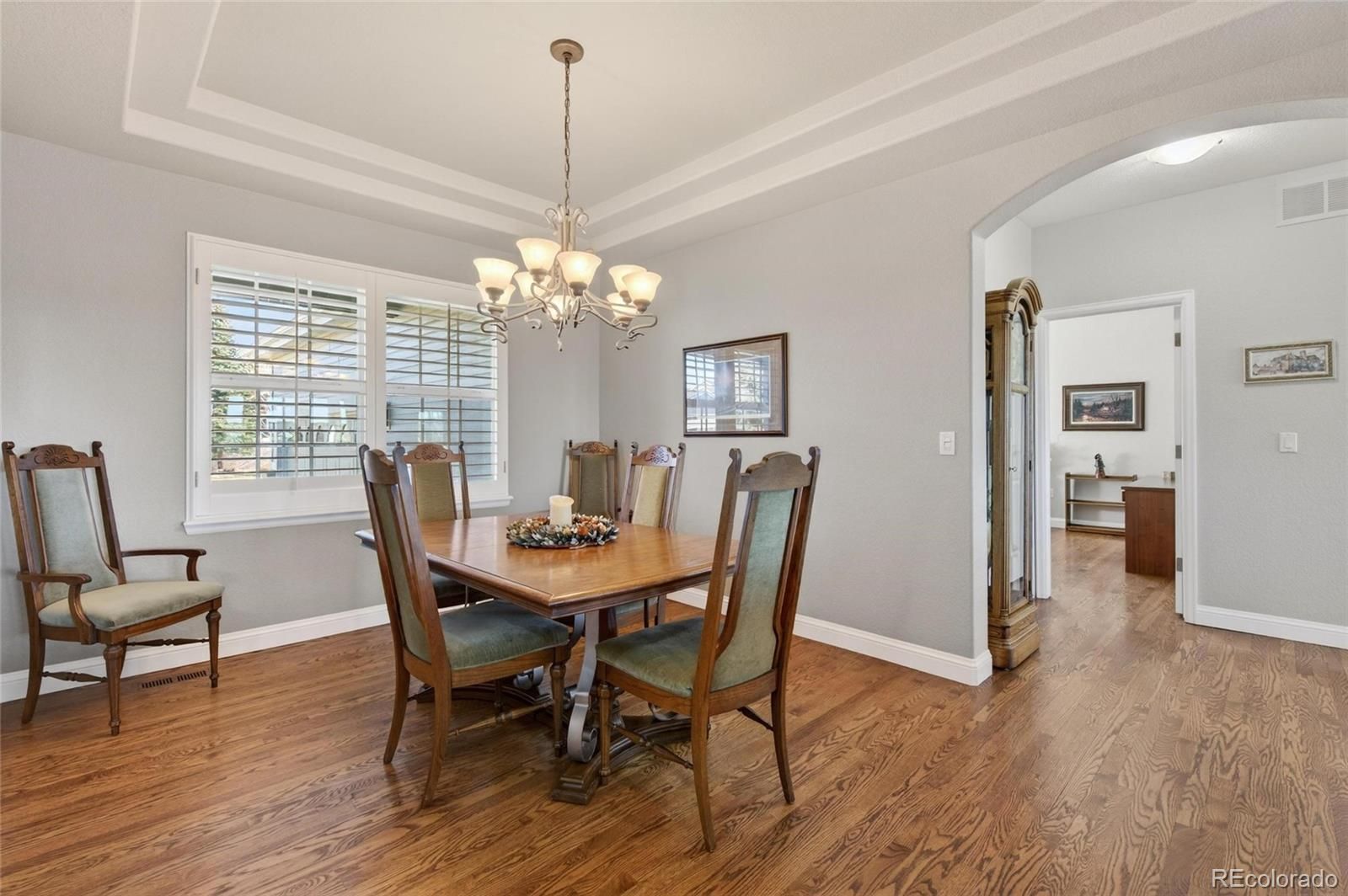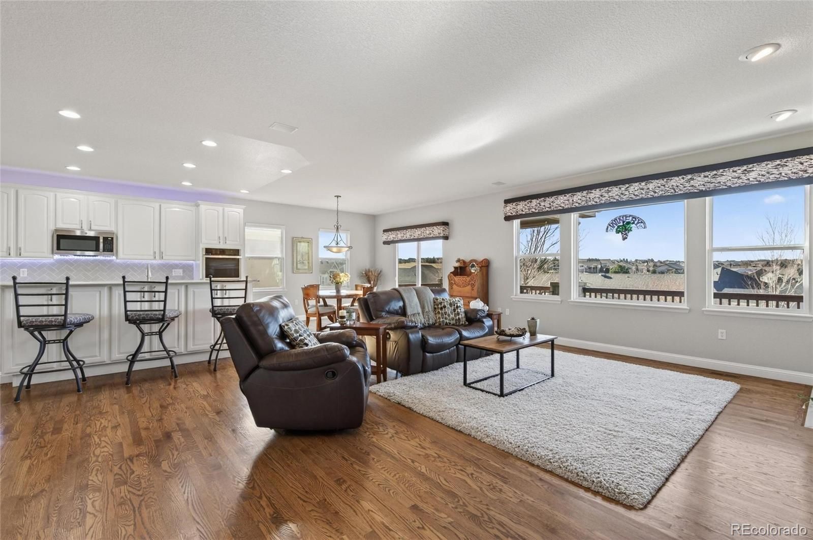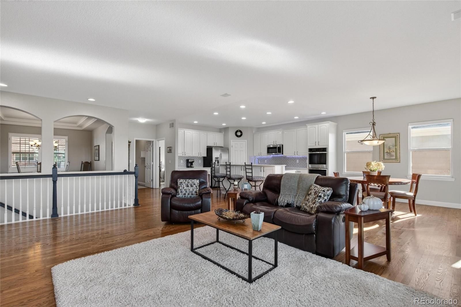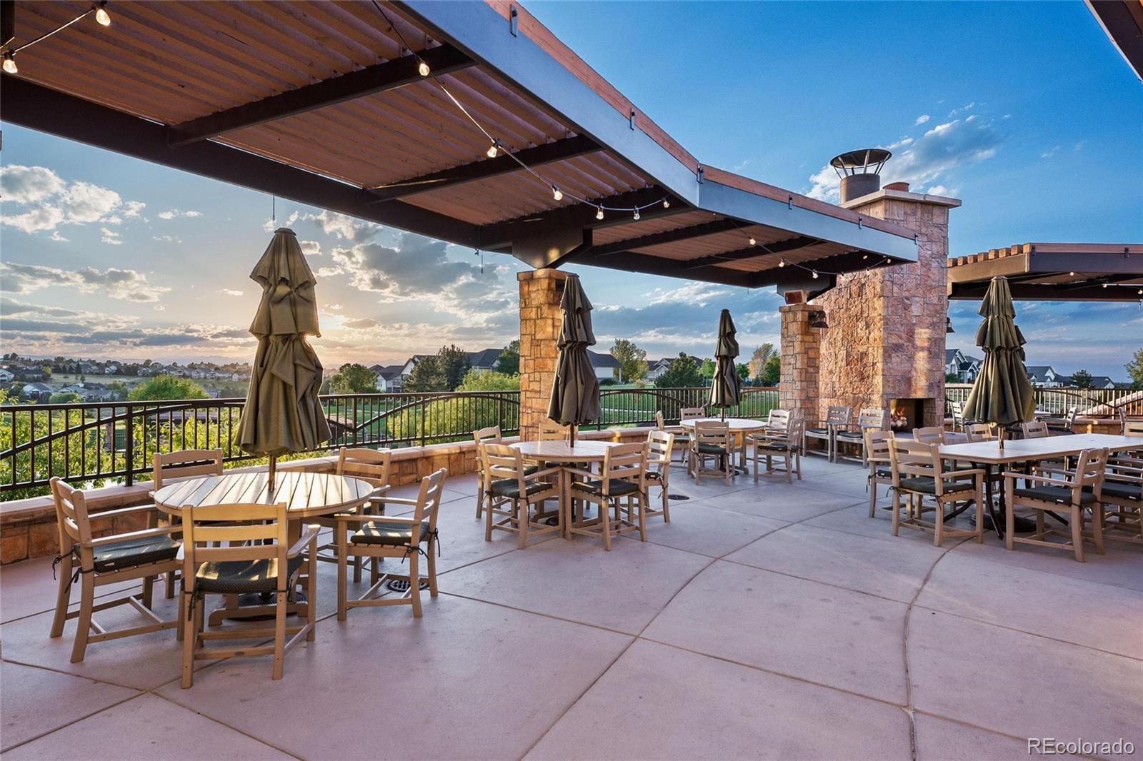 Don't miss the opportunity to own one of the finest ranch style homes located in Heritage Eagle Bend! Pride of ownership is evident throughout this exceptional property. Welcome to this stunning home featuring three bedrooms, three bathrooms, and an office. This residence is perfect for entertaining. The open floor plan is flooded with natural sunlight, thanks to numerous windows. Enjoy the beautiful Colorado sunsets from the spacious, partially covered, back deck. The great room is equipped with remote control blinds which adds convenience and sophistication, gas log fireplace, built-ins, and hardwood floors. The remodeled kitchen is a chef's dream, boasting new SS appliances, a gas range cooktop, double ovens, microwave, dishwasher, refrigerator, updated countertops, an abundance of cabinetry, stylish tiled backsplash, walk-in pantry, large island, and fun ambient lighting above and below the cabinetry. The kitchen also offers a large eating space. The formal dining area is ideal for hosting, featuring tray, ceilings, plantation shutters, and an open flow. The primary bedroom is a true retreat with double doors, tray ceilings, a ceiling fan, plantation shutters, newer carpet, fresh paint, and a remodeled en-suite bathroom offering large walk-in shower and a walk-in closet. The partially finished walkout basement includes a large family/rec room, nice patio, spacious bedroom, walk-in closet, full bath, plenty of sunlight, and huge storage room. Recent upgrades include a newer roof, newer furnace and air conditioning (2023). There is also a water softener. Gleaming hardwood floors, newer carpeting, fresh paint inside and out. Refinished and stained back deck, create an inviting and revitalized atmosphere. Oversized two car garage with an additional space for your golf cart. Once again - Pride of ownership is evident throughout this exceptional property.
