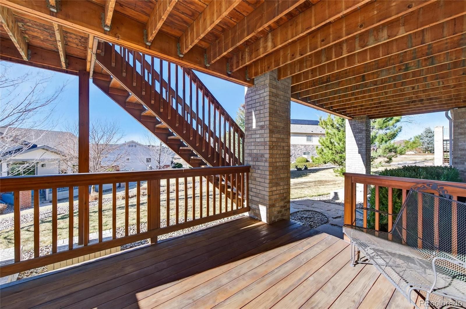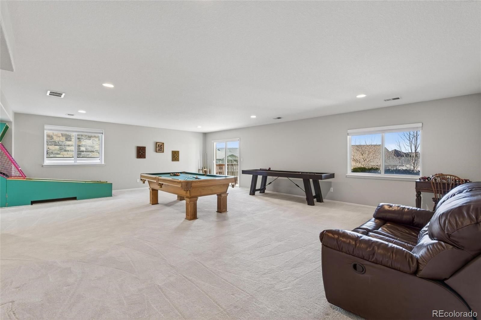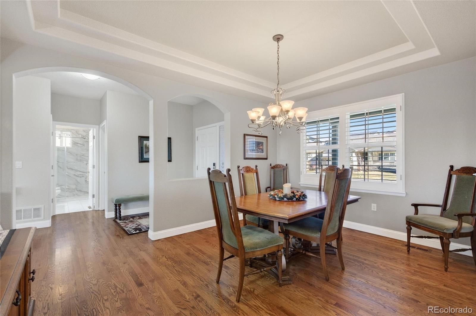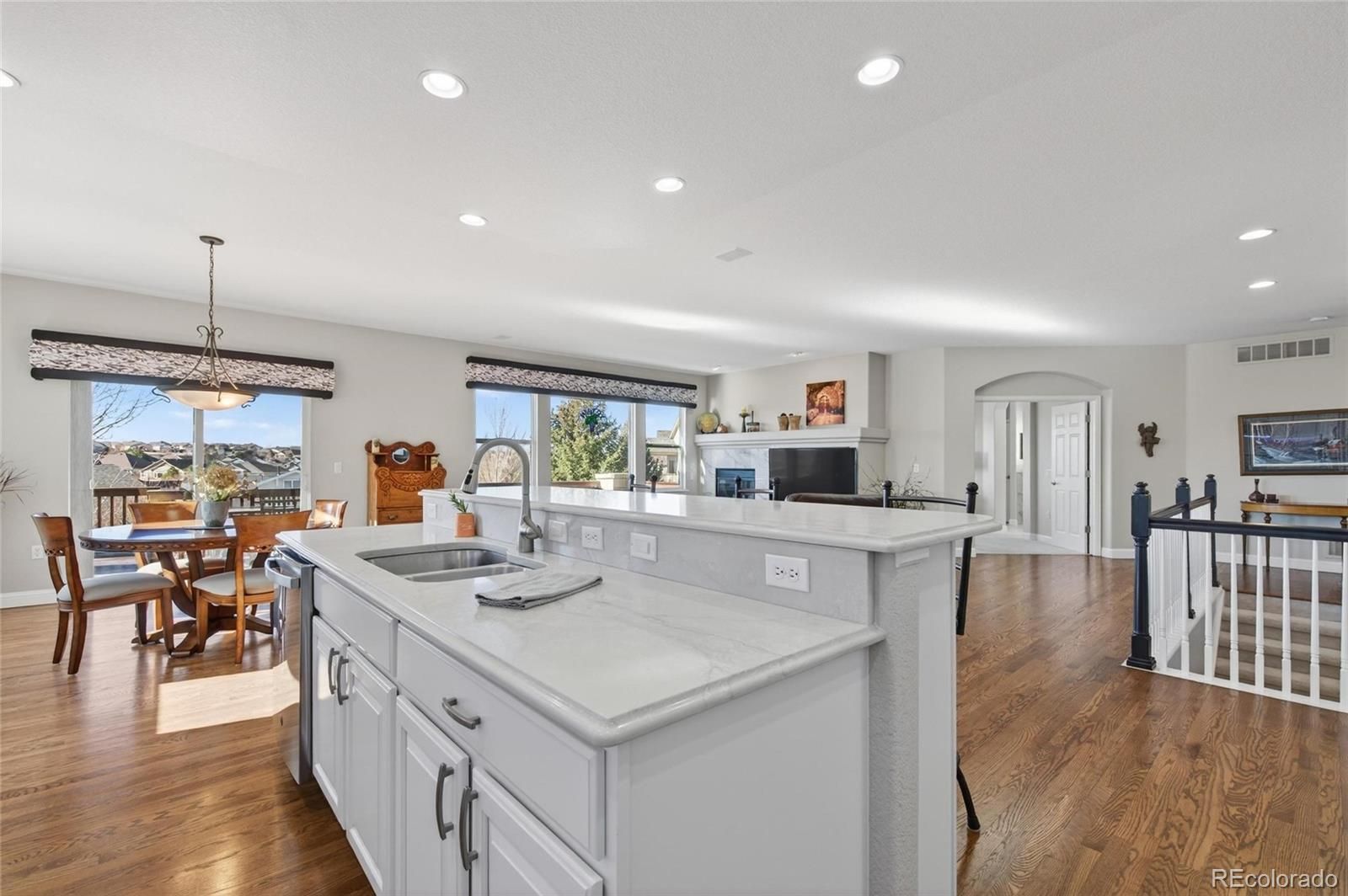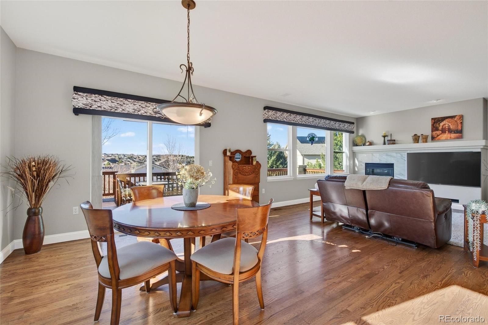 Don't miss the opportunity to own one of the finest ranch style homes located in Heritage Eagle Bend! Pride of ownership is evident throughout this exceptional property. Welcome to this stunning home featuring three bedrooms, three bathrooms, and an office. This residence is perfect for entertaining. The open floor plan is flooded with natural sunlight, thanks to numerous windows. Enjoy the beautiful Colorado sunsets from the spacious, partially covered, back deck. The great room is equipped with remote control blinds which adds convenience and sophistication, gas log fireplace, built-ins, and hardwood floors. The remodeled kitchen is a chef's dream, boasting new SS appliances, a gas range cooktop, double ovens, microwave, dishwasher, refrigerator, updated countertops, an abundance of cabinetry, stylish tiled backsplash, walk-in pantry, large island, and fun ambient lighting above and below the cabinetry. The kitchen also offers a large eating space. The formal dining area is ideal for hosting, featuring tray, ceilings, plantation shutters, and an open flow. The primary bedroom is a true retreat with double doors, tray ceilings, a ceiling fan, plantation shutters, newer carpet, fresh paint, and a remodeled en-suite bathroom offering large walk-in shower and a walk-in closet. The partially finished walkout basement includes a large family/rec room, nice patio, spacious bedroom, walk-in closet, full bath, plenty of sunlight, and huge storage room. Recent upgrades include a newer roof, newer furnace and air conditioning (2023). There is also a water softener. Gleaming hardwood floors, newer carpeting, fresh paint inside and out. Refinished and stained back deck, create an inviting and revitalized atmosphere. Oversized two car garage with an additional space for your golf cart. Once again - Pride of ownership is evident throughout this exceptional property.