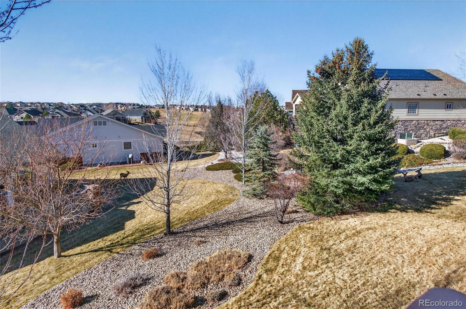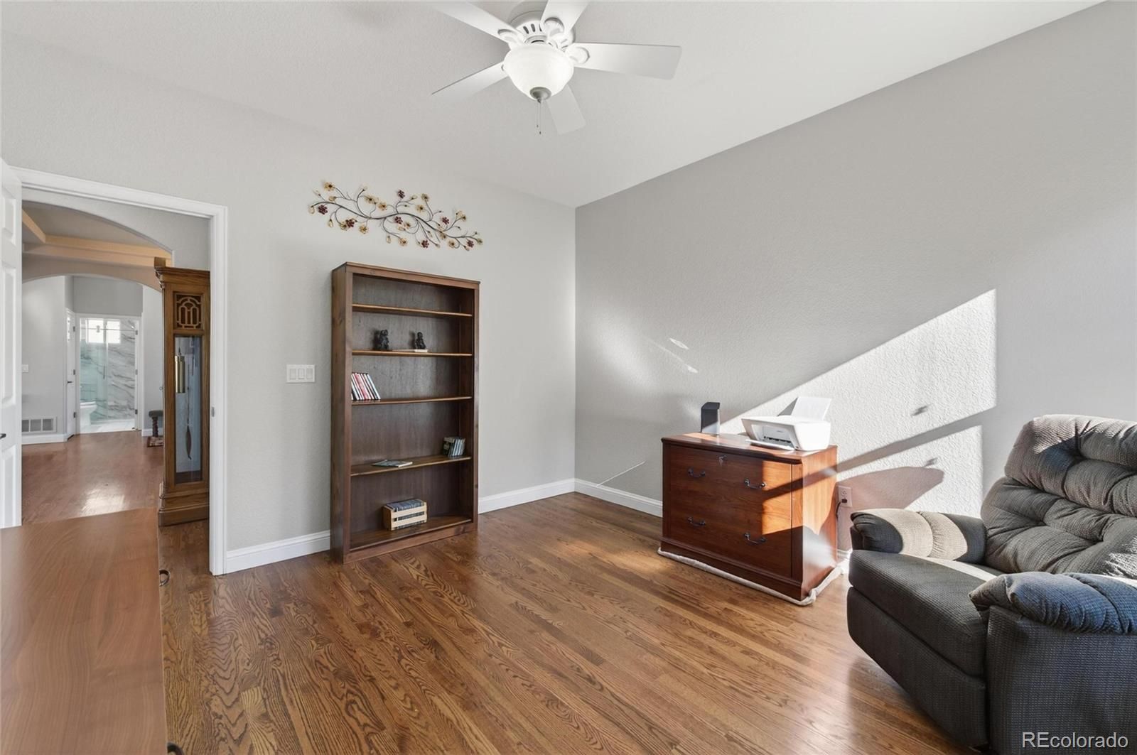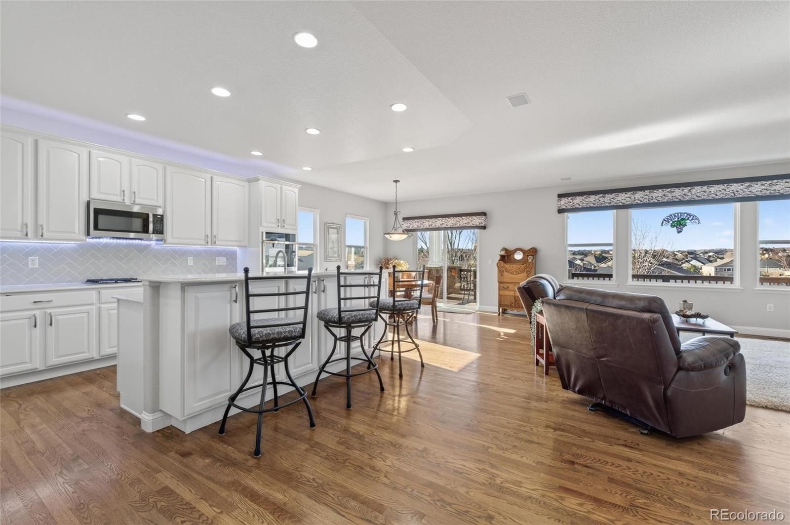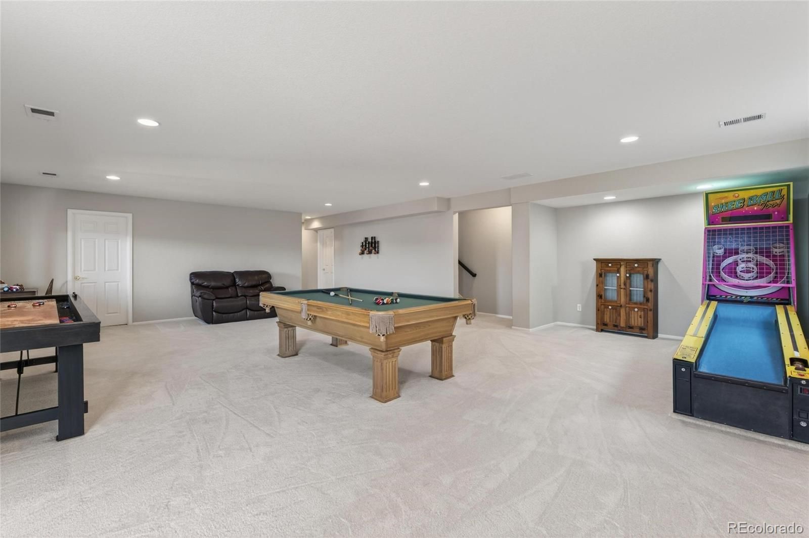 Don't miss the opportunity to own one of the finest ranch style homes located in Heritage Eagle Bend! Pride of ownership is evident throughout this exceptional property. Welcome to this stunning home featuring three bedrooms, three bathrooms, and an office. This residence is perfect for entertaining. The open floor plan is flooded with natural sunlight, thanks to numerous windows. Enjoy the beautiful Colorado sunsets from the spacious, partially covered, back deck. The great room is equipped with remote control blinds which adds convenience and sophistication, gas log fireplace, built-ins, and hardwood floors. The remodeled kitchen is a chef's dream, boasting new SS appliances, a gas range cooktop, double ovens, microwave, dishwasher, refrigerator, updated countertops, an abundance of cabinetry, stylish tiled backsplash, walk-in pantry, large island, and fun ambient lighting above and below the cabinetry. The kitchen also offers a large eating space. The formal dining area is ideal for hosting, featuring tray, ceilings, plantation shutters, and an open flow. The primary bedroom is a true retreat with double doors, tray ceilings, a ceiling fan, plantation shutters, newer carpet, fresh paint, and a remodeled en-suite bathroom offering large walk-in shower and a walk-in closet. The partially finished walkout basement includes a large family/rec room, nice patio, spacious bedroom, walk-in closet, full bath, plenty of sunlight, and huge storage room. Recent upgrades include a newer roof, newer furnace and air conditioning (2023). There is also a water softener. Gleaming hardwood floors, newer carpeting, fresh paint inside and out. Refinished and stained back deck, create an inviting and revitalized atmosphere. Oversized two car garage with an additional space for your golf cart. Once again - Pride of ownership is evident throughout this exceptional property.