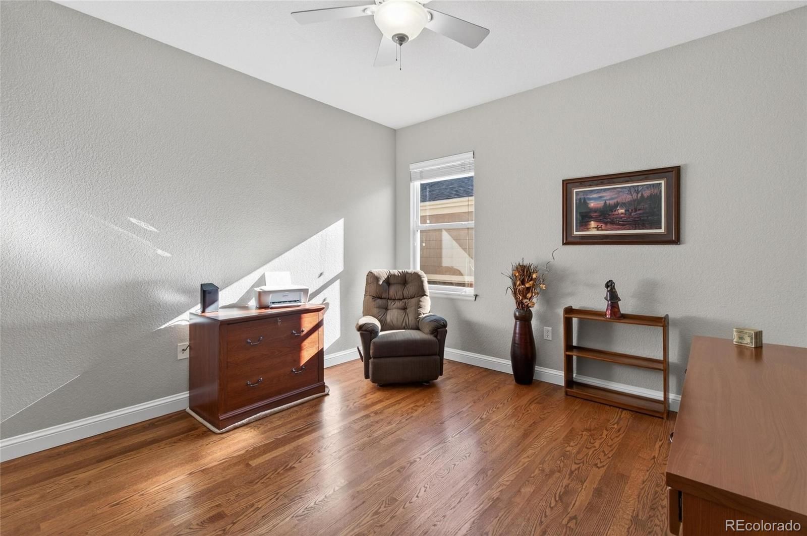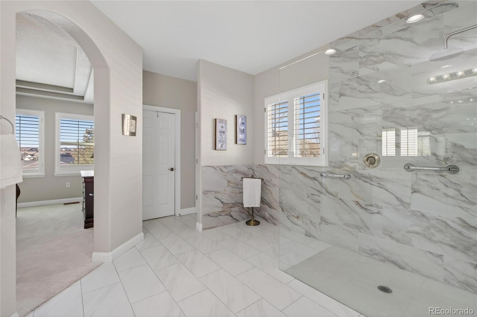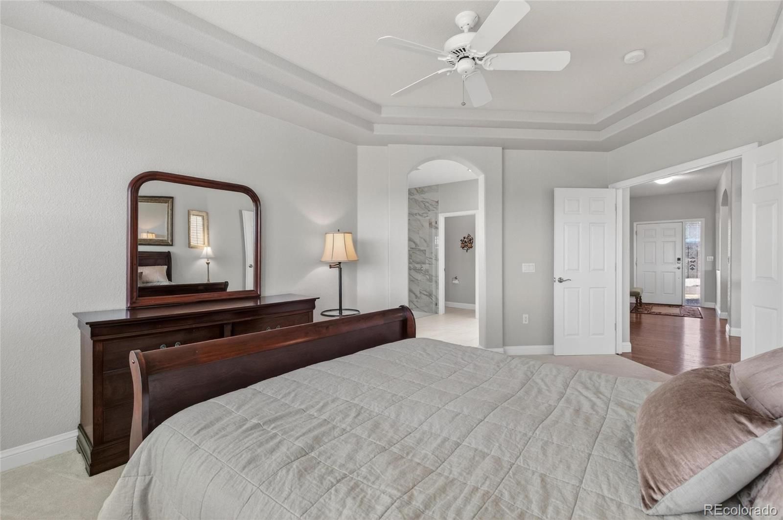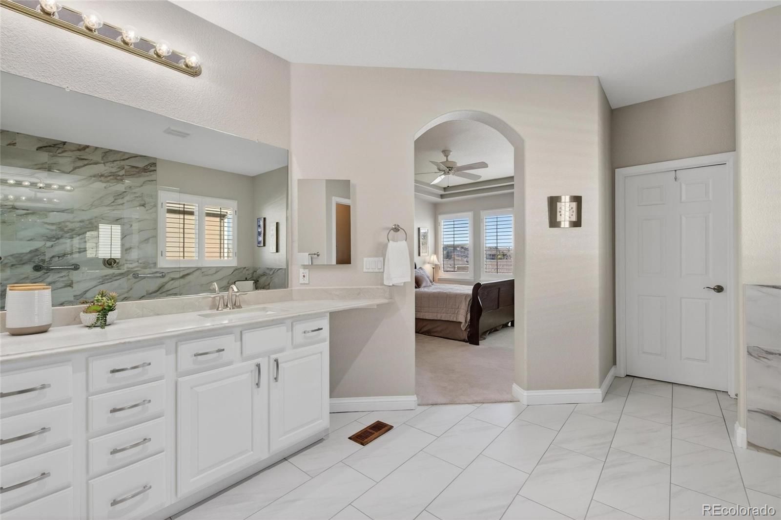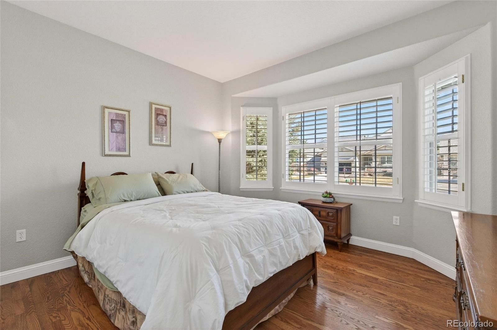Don't miss the opportunity to own one of the finest ranch style homes located in Heritage Eagle Bend! Pride of ownership is evident throughout this exceptional property. Welcome to this stunning home featuring three bedrooms, three bathrooms, and an office. This residence is perfect for entertaining. The open floor plan is flooded with natural sunlight, thanks to numerous windows. Enjoy the beautiful Colorado sunsets from the spacious, partially covered, back deck. The great room is equipped with remote control blinds which adds convenience and sophistication, gas log fireplace, built-ins, and hardwood floors. The remodeled kitchen is a chef's dream, boasting new SS appliances, a gas range cooktop, double ovens, microwave, dishwasher, refrigerator, updated countertops, an abundance of cabinetry, stylish tiled backsplash, walk-in pantry, large island, and fun ambient lighting above and below the cabinetry. The kitchen also offers a large eating space. The formal dining area is ideal for hosting, featuring tray, ceilings, plantation shutters, and an open flow. The primary bedroom is a true retreat with double doors, tray ceilings, a ceiling fan, plantation shutters, newer carpet, fresh paint, and a remodeled en-suite bathroom offering large walk-in shower and a walk-in closet. The partially finished walkout basement includes a large family/rec room, nice patio, spacious bedroom, walk-in closet, full bath, plenty of sunlight, and huge storage room. Recent upgrades include a newer roof, newer furnace and air conditioning (2023). There is also a water softener. Gleaming hardwood floors, newer carpeting, fresh paint inside and out. Refinished and stained back deck, create an inviting and revitalized atmosphere. Oversized two car garage with an additional space for your golf cart. Once again - Pride of ownership is evident throughout this exceptional property.