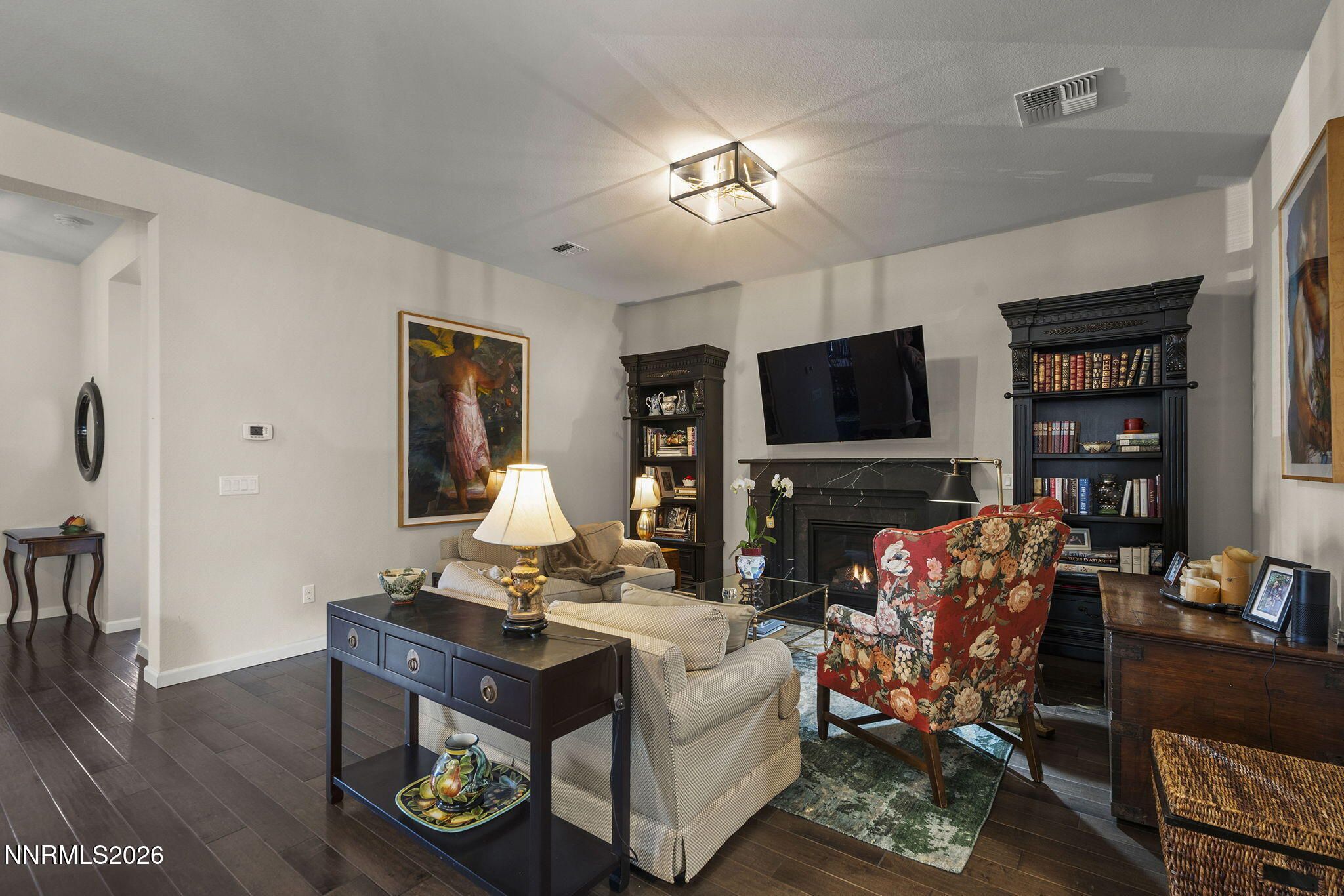 Beautifully appointed 3-bedroom, 3-bath residence showcasing refined finishes and an exceptional open-concept design. High ceilings, warm designer tones, upgraded wood flooring, and an elegant custom marble fireplace mantle create a sophisticated yet inviting atmosphere. The chef-inspired kitchen features upgraded quartz counters and cabinetry, a large island with seating, and seamless flow into the main living and dining areas—ideal for both entertaining and everyday comfort. Separate laundry room with abundant storage. Spacious secondary bedroom with a full bath and walk-in closet, a private third guest bedroom at the front of the home, and a separate formal dining room. Plantation shutters and upgraded window shades throughout enhance both style and function. Enjoy a cool, east-facing backyard with tranquil fountain, covered patio with ceiling fan, and expansive sliding doors from the kitchen for effortless indoor/outdoor living. Located in the desirable 55+ Carmella Ranch community offering clubhouse, resort-style pool, fitness center, and vibrant activities including pickleball. Convenient to shopping with picturesque Mt. Rose views throughout the neighborhood. Truly exceptional.