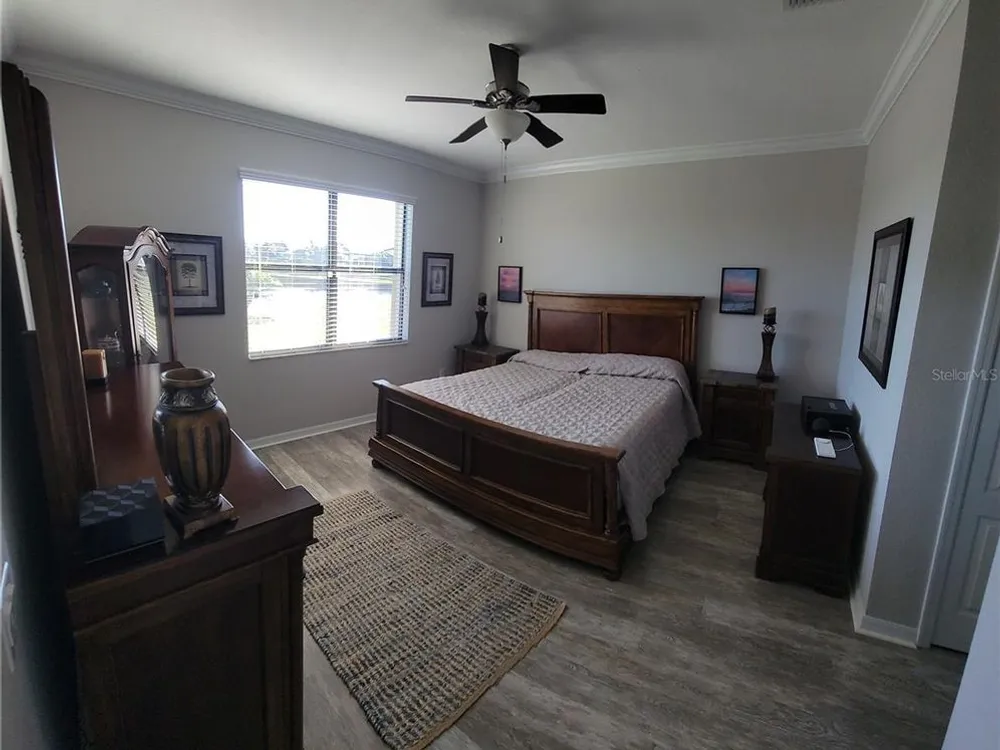 - Ceiling Fan(s), Crown Molding, Eat-in Kitchen, In-Wall Pest Control, Main Level Primary, Solid Surface Counters, Solid-Wood Cabinets, Stone Counters, Thermostat, Window Treatments