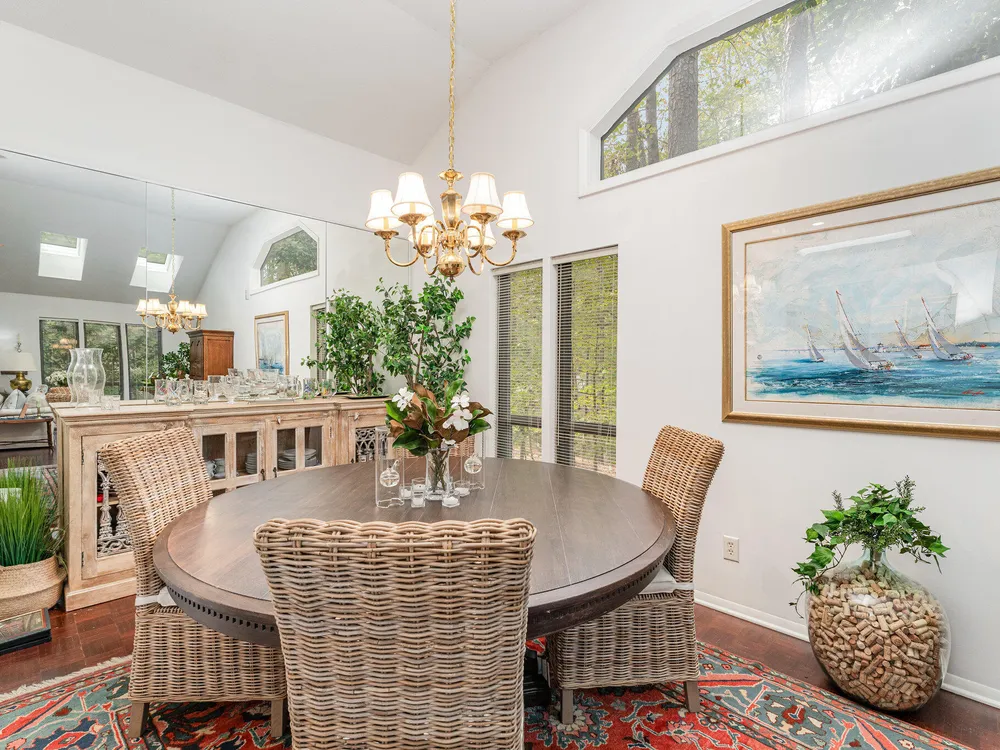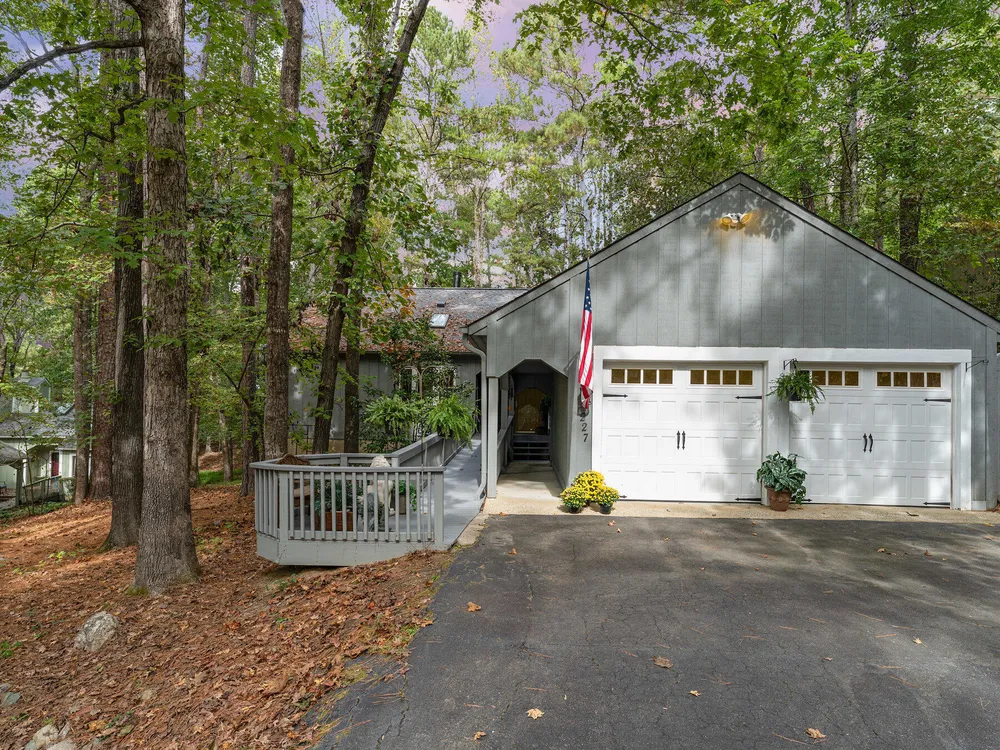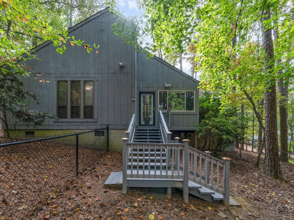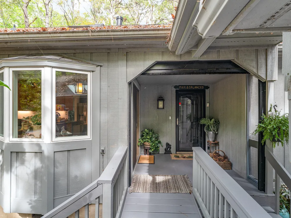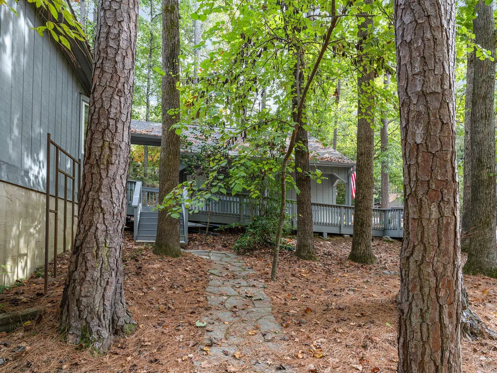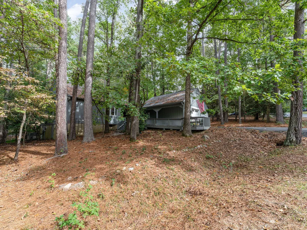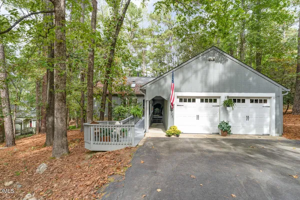 One-level contemporary home in the Fearrington Historic District! This home features an entry foyer that opens to a large living room with high ceilings, built-ins, a gas fireplace, and many windows with lovely, wooded views. There is a formal dining area plus a breakfast nook with a bay window in the kitchen. The spacious kitchen features an island and good counter and cabinet space. A laundry room with a freezer adjoins the kitchen. The primary bedroom has good closet space and a beautifully updated private bath with a tile shower. There are two additional bedrooms and another full bathroom. The sunroom has two walls with windows and a door that opens to a fenced area in the back yard. A covered walkway leads to the two-car garage with a storage room, workbench, skylight, and updated lighting. The covered front porch has phantom screen. Brick patio. Generator. Quiet, low-traffic cul-de-sac that is convenient to the village shops and swim club.