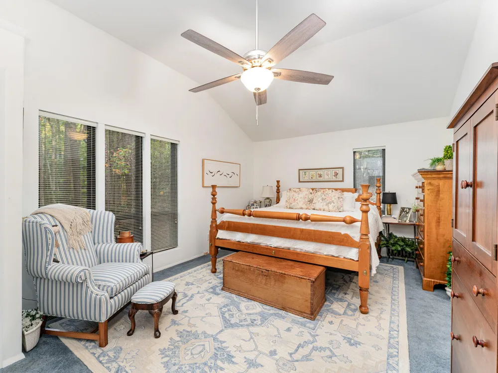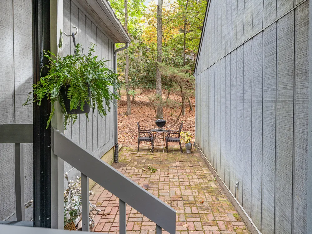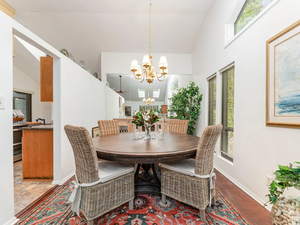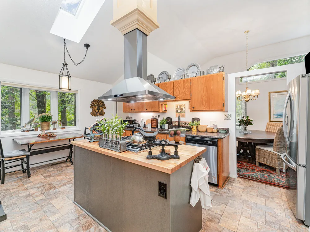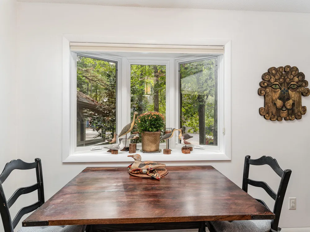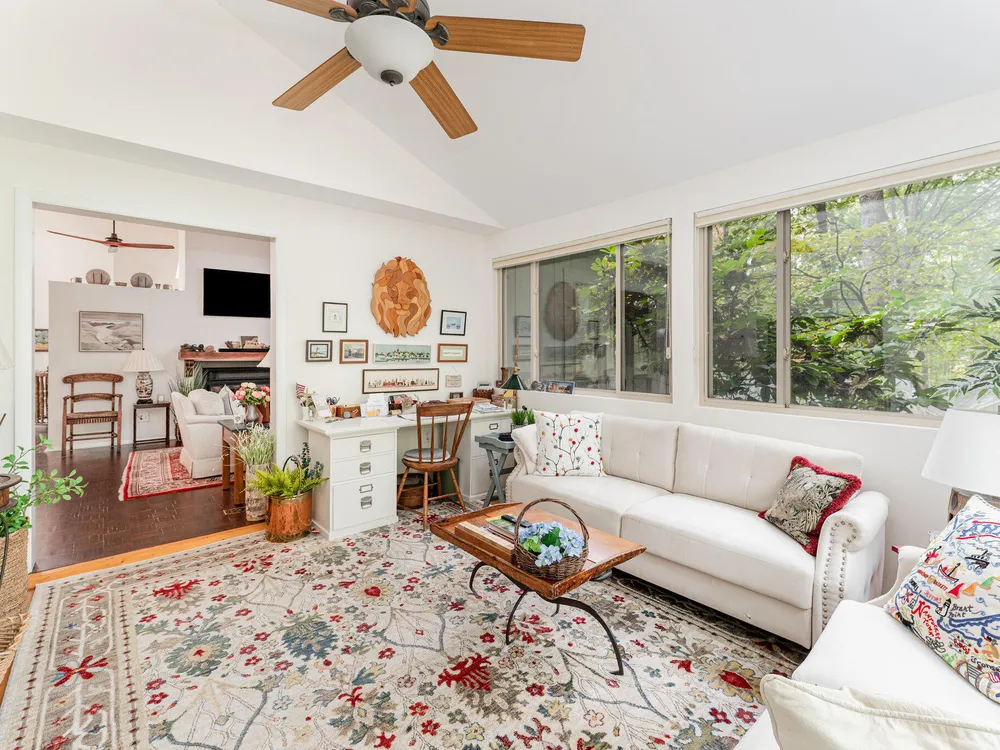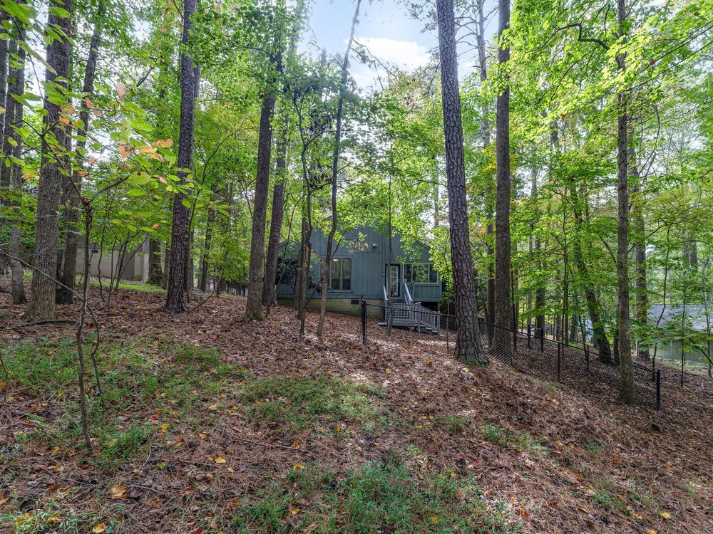 One-level contemporary home in the Fearrington Historic District! This home features an entry foyer that opens to a large living room with high ceilings, built-ins, a gas fireplace, and many windows with lovely, wooded views. There is a formal dining area plus a breakfast nook with a bay window in the kitchen. The spacious kitchen features an island and good counter and cabinet space. A laundry room with a freezer adjoins the kitchen. The primary bedroom has good closet space and a beautifully updated private bath with a tile shower. There are two additional bedrooms and another full bathroom. The sunroom has two walls with windows and a door that opens to a fenced area in the back yard. A covered walkway leads to the two-car garage with a storage room, workbench, skylight, and updated lighting. The covered front porch has phantom screen. Brick patio. Generator. Quiet, low-traffic cul-de-sac that is convenient to the village shops and swim club.
